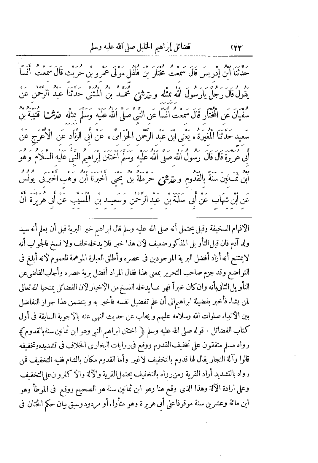 [2370] (اختتن ابراهيم النبي وهو بن ثَمَانِينَ سَنَةٍ بِالْقَدُومِ) رُوَاةُ مُسْلِمٍ مُتَّفِقُونَ عَلَى تَخْفِيفِ الْقَدُومِ وَوَقَعَ فِي رِوَايَاتِ الْبُخَارِيِّ الْخِلَافُ فِي تَشْدِيدِهِ وَتَخْفِيفِهِ قَالُوا وَآلَةُ النَّجَّارِ يُقَالُ لَهَا قَدُومٌ بِالتَّخْفِيفِ لَا غَيْرُ وَأَمَّا الْقَدُومُ مَكَانٌ بِالشَّامِّ فَفِيهِ التَّخْفِيفُ فَمَنْ رَوَاهُ بِالتَّشْدِيدِ اراد القرية ومن رواه بالتخفيف يحتمل الْقَرْيَةُ وَالْآلَةُ وَالْأَكْثَرُونَ عَلَى التَّخْفِيفِ وَعَلَى إِرَادَةِ الآلة وهذا الذي وقع هنا وهو بن ثمانين سنة هوالصحيح ووقع في الموطأ وهو بن مِائَةٍ وَعِشْرِينَ سَنَةً مَوْقُوفًا عَلَى أَبِي هُرَيْرَةَ وهو متأول اومردود وَسَبَقَ بَيَانُ حُكْمِ الْخِتَانِ فِي