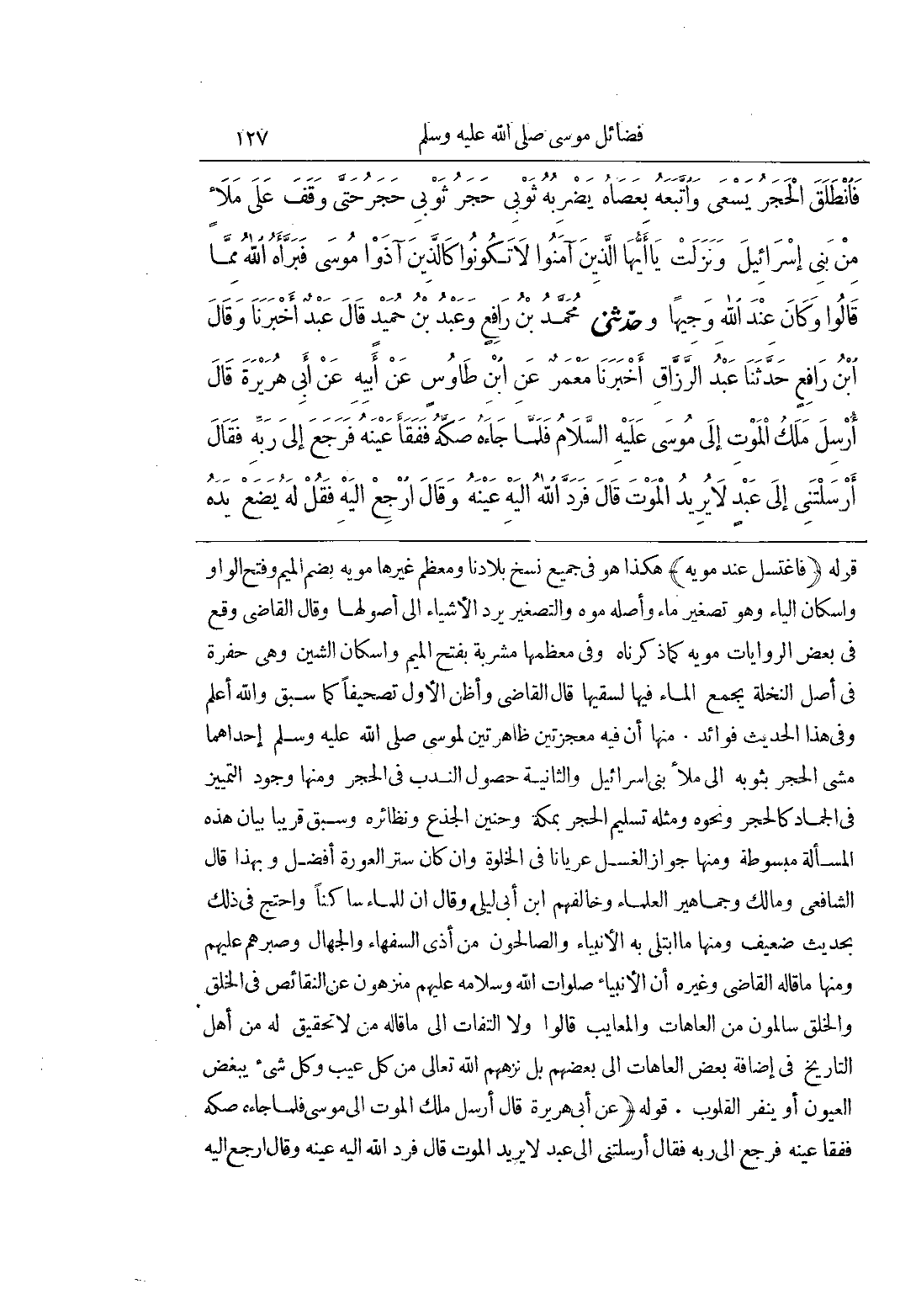 قوله (فاغتسل عند مويه) وَهَكَذَا هُوَ فِي جَمِيعِ نُسَخِ بِلَادِنَا وَمُعْظَمِ غَيْرِهَا مُوَيْهٍ بِضَمِّ الْمِيمِ وَفَتْحِ الْوَاوِ وَإِسْكَانِ الْيَاءِ وَهُوَ تَصْغِيرُ مَاءٍ وَأَصْلُهُ مَوْهٌ وَالتَّصْغِيرُ يَرُدُّ الْأَشْيَاءَ إِلَى أُصُولِهَا وَقَالَ الْقَاضِي وَقَعَ فِي بَعْضِ الرِّوَايَاتِ مُوَيْهٍ كَمَا ذَكَرْنَاهُ وَفِي مُعْظَمِهَا مَشْرَبَةٌ بِفَتْحِ الْمِيمِ وَإِسْكَانِ الشِّينِ وَهِيَ حُفْرَةٌ فِي أَصْلِ النَّخْلَةِ يُجْمَعُ الْمَاءُ فِيهَا لِسَقْيِهَا قَالَ الْقَاضِي وَأَظُنُّ الْأَوَّلَ تَصْحِيفًا كَمَا سَبَقَ وَاللَّهُ أَعْلَمُ وَفِي هَذَا الْحَدِيثِ فَوَائِدُ مِنْهَا أَنَّ فِيهِ مُعْجِزَتَيْنِ ظَاهِرَتَيْنِ لِمُوسَى صَلَّى اللَّهُ عَلَيْهِ وَسَلَّمَ إِحْدَاهُمَا مَشْيُ الْحَجْرِ بِثَوْبِهِ إِلَى مَلَأِ بَنِي إِسْرَائِيلَ وَالثَّانِيَةُ حُصُولُ النَّدَبِ فِي الْحَجَرِ وَمِنْهَا وُجُودُ التَّمْيِيزِ فِي الْجَمَادِ كَالْحَجَرِ وَنَحْوِهِ وَمِثْلُهُ تَسْلِيمُ الْحَجَرِ بِمَكَّةَ وَحَنِينُ الْجِذْعِ وَنَظَائِرُهُ وَسَبَقَ قَرِيبًا بَيَانُ هَذِهِ الْمَسْأَلَةِ مَبْسُوطَةً وَمِنْهَا جَوَازُ الْغُسْلِ عُرْيَانًا فِي الْخَلْوَةٍ وَإِنْ كَانَ سَتْرُ الْعَوْرَةِ أَفْضَلَ وَبِهَذَا قَالَ الشَّافِعِيُّ ومالك وجماهير العلماء وخالفهم بن أَبِي لَيْلَى وَقَالَ إِنَّ لِلْمَاءِ سَاكِنًا وَاحْتَجَّ فِي ذَلِكَ بِحَدِيثٍ ضَعِيفٍ وَمِنْهَا مَا ابْتُلِيَ بِهِ الْأَنْبِيَاءُ وَالصَّالِحُونَ مِنْ أَذَى السُّفَهَاءِ وَالْجُهَّالِ وَصَبْرِهِمْ عَلَيْهِمْ وَمِنْهَا مَا قَالَهُ الْقَاضِي وَغَيْرُهُ ان الانبياء صلوات الله وسلامه عليهم وسلامه مُنَزَّهُونَ عَنِ النَّقَائِصِ فِي الْخَلْقِ وَالْخُلُقِ سَالِمُونَ مِنَ الْعَاهَاتِ وَالْمَعَايِبِ قَالُوا وَلَا الْتِفَاتَ إِلَى مَا قَالَهُ مَنْ لَا تَحْقِيقَ لَهُ مِنْ أَهْلِ التَّارِيخِ فِي إِضَافَةِ بَعْضِ الْعَاهَاتِ إِلَى بَعْضِهِمْ بَلْ نَزَّهَهُمُ اللَّهُ تَعَالَى مِنْ كُلِّ عيب وكل شئ يُبَغِّضُ الْعُيُونَ أَوْ يُنَفِّرُ الْقُلُوبَ قَوْلُهُ