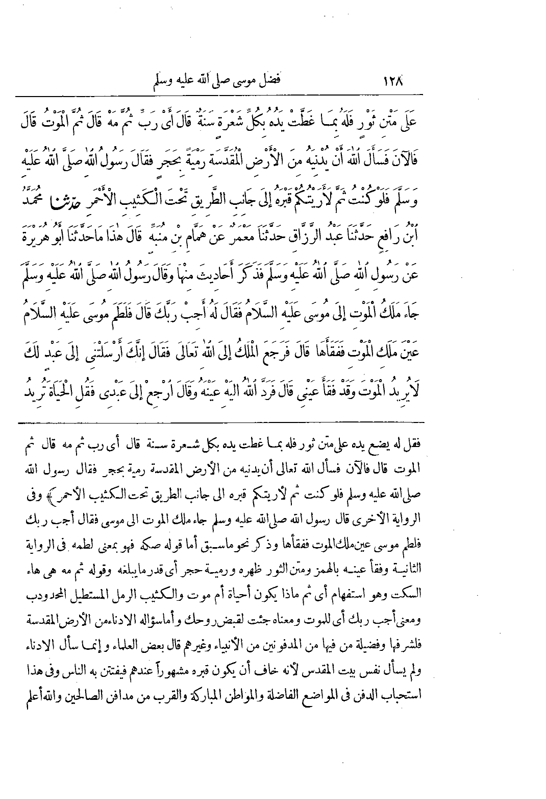 فَقُلْ لَهُ يَضَعُ يَدَهُ عَلَى مَتْنِ ثَوْرٍ فَلَهُ بِمَا غَطَّتْ يَدُهُ بِكُلِّ شَعْرَةٍ سَنَةٌ قَالَ أَيْ رَبِّ ثُمَّ مَهْ قَالَ ثُمَّ الْمَوْتُ قَالَ فَالْآنَ فَسَأَلَ اللَّهَ تَعَالَى أَنْ يُدْنِيَهُ مِنَ الْأَرْضِ الْمُقَدَّسَةِ رَمْيَةً بِحَجَرٍ فَقَالَ رَسُولُ اللَّهِ صَلَّى اللَّهُ عَلَيْهِ وَسَلَّمَ فَلَوْ كُنْتُ ثَمَّ لَأَرَيْتُكُمْ قَبْرَهُ إِلَى جَانِبِ الطَّرِيقِ تَحْتَ الْكَثِيبِ الْأَحْمَرِ) وَفِي الرِّوَايَةِ الْأُخْرَى قَالَ رَسُولُ اللَّهِ صَلَّى اللَّهُ عَلَيْهِ وَسَلَّمَ جَاءَ مَلَكُ الْمَوْتِ إِلَى مُوسَى فَقَالَ أَجِبْ رَبَّكَ فَلَطَمَ مُوسَى عَيْنَ مَلَكِ الْمَوْتِ فَفَقَأَهَا وَذَكَرَ نَحْوَ مَا سَبَقَ أَمَّا قَوْلُهُ صَكَّهُ فَهُوَ بِمَعْنَى لَطَمَهُ فِي الرِّوَايَةِ الثَّانِيَةِ وَفَقَأَ عَيْنَهُ بِالْهَمْزِ وَمَتْنُ الثَّوْرِ ظَهْرُهُ وَرَمْيَةُ حَجَرٍ أَيْ قَدْرَ مَا يَبْلُغُهُ وَقَوْلُهُ ثَمَّ مَهْ هِيَ هَاءُ السَّكْتِ وَهُوَ اسْتِفْهَامٌ أَيْ ثُمَّ مَاذَا يَكُونُ أَحَيَاةٌ أَمْ مَوْتٌ وَالْكَثِيبُ الرَّمَلُ الْمُسْتَطِيلُ المحدودب ومعنى اجب ربك اي الموت ومعناه جئت لقبض روحك وَأَمَّا سُؤَالُهُ الْإِدْنَاءَ مِنَ الْأَرْضِ الْمُقَدَّسَةِ فَلِشَرَفِهَا وَفَضِيلَةِ مَنْ فِيهَا مِنَ الْمَدْفُونِينَ مِنَ الْأَنْبِيَاءِ وَغَيْرِهِمْ قَالَ بَعْضُ الْعُلَمَاءِ وَإِنَّمَا سَأَلَ الْإِدْنَاءَ وَلَمْ يَسْأَلْ نَفْسَ بَيْتِ الْمَقْدِسِ لِأَنَّهُ خَافَ أَنْ يَكُونَ قَبْرُهُ مَشْهُورًا عِنْدَهُمْ فَيَفْتَتِنَ بِهِ النَّاسُ وَفِي هَذَا اسْتِحْبَابُ الدَّفْنِ فِي الْمَوَاضِعِ الْفَاضِلَةِ وَالْمَوَاطِنِ الْمُبَارَكَةِ وَالْقُرْبِ مِنْ مَدَافِنِ الصَّالِحِينَ والله اعلم