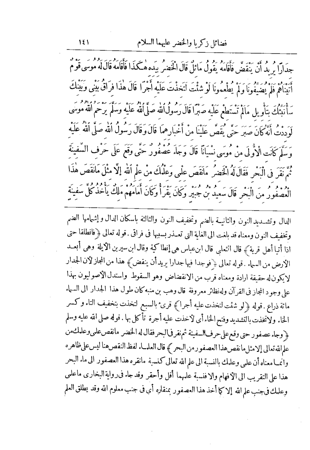 وَتَشْدِيدِ النُّونِ وَالثَّانِيَةُ بِالضَّمِّ وَتَخْفِيفِ النُّونِ وَالثَّالِثَةُ بِإِسْكَانِ الدَّالِ وَإِشْمَامِهَا الضَّمَّ وَتَخْفِيفِ النُّونِ وَمَعْنَاهُ قَدْ بَلَغْتَ إِلَى الْغَايَةِ الَّتِي تُعْذَرُ بِسَبَبِهَا فِي فِرَاقِي قَوْلُهُ تَعَالَى فَانْطَلَقَا حَتَّى إِذَا اتيا اهل قرية قال الثعلبي قال بن عباس هي انطاكية وقال بن سِيرِينَ الْأَيْلَةُ وَهِيَ أَبْعَدُ الْأَرْضِ مِنَ السَّمَاءِ قَوْلُهُ تَعَالَى فَوَجَدَا فِيهَا جِدَارًا يُرِيدُ أَنْ ينقض هَذَا مِنَ الْمَجَازِ لِأَنَّ الْجِدَارَ لَا يَكُونُ لَهُ حَقِيقَةُ إِرَادَةٍ وَمَعْنَاهُ قَرُبَ مِنَ الِانْقِضَاضِ وَهُوَ السُّقُوطُ وَاسْتَدَلَّ الْأُصُولِيُّونَ بِهَذَا عَلَى وُجُودِ الْمَجَازِ فِي الْقُرْآنِ وَلَهُ نَظَائِرُ مَعْرُوفَةٌ قَالَ وَهْبُ بْنُ مُنَبِّهٍ كَانَ طُولُ هَذَا الْجِدَارِ إِلَى السَّمَاءِ مِائَةَ ذِرَاعٍ قَوْلُهُ لَوْ شِئْتَ لتخذت عليه اجرا قُرِئَ بِالسَّبْعِ لَتَخِذْتَ بِتَخْفِيفِ التَّاءِ وَكَسْرِ الْخَاءِ وَلَاتَّخَذْتَ بِالتَّشْدِيدِ وَفَتْحِ الْخَاءِ أَيْ لَأَخَذْتَ عَلَيْهِ أُجْرَةً تَأْكُلُ بِهَا قَوْلُهُ صَلَّى اللَّهُ عَلَيْهِ وَسَلَّمَ (وَجَاءَ عُصْفُورٌ حَتَّى وَقَعَ عَلَى حَرْفِ السَّفِينَةِ ثُمَّ نَقَرَ فِي الْبَحْرِ فَقَالَ لَهُ الْخَضِرُ مَا نَقَصَ عِلْمِي وَعِلْمُكَ مِنْ عِلْمِ اللَّهِ تَعَالَى إِلَّا مِثْلَ مَا نَقَصَ هَذَا الْعُصْفُورُ مِنَ الْبَحْرِ) قَالَ الْعُلَمَاءُ لَفْظُ النَّقْصِ هُنَا لَيْسَ عَلَى ظَاهِرِهِ وَإِنَّمَا مَعْنَاهُ أَنَّ عِلْمِي وَعِلْمُكُ بِالنِّسْبَةِ إِلَى عِلْمِ اللَّهِ تَعَالَى كَنِسْبَةِ مَا نَقَرَهُ هَذَا الْعُصْفُورُ إِلَى مَاءِ الْبَحْرِ هَذَا عَلَى التَّقْرِيبِ إِلَى الْأَفْهَامِ وَإِلَّا فَنِسْبَةُ عِلْمِهِمَا أَقَلُّ وَأَحْقَرُ وَقَدْ جَاءَ فِي رِوَايَةِ الْبُخَارِيِّ مَا عِلْمِي وَعِلْمُكَ فِي جَنْبِ عِلْمِ اللَّهِ إِلَّا كَمَا أَخَذَ هَذَا الْعُصْفُورُ بِمِنْقَارِهِ أَيْ فِي جَنْبِ مَعْلُومِ اللَّهِ وَقَدْ يطلق العلم
