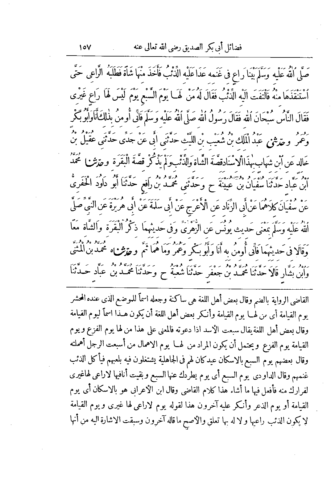 الْقَاضِي الرِّوَايَةُ بِالضَّمِّ وَقَالَ بَعْضُ أَهْلِ اللُّغَةِ هِيَ سَاكِنَةٌ وَجَعْلُهُ اسْمًا لِلْمَوْضِعِ الَّذِي عِنْدَهُ الْمَحْشَرُ يَوْمَ الْقِيَامَةِ أَيْ مَنْ لَهَا يَوْمَ الْقِيَامَةِ وَأَنْكَرَ بَعْضُ أَهْلِ اللُّغَةِ أَنْ يَكُونَ هَذَا اسْمًا لِيَوْمِ الْقِيَامَةِ وَقَالَ بَعْضُ أَهْلِ اللُّغَةِ يُقَالُ سَبَّعْتُ الْأَسَدَ إِذَا دَعَوْتَهُ فَالْمَعْنَى عَلَى هَذَا مَنْ لَهَا يَوْمَ الْفَزَعِ وَيَوْمُ الْقِيَامَةِ يَوْمُ الْفَزَعِ وَيَحْتَمِلُ أَنْ يَكُونَ الْمُرَادُ مَنْ لَهَا يَوْمَ الْإِهْمَالِ مِنْ أَسَبَعْتَ الرَّجُلَ أَهْمَلْتَهُ وَقَالَ بَعْضُهُمْ يَوْمُ السَّبْعِ بِالْإِسْكَانِ عِيدٌ كَانَ لَهُمْ فِي الْجَاهِلِيَّةِ يَشْتَغِلُونَ فِيهِ بِلَعِبِهِمْ فَيَأْكُلُ الذِّئْبُ غَنَمَهُمْ وَقَالَ الدَّاوُدِيُّ يَوْمَ السَّبُعِ أَيْ يَوْمَ يَطْرُدُكَ عَنْهَا السَّبُعُ وَبَقِيتُ أَنَا لها لاراعي لَهَا غَيْرِي لِفِرَارِكَ مِنْهُ فَأَفْعَلُ فِيهَا مَا اشاء هذا كلام القاضي وقال بن الْأَعْرَابِيِّ هُوَ بِالْإِسْكَانِ أَيْ يَوْمُ الْقِيَامَةِ أَوْ يَوْمُ الذُّعْرِ وَأَنْكَرَ عَلَيْهِ آخَرُونَ هَذَا لِقَوْلِهِ يَوْمَ لَا رَاعِيَ لَهَا غَيْرِي وَيَوْمُ الْقِيَامَةِ لَا يَكُونُ الذِّئْبُ رَاعِيهَا وَلَا لَهُ بِهَا تَعَلُّقٌ وَالْأَصَحُّ مَا قَالَهُ آخَرُونَ وَسَبَقَتِ الْإِشَارَةُ إِلَيْهِ مِنْ أَنَّهَا
