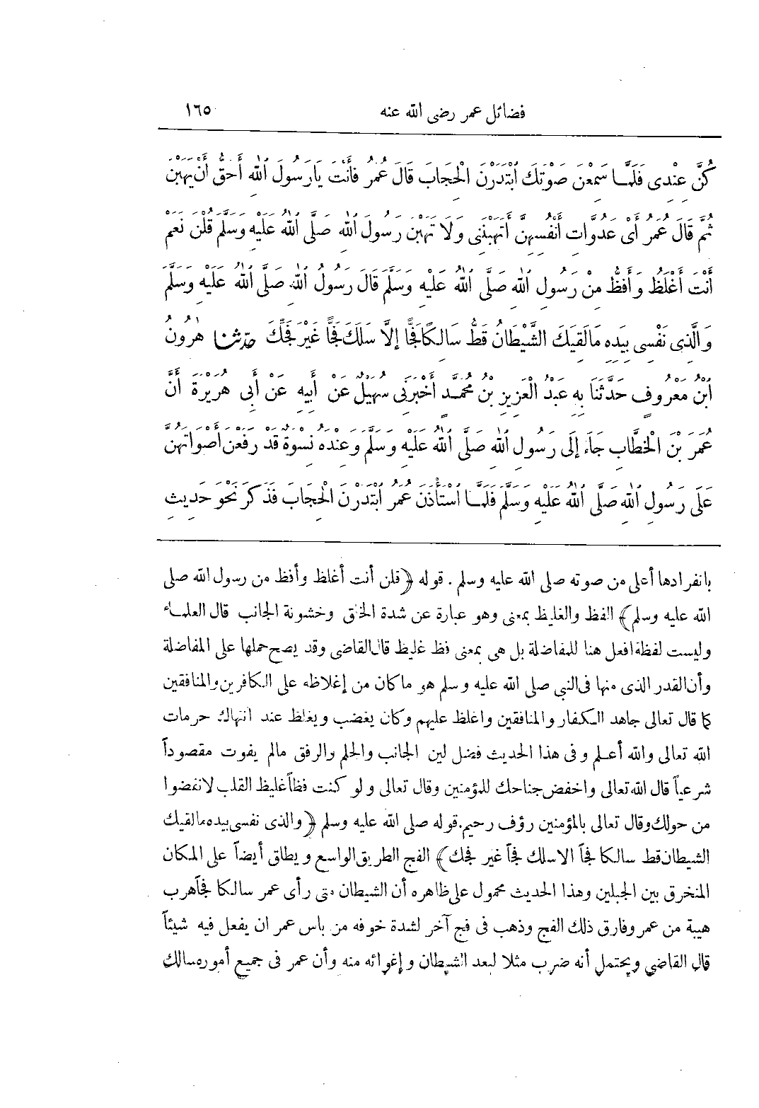 بِانْفِرَادِهَا أَعْلَى مِنْ صَوْتِهِ صَلَّى اللَّهُ عَلَيْهِ وسلم قوله (قلن انت أَغْلَظُ وَأَفَظُّ مِنْ رَسُولِ اللَّهِ صَلَّى اللَّهُ عَلَيْهِ وَسَلَّمَ) الفظ والغليظ بِمَعْنًى وَهُوَ عِبَارَةٌ عَنْ شِدَّةِ الْخُلُقِ وَخُشُونَةِ الْجَانِبِ قَالَ الْعُلَمَاءُ وَلَيْسَتْ لَفْظَةُ أَفْعَلَ هُنَا لِلْمُفَاضَلَةِ بَلْ هِيَ بِمَعْنَى فَظٌّ غَلِيظٌ قَالَ الْقَاضِي وَقَدْ يَصِحُّ حَمْلُهَا عَلَى الْمُفَاضَلَةِ وَأَنَّ الْقَدْرَ الَّذِي مِنْهَا فِي النَّبِيِّ صَلَّى اللَّهُ عَلَيْهِ وَسَلَّمَ هُوَ مَا كَانَ مِنْ إِغْلَاظِهِ عَلَى الْكَافِرِينَ وَالْمُنَافِقِينَ كَمَا قَالَ تَعَالَى جَاهِدِ الكفار والمنافقين واغلظ عليهم وَكَانَ يَغْضَبُ وَيُغْلِظُ عِنْدَ انْتَهَاكِ حُرُمَاتِ اللَّهِ تَعَالَى وَاللَّهُ أَعْلَمُ وَفِي هَذَا الْحَدِيثِ فَضْلُ لين الجانب والحلم والرفق مالم يُفَوِّتْ مَقْصُودًا شَرْعِيًّا قَالَ اللَّهُ تَعَالَى وَاخْفِضْ جناحك للمؤمنين وَقَالَ تَعَالَى وَلَوْ كُنْتَ فَظًّا غَلِيظَ الْقَلْبِ لانفضوا من حولك وقال تعالى بالمؤمنين رؤف رَحِيمٌ قَوْلُهُ صَلَّى اللَّهُ عَلَيْهِ وَسَلَّمَ (وَالَّذِي نَفْسِي بِيَدِهِ مَا لَقِيَكَ الشَّيْطَانُ قَطُّ سَالِكًا فَجًّا إِلَّا سَلَكَ فَجًّا غَيْرَ فَجِّكَ) الْفَجُّ الطَّرِيقُ الْوَاسِعُ وَيُطْلَقُ أَيْضًا عَلَى الْمَكَانِ الْمُنْخَرِقِ بَيْنَ الْجَبَلَيْنِ وَهَذَا الْحَدِيثُ مَحْمُولٌ عَلَى ظَاهِرِهِ أَنَّ الشَّيْطَانَ مَتَى رَأَى عُمَرَ سَالِكًا فَجًّا هَرَبَ هَيْبَةً مِنْ عُمَرَ وَفَارَقَ ذَلِكَ الْفَجَّ وَذَهَبَ فِي فَجٍّ آخَرَ لِشِدَّةِ خَوْفِهِ مِنْ بَأْسِ عُمَرَ أَنْ يَفْعَلَ فِيهِ شَيْئًا قَالَ الْقَاضِي وَيَحْتَمِلُ أَنَّهُ ضَرَبَ مَثَلًا لِبُعْدِ الشَّيْطَانِ وَإِغْوَائِهِ مِنْهُ وَأَنَّ عُمَرَ فِي جَمِيعِ أُمُورِهِ سالك