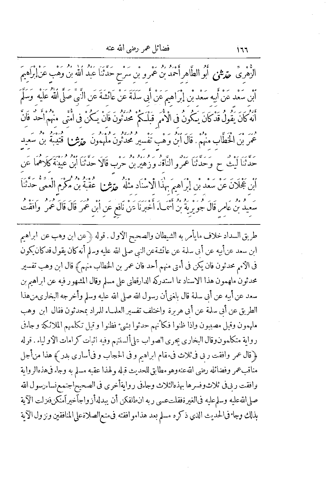 [2398] (عن بن وَهْبٍ عَنْ إِبْرَاهِيمَ بْنِ سَعْدٍ عَنْ أَبِيهِ عَنْ أَبِي سَلَمَةَ عَنْ عَائِشَةَ عَنِ النَّبِيِّ صَلَّى اللَّهُ عَلَيْهِ وَسَلَّمَ أَنَّهُ كَانَ يَقُولُ قَدْ كَانَ يَكُونُ فِي الْأُمَمِ مُحَدَّثُونَ فَإِنْ يَكُنْ فِي أُمَّتِي مِنْهُمْ أَحَدٌ فَإِنَّ عُمَرَ بن الخطاب منهم) قال بن وَهْبٍ تَفْسِيرُ مُحَدَّثُونَ مُلْهَمُونَ هَذَا الْإِسْنَادُ مِمَّا اسْتَدْرَكَهُ الدَّارَقُطْنِيُّ عَلَى مُسْلِمٍ وَقَالَ الْمَشْهُورُ فِيهِ عَنْ إِبْرَاهِيمَ بْنِ سَعْدٍ عَنْ أَبِيهِ عَنْ أَبِي سَلَمَةَ قَالَ بَلَغَنِي أَنَّ رَسُولَ اللَّهِ صَلَّى اللَّهُ عَلَيْهِ وَسَلَّمَ وَأَخْرَجَهُ الْبُخَارِيُّ مِنْ هَذَا الطَّرِيقِ عَنْ أَبِي سَلَمَةَ عَنْ أَبِي هُرَيْرَةَ وَاخْتَلَفَ تَفْسِيرُ الْعُلَمَاءِ لِلْمُرَادِ بِمُحَدَّثُونَ فَقَالَ بن وَهْبٍ مُلْهَمُونَ وَقِيلَ مُصِيبُونَ وَإِذَا ظَنُّوا فَكَأَنَّهُمْ حدثوا بشئ فَظَنُّوا وَقِيلَ تُكَلِّمُهُمُ الْمَلَائِكَةُ وَجَاءَ فِي رِوَايَةٍ مُتَكَلِّمُونَ وَقَالَ الْبُخَارِيُّ يَجْرِي الصَّوَابُ عَلَى أَلْسِنَتِهِمْ وَفِيهِ إِثْبَاتُ كَرَامَاتِ الْأَوْلِيَاءِ قَوْلُهُ