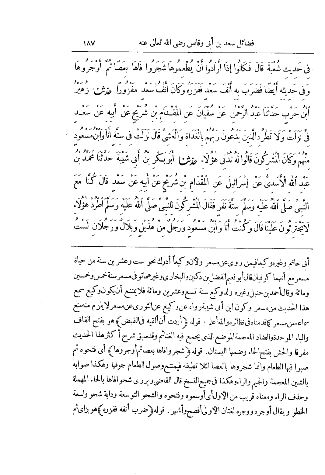 وَهُوَ سَعْدُ بْنُ مَالِكٍ وَفِيهِ فَضِيلَةُ الرَّمْيِ وَالْحَثِّ عَلَيْهِ وَالدُّعَاءِ لِمَنْ فَعَلَ خَيْرًا قَوْلُهُ (كَانَ رَجُلٌ مِنَ الْمُشْرِكِينَ قَدْ أَحْرَقَ الْمُسْلِمِينَ) أَيْ أَثْخَنَ فِيهِمْ وَعَمِلَ فِيهِمْ نَحْوَ عَمَلِ النَّارِ قَوْلُهُ (فَنَزَعْتُ لَهُ بِسَهْمٍ لَيْسَ فِيهِ نَصْلٌ فَأَصَبْتُ جَنْبَهُ فَسَقَطَ وَانْكَشَفَتْ عَوْرَتُهُ فَضَحِكَ رَسُولُ اللَّهِ صَلَّى اللَّهُ عَلَيْهِ وَسَلَّمَ حَتَّى نَظَرْتُ إِلَى نَوَاجِذِهِ) فَقَوْلُهُ نَزَعْتُ لَهُ بِسَهْمٍ أَيْ رَمَيْتُهُ بِسَهْمٍ لَيْسَ فِيهِ زَجٌّ وَقَوْلُهُ فَأَصَبْتُ جَنْبَهُ بِالْجِيمِ وَالنُّونِ هَكَذَا هُوَ فِي مُعْظَمِ النُّسَخِ وَفِي بَعْضِهَا حَبَّتُهُ بِحَاءٍ مُهْمَلَةٍ وَبَاءٍ مُوَحَّدَةٍ مُشَدَّدَةٍ ثُمَّ مُثَنَّاةٍ فَوْقُ أَيْ حَبَّةُ قَلْبِهِ وَقَوْلُهُ فَضَحِكَ أَيْ فَرَحًا بِقَتْلِهِ عَدُوَّهُ لَا لِانْكِشَافِهِ وَقَوْلُهُ نَوَاجِذُهُ