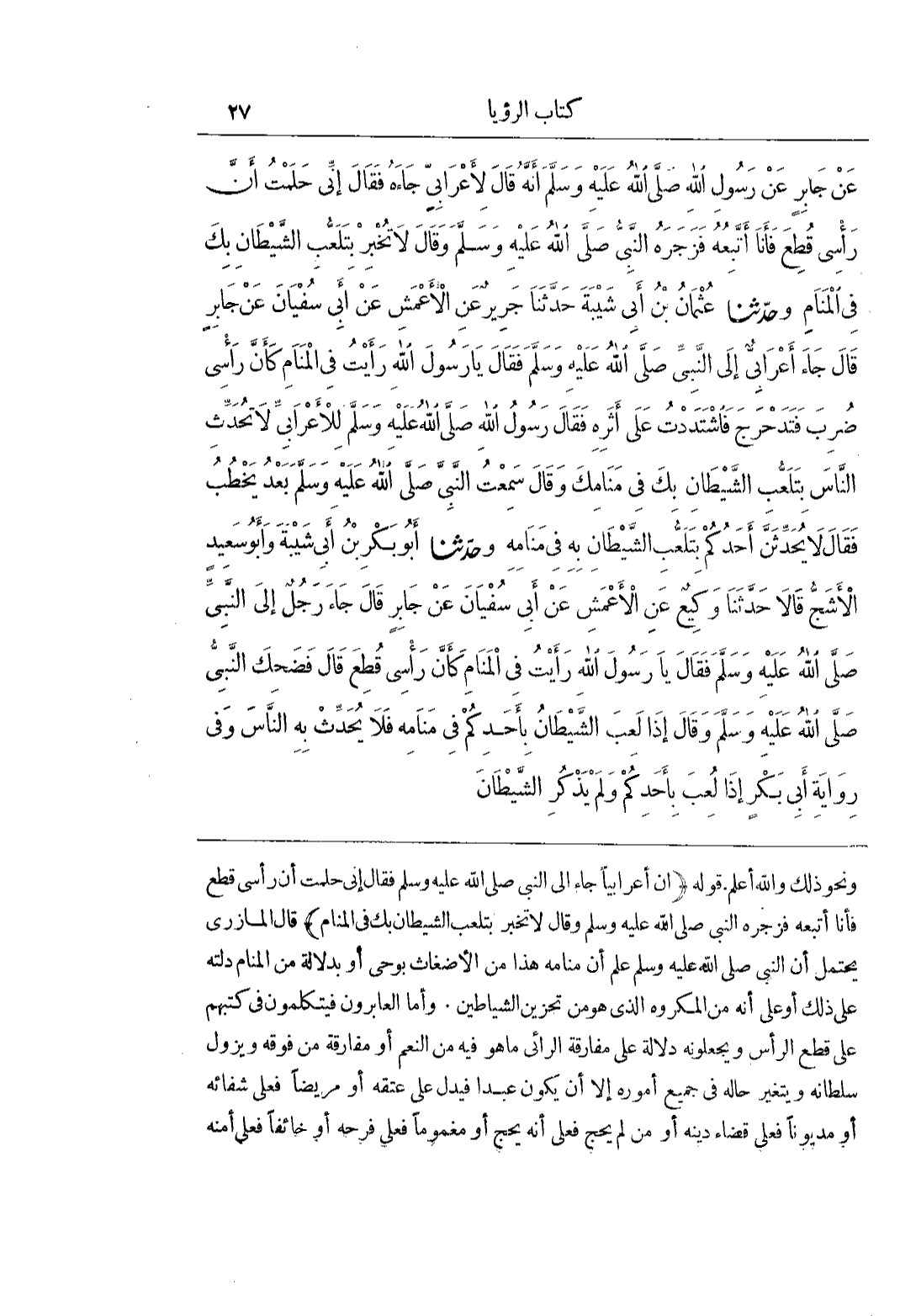 وَنَحْوِ ذَلِكَ وَاللَّهُ أَعْلَمُ قَوْلُهُ (إِنَّ أَعْرَابِيًّا جَاءَ إِلَى النَّبِيِّ صَلَّى اللَّهُ عَلَيْهِ وَسَلَّمَ فَقَالَ إِنِّي حَلَمْتُ أَنَّ رَأْسِي قُطِعَ فَأَنَا أَتَّبِعُهُ فَزَجَرَهُ النَّبِيُّ صَلَّى اللَّهُ عَلَيْهِ وَسَلَّمَ وَقَالَ لَا تُخْبِرْ بِتَلَعُّبِ الشَّيْطَانِ بِكَ فِي الْمَنَامِ) قَالَ الْمَازِرِيُّ يَحْتَمِلُ أَنَّ النَّبِيَّ صَلَّى اللَّهُ عَلَيْهِ وَسَلَّمَ عَلِمَ أَنَّ مَنَامَهُ هَذَا من الأضغاث بوحي أوبدلالة مِنَ الْمَنَامِ دَلَّتْهُ عَلَى ذَلِكَ أَوْ عَلَى أَنَّهُ مِنَ الْمَكْرُوهِ الَّذِي هُوَ مِنْ تَحْزِينِ الشَّيَاطِينِ وَأَمَّا الْعَابِرُونَ فَيَتَكَلَّمُونَ فِي كُتُبِهِمْ عَلَى قَطْعِ الرَّأْسِ وَيَجْعَلُونَهُ دَلَالَةً عَلَى مُفَارَقَةِ الرَّائِي مَا هُوَ فِيهِ مِنَ النِّعَمِ أَوْ مُفَارَقَةِ مَنْ فَوْقَهُ وَيَزُولُ سُلْطَانُهُ وَيَتَغَيَّرُ حَالُهُ فِي جَمِيعِ أُمُورِهِ إِلَّا أَنْ يَكُونَ عَبْدًا فَيَدُلُّ عَلَى عِتْقِهِ أَوْ مَرِيضًا فَعَلَى شِفَائِهِ أَوْ مَدْيُونًا فَعَلَى قَضَاءِ دَيْنِهِ أَوْ مَنْ لَمْ يَحُجَّ فَعَلَى أَنَّهُ يَحُجُّ أَوْ مَغْمُومًا فَعَلَى فَرَحِهِ أَوْ خَائِفًا فَعَلَى أَمْنِهِ