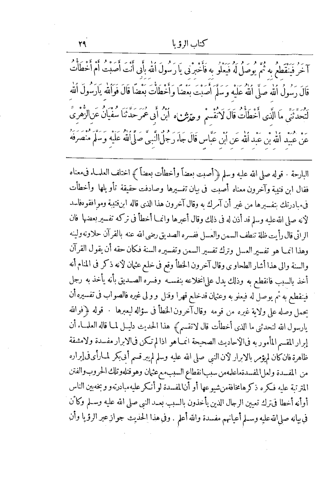 الْبَارِحَةَ قَوْلُهُ صَلَّى اللَّهُ عَلَيْهِ وَسَلَّمَ (أَصَبْتَ بَعْضًا وَأَخْطَأْتَ بَعْضًا) اخْتَلَفَ الْعُلَمَاءُ فِي مَعْنَاهُ فقال بن قُتَيْبَةَ وَآخَرُونَ مَعْنَاهُ أَصَبْتَ فِي بَيَانِ تَفْسِيرِهَا وَصَادَفْتَ حَقِيقَةَ تَأْوِيلِهَا وَأَخْطَأْتَ فِي مُبَادَرَتِكَ بِتَفْسِيرِهَا مِنْ غَيْرِ أَنْ آمُرَكَ بِهِ وَقَالَ آخَرُونَ هذا الذي قاله بن قُتَيْبَةَ وَمُوَافِقُوهُ فَاسِدٌ لِأَنَّهُ صَلَّى اللَّهُ عَلَيْهِ وَسَلَّمَ قَدْ أَذِنَ لَهُ فِي ذَلِكَ وَقَالَ اعْبُرْهَا وَإِنَّمَا أَخْطَأَ فِي تَرْكِهِ تَفْسِيرَ بَعْضِهَا فَإِنَّ الرَّائِي قَالَ رَأَيْتُ ظُلَّةً تَنْطِفُ السَّمْنَ وَالْعَسَلَ فَفَسَّرَهُ الصِّدِّيقُ رَضِيَ اللَّهُ عَنْهُ بِالْقُرْآنِ حَلَاوَتِهِ وَلِينِهِ وَهَذَا إِنَّمَا هُوَ تَفْسِيرُ الْعَسَلِ وَتَرَكَ تَفْسِيرَ السَّمْنِ وَتَفْسِيرَهُ السُّنَّةُ فَكَانَ حَقُّهُ أَنْ يَقُولَ الْقُرْآنُ وَالسُّنَّةُ وَإِلَى هَذَا أَشَارَ الطَّحَاوِيُّ وَقَالَ آخَرُونَ الْخَطَأُ وَقَعَ فِي خَلْعِ عُثْمَانَ لِأَنَّهُ ذَكَرَ فِي الْمَنَامِ أَنَّهُ أَخَذَ بِالسَّبَبِ فَانْقَطَعَ بِهِ وَذَلِكَ يَدُلُّ عَلَى انْخِلَاعِهِ بِنَفْسِهِ وَفَسَّرَهُ الصِّدِّيقُ بِأَنَّهُ يَأْخُذُ بِهِ رَجُلٌ فَيَنْقَطِعُ بِهِ ثُمَّ يُوصَلُ لَهُ فَيَعْلُو بِهِ وَعُثْمَانُ قَدْ خُلِعَ قَهْرًا وَقُتِلَ وَوُلِّيَ غَيْرُهُ فَالصَّوَابُ فِي تَفْسِيرِهِ أَنْ يُحْمَلَ وَصْلُهُ عَلَى وِلَايَةِ غَيْرِهِ مِنْ قَوْمِهِ وَقَالَ آخَرُونَ الْخَطَأُ في سؤاله ليعبرها قوله (فوالله يارسول اللَّهِ لَتُحَدِّثَنِّي مَا الَّذِي أَخْطَأْتُ قَالَ لَا تُقْسِمْ) هَذَا الْحَدِيثُ دَلِيلٌ لِمَا قَالَهُ الْعُلَمَاءُ أَنَّ إِبْرَارَ الْمُقْسِمِ الْمَأْمُورَ بِهِ فِي الْأَحَادِيثِ الصَّحِيحَةِ إِنَّمَا هُوَ إِذَا لَمْ تَكُنْ فِي الْإِبْرَارِ مَفْسَدَةٌ وَلَا مَشَقَّةٌ ظَاهِرَةٌ فَإِنْ كَانَ لَمْ يُؤْمَرْ بِالْإِبْرَارِ لِأَنَّ النَّبِيَّ صَلَّى اللَّهُ عَلَيْهِ وَسَلَّمَ لَمْ يَبَرَّ قَسَمَ أَبِي بَكْرٍ لَمَّا رَأَى فِي إِبْرَارِهِ مِنَ الْمَفْسَدَةِ وَلَعَلَّ الْمَفْسَدَةَ مَا عَلِمَهُ مِنْ سَبَبِ انْقِطَاعِ السَّبَبِ مَعَ عُثْمَانَ وَهُوَ قَتْلُهُ وَتِلْكَ الْحُرُوبُ وَالْفِتَنُ الْمُتَرَتِّبَةُ عَلَيْهِ فَكَرِهَ ذِكْرَهَا مَخَافَةً مِنْ شُيُوعِهَا أَوْ أَنَّ الْمَفْسَدَةَ لَوْ أَنْكَرَ عَلَيْهِ مُبَادَرَتَهَ وَوَبَّخَهُ بَيْنَ النَّاسِ أَوْ أَنَّهُ أَخْطَأَ فِي تَرْكِ تَعْيِينِ الرِّجَالِ الَّذِينَ يَأْخُذُونَ بِالسَّبَبِ بَعْدَ النَّبِيِّ صَلَّى اللَّهُ عَلَيْهِ وَسَلَّمَ وَكَانَ فِي بَيَانِهِ صَلَّى اللَّهُ عَلَيْهِ وَسَلَّمَ أَعْيَانَهُمْ مَفْسَدَةٌ وَاللَّهُ أَعْلَمُ وَفِي هَذَا الْحَدِيثِ جَوَازُ عَبْرِ الرؤيا وأن