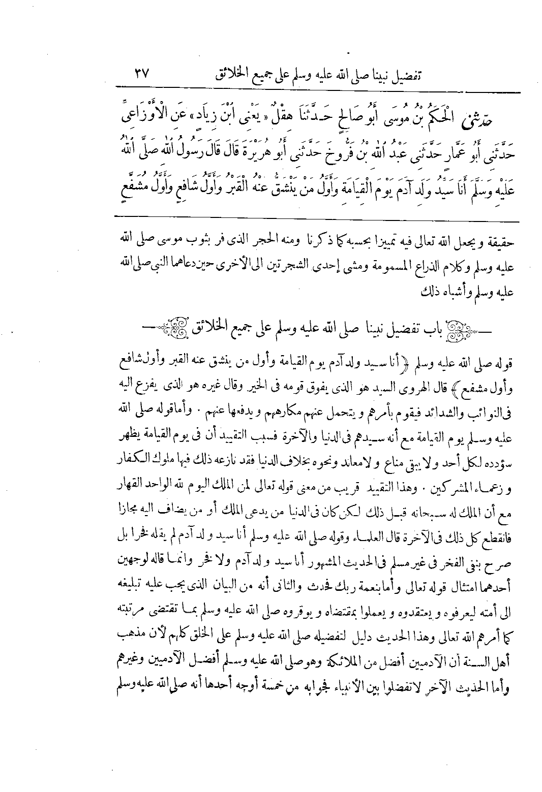 [2278] (أَنَا سَيِّدُ وَلَدِ آدَمَ يَوْمَ الْقِيَامَةِ وَأَوَّلُ مَنْ يَنْشَقُّ عَنْهُ الْقَبْرُ وَأَوَّلُ شَافِعٍ وَأَوَّلُ مُشَفَّعٍ) قَالَ الْهَرَوِيُّ السَّيِّدُ هُوَ الَّذِي يَفُوقُ قَوْمَهُ فِي الْخَيْرِ وَقَالَ غَيْرُهُ هُوَ الَّذِي يُفْزَعُ إِلَيْهِ فِي النَّوَائِبِ وَالشَّدَائِدِ فَيَقُومُ بِأَمْرِهِمْ وَيَتَحَمَّلُ عَنْهُمْ مَكَارِهَهُمْ وَيَدْفَعُهَا عَنْهُمْ وَأَمَّا قَوْلُهُ صَلَّى اللَّهُ عَلَيْهِ وَسَلَّمَ يَوْمَ الْقِيَامَةِ مَعَ أَنَّهُ سَيِّدُهُمْ فِي الدُّنْيَا وَالْآخِرَةِ فَسَبَبُ التَّقْيِيدِ أَنَّ فِي يَوْمِ الْقِيَامَةِ يَظْهَرُ سؤدده لكل أحد ولا يبقى مناع وَلَا مُعَانِدٌ وَنَحْوُهُ بِخِلَافِ الدُّنْيَا فَقَدْ نَازَعَهُ ذَلِكَ فِيهَا مُلُوكُ الْكُفَّارِ وَزُعَمَاءُ الْمُشْرِكِينَ وَهَذَا التَّقْيِيدُ قَرِيبٌ مِنْ مَعْنَى قَوْلِهِ تَعَالَى لِمَنِ الْمُلْكُ الْيَوْمَ لِلَّهِ الْوَاحِدِ الْقَهَّارِ مَعَ أَنَّ الْمُلْكَ لَهُ سُبْحَانَهُ قَبْلَ ذَلِكَ لَكِنْ كَانَ فِي الدُّنْيَا مَنْ يَدَّعِي الْمُلْكَ أَوْ مَنْ يُضَافُ إِلَيْهِ مَجَازًا فَانْقَطَعَ كُلُّ ذَلِكَ فِي الْآخِرَةِ قَالَ الْعُلَمَاءُ وَقَوْلُهُ صَلَّى اللَّهُ عَلَيْهِ وَسَلَّمَ أَنَا سَيِّدُ وَلَدِ آدَمَ لَمْ يَقُلْهُ فَخْرًا بَلْ صَرَّحَ بِنَفْيِ الْفَخْرِ فِي غَيْرِ مُسْلِمٍ فِي الْحَدِيثِ الْمَشْهُورِ أَنَا سَيِّدُ وَلَدِ آدَمَ وَلَا فَخْرَ وَإِنَّمَا قَالَهُ لِوَجْهَيْنِ أَحَدُهُمَا امْتِثَالُ قَوْلِهِ تَعَالَى وَأَمَّا بِنِعْمَةِ ربك فحدث وَالثَّانِي أَنَّهُ مِنَ الْبَيَانِ الَّذِي يَجِبُ عَلَيْهِ تَبْلِيغُهُ إِلَى أُمَّتِهِ لِيَعْرِفُوهُ وَيَعْتَقِدُوهُ وَيَعْمَلُوا بِمُقْتَضَاهُ وَيُوَقِّرُوهُ صَلَّى اللَّهُ عَلَيْهِ وَسَلَّمَ بِمَا تَقْتَضِي مَرْتَبَتُهُ كَمَا أَمَرَهُمُ اللَّهُ تَعَالَى وَهَذَا الْحَدِيثُ دَلِيلٌ لِتَفْضِيلِهِ صَلَّى اللَّهُ عَلَيْهِ وَسَلَّمَ عَلَى الْخَلْقِ كُلِّهِمْ لِأَنَّ مَذْهَبَ أَهْلِ السُّنَّةِ أَنَّ الْآدَمِيِّينَ أَفْضَلُ مِنَ الْمَلَائِكَةِ وَهُوَ صَلَّى اللَّهُ عَلَيْهِ وَسَلَّمَ أَفْضَلُ الْآدَمِيِّينَ وَغَيْرِهِمْ وَأَمَّا الْحَدِيثُ الْآخَرُ لَا تُفَضِّلُوا بَيْنَ الْأَنْبِيَاءِ فَجَوَابُهُ مِنْ خمسة أوجه أحدهما أَنَّهُ صَلَّى اللَّهُ عَلَيْهِ وَسَلَّمَ