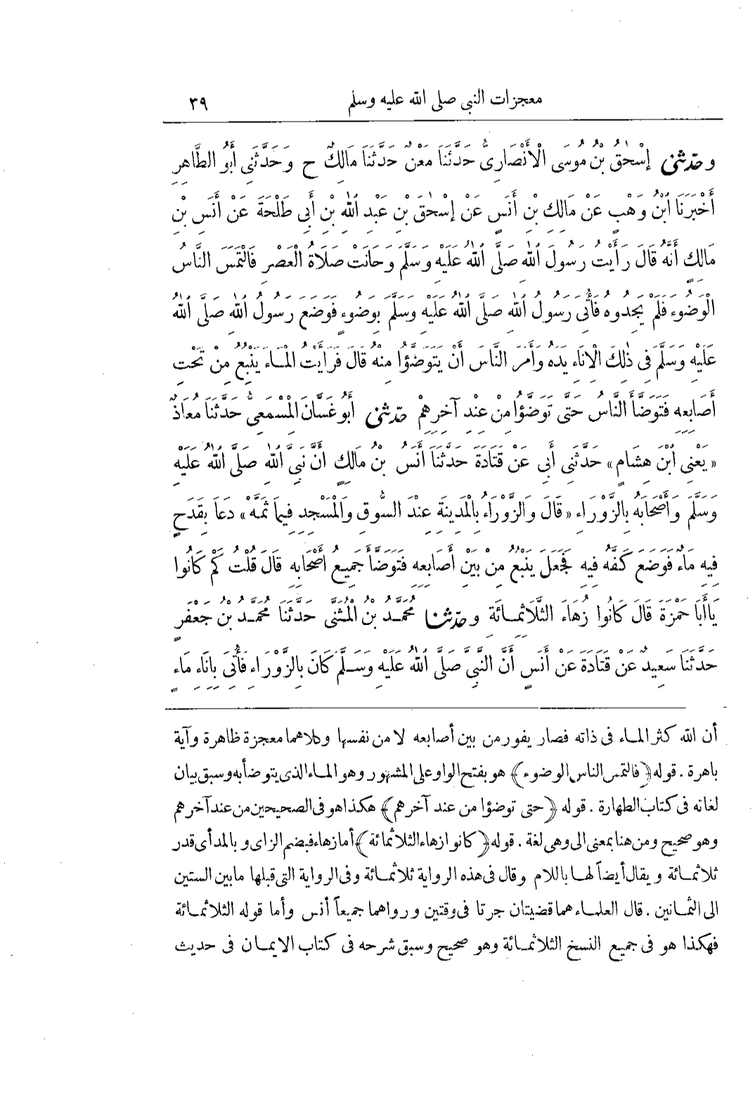 أَنَّ اللَّهَ كَثَّرَ الْمَاءَ فِي ذَاتِهِ فَصَارَ يَفُورُ مِنْ بَيْنِ أَصَابِعِهِ لَا مِنْ نَفْسِهَا وَكِلَاهُمَا مُعْجِزَةٌ ظَاهِرَةٌ وَآيَةٌ بَاهِرَةٌ قَوْلُهُ (فَالْتَمَسَ النَّاسُ الْوَضُوءَ) هُوَ بِفَتْحِ الْوَاوِ عَلَى الْمَشْهُورِ وهو الماءالذي يُتَوَضَّأُ بِهِ وَسَبَقَ بَيَانُ لُغَاتِهِ فِي كِتَابِ الطهارة قوله (حتى توضؤا مِنْ عِنْدِ آخِرِهِمْ) هَكَذَا هُوَ فِي الصَّحِيحَيْنِ من عند آخرهم وهو صحيح ومن هُنَا بِمَعْنَى إِلَى وَهِيَ لُغَةٌ قَوْلُهُ (كَانُوا زُهَاءَ الثَّلَاثِمِائَةِ) أَمَّا زُهَاءَ فَبِضَمِّ الزَّايِ وَبِالْمَدِّ أَيْ قَدْرَ ثَلَاثِمِائَةٍ وَيُقَالُ أَيْضًا لَهَا بِاللَّامِ وَقَالَ فِي هَذِهِ الرِّوَايَةِ ثَلَاثِمِائَةٍ وَفِي الرِّوَايَةِ الَّتِي قَبْلَهَا مَا بَيْنَ السِّتِّينَ إِلَى الثَّمَانِينَ قَالَ الْعُلَمَاءُ هُمَا قَضِيَّتَانِ جَرَتَا فِي وَقْتَيْنِ وَرَوَاهُمَا جَمِيعًا أَنَسٌ وَأَمَّا قَوْلُهُ الثَّلَاثُمِائَةِ فَهَكَذَا هُوَ فِي جَمِيعِ النُّسَخِ الثَّلَاثُمِائَةِ وَهُوَ صَحِيحٌ وَسَبَقَ شَرْحُهُ فِي كِتَابِ الْإِيمَانِ فِي حَدِيثِ