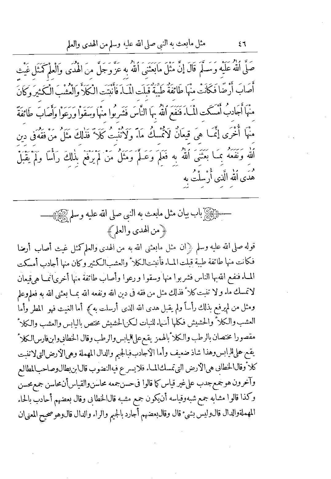 [2282] (إِنَّ مَثَلَ مَا بَعَثَنِي اللَّهُ بِهِ مِنَ الْهُدَى وَالْعِلْمِ كَمَثَلِ غَيْثٍ أَصَابَ أَرْضًا فَكَانَتْ مِنْهَا طَائِفَةٌ طَيِّبَةٌ قَبِلَتِ الْمَاءَ فَأَنْبَتَتِ الْكَلَأَ وَالْعُشْبَ الْكَثِيرَ وَكَانَ مِنْهَا أَجَادِبُ أَمْسَكَتِ الْمَاءَ فَنَفَعَ اللَّهُ بِهَا النَّاسَ فَشَرِبُوا مِنْهَا وَسَقَوْا وَرَعَوْا وَأَصَابَ طَائِفَةً مِنْهَا أُخْرَى إِنَّمَا هِيَ قِيعَانُ لَا تُمْسِكُ مَاءً وَلَا تُنْبِتُ كَلَأً فَذَلِكَ مَثَلُ مَنْ فَقِهَ فِي دِينِ اللَّهِ وَنَفَعَهُ اللَّهُ بِمَا بَعَثَنِي اللَّهُ بِهِ فَعَلِمَ وَعَلَّمَ وَمَثَلُ مَنْ لَمْ يَرْفَعْ بِذَلِكَ رَأْسًا وَلَمْ يَقْبَلْ هُدَى اللَّهِ الَّذِي أُرْسِلْتُ بِهِ) أَمَّا الْغَيْثُ فَهُوَ الْمَطَرُ وَأَمَّا الْعُشْبُ وَالْكَلَأُ وَالْحَشِيشُ فَكُلُّهَا أَسْمَاءٌ لِلنَّبَاتِ لَكِنَّ الْحَشِيشَ مُخْتَصٌّ بِالْيَابِسِ وَالْعُشْبُ والكلأ مقصورا مختصان بالرطب والكلأ بِالْهَمْزِ يَقَعُ عَلَى الْيَابِسِ وَالرَّطْبِ وَقَالَ الْخَطَّابِيُّ وبن فَارِسٍ الْكَلَأُ يَقَعُ عَلَى الْيَابِسِ وَهَذَا شَاذٌّ ضَعِيفٌ وَأَمَّا الْأَجَادِبُ فَبِالْجِيمِ وَالدَّالِ الْمُهْمَلَةِ وَهِيَ الأرض التي لا تُنْبِتُ كَلَأً وَقَالَ الْخَطَّابِيُّ هِيَ الْأَرْضُ الَّتِي تُمْسِكُ الْمَاءَ فَلَا يُسْرِعُ فِيهِ النُّضُوبُ قَالَ بن بَطَّالٍ وَصَاحِبُ الْمَطَالِعِ وَآخَرُونَ هُوَ جَمْعُ جَدْبٍ عَلَى غَيْرِ قِيَاسٍ كَمَا قَالُوا فِي حَسَنٍ جَمْعُهُ مَحَاسِنُ وَالْقِيَاسُ أَنَّ مَحَاسِنَ جَمْعُ مُحْسِنٍ وَكَذَا قَالُوا مُشَابِهُ جَمْعُ شَبَهٍ وَقِيَاسُهُ أَنْ يَكُونَ جَمْعَ مُشَبَّهٍ قَالَ الْخَطَّابِيُّ وَقَالَ بَعْضُهُمْ أَحَادِبُ بِالْحَاءِ الْمُهْمَلَةِ وَالدَّالِ قَالَ وَلَيْسَ بِشَيْءٍ قَالَ وَقَالَ بَعْضُهُمْ أَجَارِدُ بِالْجِيمِ وَالرَّاءِ وَالدَّالِ قَالَ وَهُوَ صَحِيحُ الْمَعْنَى إِنْ