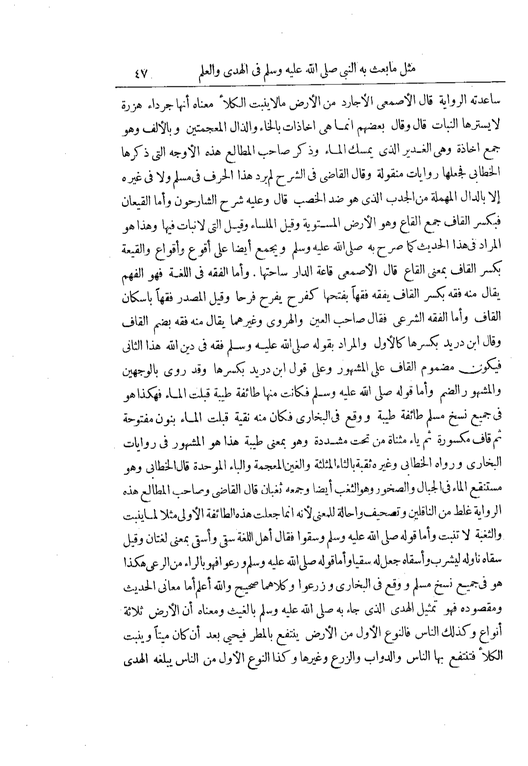 سَاعَدَتْهُ الرِّوَايَةُ قَالَ الْأَصْمَعِيُّ الْأَجَارِدُ مِنَ الْأَرْضِ مالا يُنْبِتُ الْكَلَأَ مَعْنَاهُ أَنَّهَا جَرْدَاءُ هَزْرَةٌ لَا يَسْتُرُهَا النَّبَاتُ قَالَ وَقَالَ بَعْضُهُمْ إِنَّمَا هِيَ أَخَاذَاتٌ بِالْخَاءِ وَالذَّالِ الْمُعْجَمَتَيْنِ وَبِالْأَلْفِ وَهُوَ جَمْعُ أَخَاذَةٍ وَهِيَ الْغَدِيرُ الَّذِي يُمْسِكُ الْمَاءَ وَذَكَرَ صَاحِبُ الْمَطَالِعِ هَذِهِ الْأَوْجُهَ الَّتِي ذَكَرَهَا الْخَطَّابِيُّ فَجَعَلَهَا رِوَايَاتٍ مَنْقُولَةً وَقَالَ الْقَاضِي فِي الشَّرْحِ لَمْ يَرِدْ هَذَا الْحَرْفُ فِي مُسْلِمٍ وَلَا فِي غَيْرِهِ إِلَّا بِالدَّالِ الْمُهْمَلَةِ مِنَ الْجَدْبِ الَّذِي هُوَ ضِدُّ الْخِصْبِ قَالَ وَعَلَيْهِ شَرَحَ الشَّارِحُونَ وَأَمَّا الْقِيعَانُ فَبِكَسْرِ الْقَافِ جَمْعُ الْقَاعِ وَهُوَ الْأَرْضُ الْمُسْتَوِيَةُ وَقِيلَ الْمَلْسَاءُ وَقِيلَ الَّتِي لَا نَبَاتَ فِيهَا وَهَذَا هُوَ الْمُرَادُ فِي هَذَا الْحَدِيثِ كَمَا صَرَّحَ بِهِ صَلَّى اللَّهُ عَلَيْهِ وَسَلَّمَ وَيُجْمَعُ أَيْضًا عَلَى أَقْوُعٍ وَأَقْوَاعٍ والقيعة بِكَسْرِ الْقَافُ بِمَعْنَى الْقَاعِ قَالَ الْأَصْمَعِيُّ قَاعَةُ الدار ساحتها وأما الفقه في اللغة فهو الفهم يُقَالُ مِنْهُ فَقِهَ بِكَسْرِ الْقَافِ يَفْقَهُ فِقَهًا بِفَتْحِهَا كَفَرِحَ يَفْرَحُ فَرَحًا وَقِيلَ الْمَصْدَرُ فِقْهًا بِإِسْكَانِ الْقَافِ وَأَمَّا الْفِقْهُ الشَّرْعِيُّ فَقَالَ صَاحِبُ الْعَيْنِ وَالْهَرَوِيُّ وَغَيْرُهُمَا يُقَالُ مِنْهُ فَقُهَ بِضَمِّ القاف وقال بن دُرَيْدٍ بِكَسْرِهَا كَالْأَوَّلِ وَالْمُرَادُ بِقَوْلِهِ صَلَّى اللَّهُ عَلَيْهِ وَسَلَّمَ فَقُهَ فِي دِينِ اللَّهِ هَذَا الثَّانِي فَيَكُونُ مَضْمُومَ الْقَافِ عَلَى الْمَشْهُورِ وَعَلَى قول بن دُرَيْدٍ بِكَسْرِهَا وَقَدْ رُوِيَ بِالْوَجْهَيْنِ وَالْمَشْهُورُ الضَّمُّ وَأَمَّا قَوْلُهُ صَلَّى اللَّهُ عَلَيْهِ وَسَلَّمَ فَكَانَتْ مِنْهَا طَائِفَةٌ طَيِّبَةٌ قَبِلَتِ الْمَاءَ فَهَكَذَا هُوَ فِي جَمِيعِ نُسَخِ مُسْلِمٍ طَائِفَةٌ طَيِّبَةٌ وَوَقَعَ فِي الْبُخَارِيِّ فَكَانَ مِنْهُ نَقِيَّةٌ قَبِلَتِ الْمَاءَ بِنُونٍ مَفْتُوحَةٍ ثُمَّ قَافٍ مَكْسُورَةٍ ثُمَّ يَاءٍ مُثَنَّاةٍ مِنْ تَحْتُ مُشَدَّدَةٍ وَهُوَ بِمَعْنَى طَيِّبَةٍ هَذَا هُوَ الْمَشْهُورُ فِي رِوَايَاتِ الْبُخَارِيِّ وَرَوَاهُ الْخَطَّابِيُّ وَغَيْرُهُ ثَغْبَةٌ بِالثَّاءِ الْمُثَلَّثَةِ وَالْغَيْنِ الْمُعْجَمَةِ وَالْبَاءِ الْمُوَحَّدَةِ قَالَ الْخَطَّابِيُّ هُوَ مُسْتَنْقَعُ الْمَاءِ فِي الْجِبَالِ وَالصُّخُورِ وَهُوَ الثَّغْبُ أَيْضًا وَجَمْعُهُ ثُغْبَانٌ قَالَ الْقَاضِي وَصَاحِبُ الْمَطَالِعِ هَذِهِ الرِّوَايَةُ غَلَطٌ مِنَ النَّاقِلِينَ وَتَصْحِيفٌ وَإِحَالَةٌ لِلْمَعْنَى لِأَنَّهُ إِنَّمَا جُعِلَتْ هَذِهِ الطَّائِفَةُ الْأُولَى مَثَلًا لِمَا يَنْبُتُ وَالثَّغْبَةُ لَا تُنْبِتُ وَأَمَّا قَوْلُهُ صَلَّى اللَّهُ عَلَيْهِ وَسَلَّمَ وَسَقَوْا فَقَالَ أَهْلُ اللُّغَةِ سَقَى وَأَسْقَى بِمَعْنًى لُغَتَانِ وَقِيلَ سَقَاهُ نَاوَلَهُ لِيَشْرَبَ وَأَسْقَاهُ جَعَلَ لَهُ سَقْيًا وَأَمَّا قَوْلُهُ صَلَّى اللَّهُ عَلَيْهِ وَسَلَّمَ وَرَعَوْا فَهُوَ بِالرَّاءِ مِنَ الرَّعْيِ هَكَذَا هُوَ فِي جَمِيعِ نُسَخِ مُسْلِمٍ وَوَقَعَ فِي الْبُخَارِيِّ وَزَرَعُوا وَكِلَاهُمَا صَحِيحٌ وَاللَّهُ أَعْلَمُ أَمَّا مَعَانِي الْحَدِيثِ وَمَقْصُودُهُ فَهُوَ تَمْثِيلُ الْهُدَى الَّذِي جَاءَ بِهِ صَلَّى اللَّهُ عَلَيْهِ وَسَلَّمَ بِالْغَيْثِ وَمَعْنَاهُ أَنَّ الْأَرْضَ ثَلَاثَةُ أَنْوَاعٍ وَكَذَلِكَ النَّاسُ فَالنَّوْعُ الْأَوَّلُ مِنَ الْأَرْضِ يَنْتَفِعُ بِالْمَطَرِ فَيَحْيَى بَع