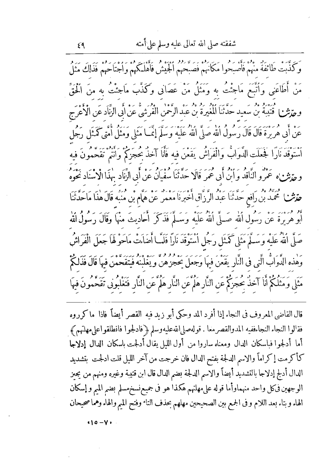 قَالَ الْقَاضِي الْمَعْرُوفُ فِي النَّجَاءِ إِذَا أُفْرِدَ الْمَدُّ وَحَكَى أَبُو زَيْدٍ فِيهِ الْقَصْرَ أَيْضًا فَإِذَا مَا كَرَّرُوهُ فَقَالُوا النَّجَاءَ النَّجَاءَ فَفِيهِ الْمَدُّ وَالْقَصْرُ مَعًا قَوْلُهُ صَلَّى اللَّهُ عَلَيْهِ وَسَلَّمَ (فَأَدْلَجُوا فَانْطَلَقُوا عَلَى مُهْلَتِهِمْ) أَمَّا أَدْلَجُوا فَبِإِسْكَانِ الدَّالِ وَمَعْنَاهُ سَارُوا مِنْ أَوَّلِ اللَّيْلِ يُقَالُ أَدْلَجْتُ بِإِسْكَانِ الدَّالِ إِدْلَاجًا كَأَكْرَمْتُ إِكْرَامًا وَالِاسْمُ الدَّلْجَةُ بِفَتْحِ الدَّالِ فَإِنْ خَرَجْتَ مِنْ آخِرِ اللَّيْلِ قُلْتَ ادَّلَجْتُ بِتَشْدِيدِ الدَّالِ أَدَّلِجُ ادِّلَاجًا بِالتَّشْدِيدِ أَيْضًا وَالِاسْمُ الدُّلْجَةُ بِضَمِّ الدَّالِ قال بن قُتَيْبَةَ وَغَيْرُهُ وَمِنْهُمْ مَنْ يُجِيزُ الْوَجْهَيْنِ فِي كل واحد منهما وأماقوله عَلَى مُهْلَتِهِمْ هَكَذَا هُوَ فِي جَمِيعِ نُسَخِ مسلم بضم الميم وإسكان الهاء وبتاء بَعْدَ اللَّامِ وَفِي الْجَمْعِ بَيْنَ الصَّحِيحَيْنِ مَهَلِهِمْ بِحَذْفِ التَّاءِ وَفَتْحِ الْمِيمِ وَالْهَاءِ وَهُمَا صَحِيحَانِ