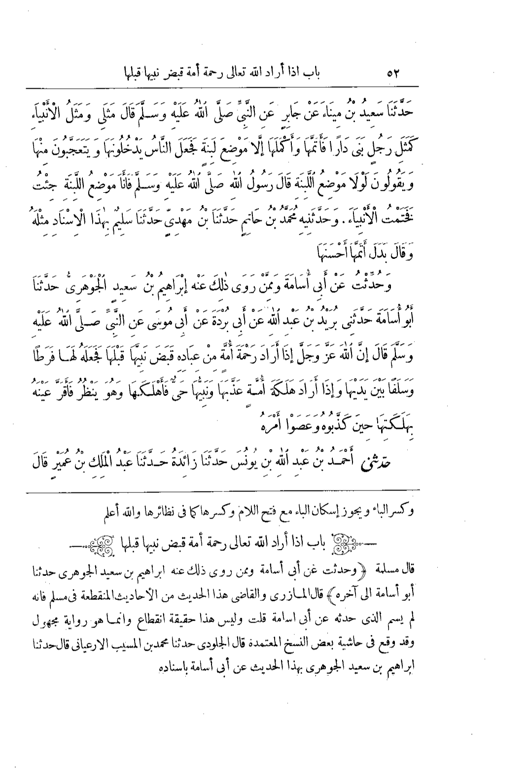 [2288] (وَحُدِّثْتُ عَنْ أَبِي أُسَامَةَ وَمِمَّنْ رَوَى ذَلِكَ عَنْهُ إِبْرَاهِيمُ بْنُ سَعِيدٍ الْجَوْهَرِيُّ حَدَّثَنَا أَبُو أُسَامَةَ إِلَى آخِرِهِ) قَالَ الْمَازِرِيُّ وَالْقَاضِي هَذَا الْحَدِيثُ مِنَ الْأَحَادِيثِ الْمُنْقَطِعَةِ فِي مُسْلِمٍ فَإِنَّهُ لَمْ يُسَمِّ الَّذِي حَدَّثَهُ عَنْ أَبِي أُسَامَةَ قُلْتُ وَلَيْسَ هَذَا حَقِيقَةَ انْقِطَاعٍ وَإِنَّمَا هُوَ رِوَايَةُ مَجْهُولٍ وَقَدْ وَقَعَ فِي حَاشِيَةِ بَعْضِ النُّسَخِ الْمُعْتَمَدَةِ قال الجلودي حدثنا محمد بن المسيب الارعياني قَالَ حَدَّثَنَا إِبْرَاهِيمُ بْنُ سَعِيدٍ الْجَوْهَرِيُّ بِهَذَا الْحَدِيثِ عَنْ أَبِي أُسَامَةَ بِإِسْنَادِهِ