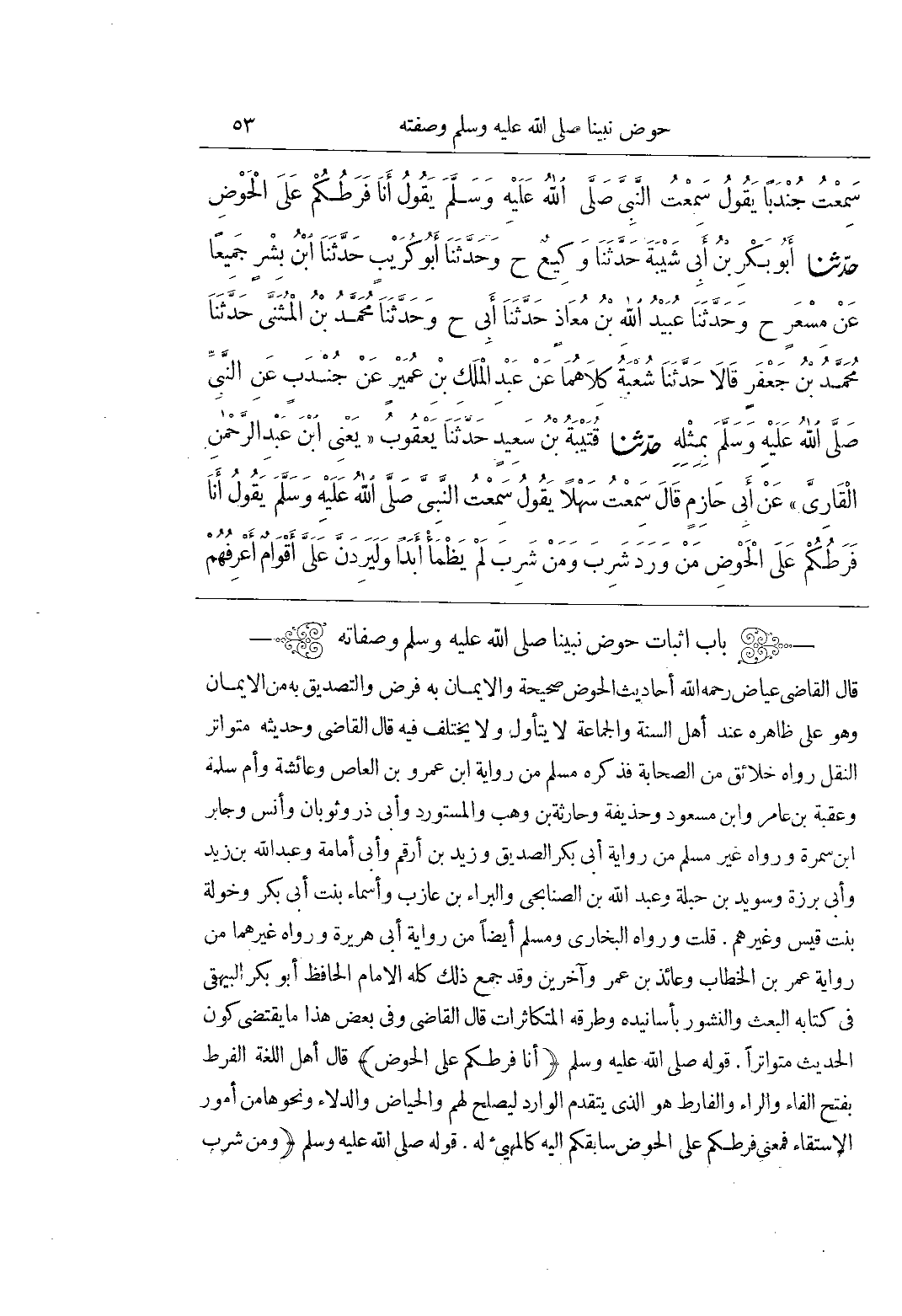 قَالَ الْقَاضِي عِيَاضٌ رَحِمَهُ اللَّهُ أَحَادِيثُ الْحَوْضِ صَحِيحَةٌ وَالْإِيمَانُ بِهِ فَرْضٌ وَالتَّصْدِيقُ بِهِ مِنَ الْإِيمَانِ وَهُوَ عَلَى ظَاهِرِهِ عِنْدَ أَهْلِ السُّنَّةِ وَالْجَمَاعَةِ لَا يُتَأَوَّلُ وَلَا يُخْتَلَفُ فِيهِ قَالَ الْقَاضِي وَحَدِيثُهُ مُتَوَاتِرُ النَّقْلِ رَوَاهُ خَلَائِقُ مِنَ الصَّحَابَةِ فَذَكَرَهُ مُسْلِمٌ مِنْ رِوَايَةِ بن عَمْرِو بْنِ الْعَاصِ وَعَائِشَةَ وَأُمِّ سَلَمَةَ وَعُقْبَةَ بن عامر وبن مَسْعُودٍ وَحُذَيْفَةَ وَحَارِثَةَ بْنِ وَهْبٍ وَالْمُسْتَوْرِدِ وَأَبِي ذَرٍّ وَثَوْبَانَ وَأَنَسٍ وَجَابِرِ بْنِ سَمُرَةَ وَرَوَاهُ غَيْرُ مُسْلِمٍ مِنْ رِوَايَةِ أَبِي بَكْرٍ الصِّدِّيقِ وَزَيْدِ بْنِ أَرْقَمَ وَأَبِي أُمَامَةَ وَعَبْدِ اللَّهِ بن زيد وأبي برزة وسويد بن حبلة وَعَبْدِ اللَّهِ بْنِ الصُّنَابِحِيِّ وَالْبَرَاءِ بْنِ عَازِبٍ وَأَسْمَاءَ بِنْتِ أَبِي بَكْرٍ وَخَوْلَةَ بِنْتِ قَيْسٍ وَغَيْرِهِمْ قُلْتُ وَرَوَاهُ الْبُخَارِيُّ وَمُسْلِمٌ أَيْضًا مِنْ رِوَايَةِ أَبِي هُرَيْرَةَ وَرَوَاهُ غَيْرُهُمَا مِنْ رِوَايَةِ عُمَرَ بْنِ الْخَطَّابِ وَعَائِذِ بْنِ عُمَرَ وَآخَرِينَ وَقَدْ جَمَعَ ذَلِكَ كُلَّهُ الْإِمَامُ الْحَافِظُ أَبُو بَكْرٍ الْبَيْهَقِيُّ فِي كِتَابِهِ الْبَعْثُ وَالنُّشُورُ بِأَسَانِيدِهِ وَطُرُقِهِ الْمُتَكَاثِرَاتِ قَالَ الْقَاضِي وَفِي بَعْضِ هَذَا مَا يَقْتَضِي كَوْنَ الْحَدِيثِ مُتَوَاتِرًا قَوْلَهُ صَلَّى اللَّهُ عَلَيْهِ وَسَلَّمَ