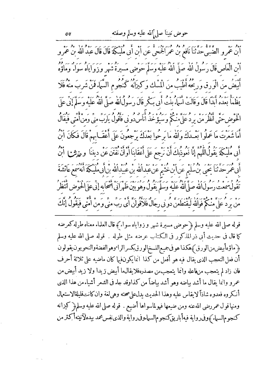 [2292] (حَوْضِي مَسِيرَةُ شَهْرٍ وَزَوَايَاهُ سَوَاءٌ) قَالَ الْعُلَمَاءُ مَعْنَاهُ طُولُهُ كَعَرْضِهِ كَمَا قَالَ فِي حَدِيثِ أَبِي ذَرٍّ الْمَذْكُورِ فِي الْكِتَابِ عَرْضُهُ مِثْلُ طُولِهِ قَوْلُهُ صَلَّى اللَّهُ عَلَيْهِ وَسَلَّمَ (مَاؤُهُ أَبْيَضُ مِنَ الْوَرِقِ) هَكَذَا هُوَ فِي جَمِيعِ النُّسَخِ الْوَرِقِ بِكَسْرِ الرَّاءِ وَهُوَ الْفِضَّةُ وَالنَّحْوِيُّونَ يَقُولُونَ إِنَّ فِعْلَ التَّعَجُّبِ الَّذِي يُقَالُ فِيهِ هُوَ أَفْعَلُ مِنْ كَذَا إِنَّمَا يَكُونُ فِيمَا كَانَ مَاضِيهِ عَلَى ثَلَاثَةِ أَحْرُفٍ فَإِنْ زَادَ لَمْ يُتَعَجَّبْ مِنْ فَاعِلِهِ وَإِنَّمَا يُتَعَجَّبُ مِنْ مَصْدَرِهِ فَلَا يُقَالُ مَا أَبْيَضَ زَيْدًا وَلَا زَيْدٌ أَبْيَضُ مِنْ عَمْرٍو وَإِنَّمَا يُقَالُ مَا أَشَدُّ بَيَاضِهِ وَهُوَ أَشَدُّ بَيَاضًا مِنْ كَذَا وَقَدْ جَاءَ فِي الشِّعْرِ أَشْيَاءُ مِنْ هَذَا الَّذِي أَنْكَرُوهُ فَعَدُّوهُ شَاذًّا لَا يُقَاسُ عَلَيْهِ وَهَذَا الْحَدِيثُ يَدُلُّ عَلَى صِحَّتِهِ وَهِيَ لُغَةٌ وَإِنْ كَانَتْ قَلِيلَةَ الِاسْتِعْمَالِ وَمِنْهَا قَوْلُ عُمَرَ رَضِيَ اللَّهُ عَنْهُ وَمَنْ ضَيَّعَهَا فَهُوَ لِمَا سِوَاهَا أَضْيَعُ قَوْلُهُ صَلَّى اللَّهُ عَلَيْهِ وَسَلَّمَ (كِيزَانُهُ كَنُجُومِ السَّمَاءِ) وَفِي