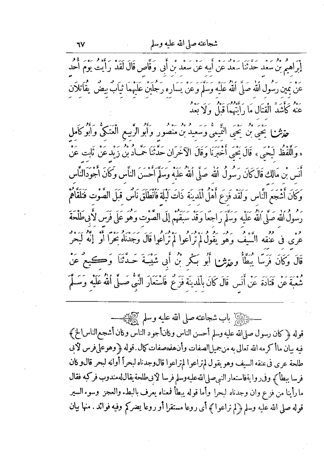 [2307] كَانَ رَسُولُ اللَّهِ صَلَّى اللَّهُ عَلَيْهِ وَسَلَّمَ أَحْسَنَ النَّاسِ وَكَانَ أَجْوَدَ النَّاسِ وَكَانَ أَشْجَعَ النَّاسِ إِلَخْ فِيهِ بَيَانُ مَا أَكْرَمَهُ اللَّهُ تَعَالَى بِهِ مِنْ جَمِيلِ الصِّفَاتِ وَأَنَّ هَذِهِ صِفَاتُ كَمَالٍ قَوْلُهُ (وَهُوَ عَلَى فَرَسٍ لِأَبِي طَلْحَةَ عُرْيٍ فِي عُنُقِهِ السَّيْفُ وَهُوَ يَقُولُ لَمْ تُرَاعُوا لَمْ تُرَاعُوا قَالَ وَجَدْنَاهُ لَبَحْرًا أَوْ إِنَّهُ لَبَحْرٌ قَالَ وَكَانَ فَرَسًا يُبَطَّأُ) وَفِي رِوَايَةٍ فَاسْتَعَارَ النَّبِيُّ صَلَّى اللَّهُ عَلَيْهِ وَسَلَّمَ فَرَسًا لِأَبِي طَلْحَةَ يُقَالُ لَهُ مَنْدُوبٌ فَرَكِبَهُ فَقَالَ مَا رَأَيْنَا مِنْ فَزَعٍ وَإِنْ وَجَدْنَاهُ لَبَحْرًا وَأَمَّا قَوْلُهُ يُبَطَّأُ فَمَعْنَاهُ يُعْرَفُ بِالْبُطْءِ وَالْعَجْزِ وَسُوءِ السَّيْرِ قَوْلُهُ صَلَّى اللَّهُ عَلَيْهِ وَسَلَّمَ (لَمْ تُرَاعُوا) أَيْ رَوْعًا مُسْتَقِرًّا أَوْ رَوْعًا يَضُرُّكُمْ وَفِيهِ فَوَائِدُ مِنْهَا بَيَانُ)