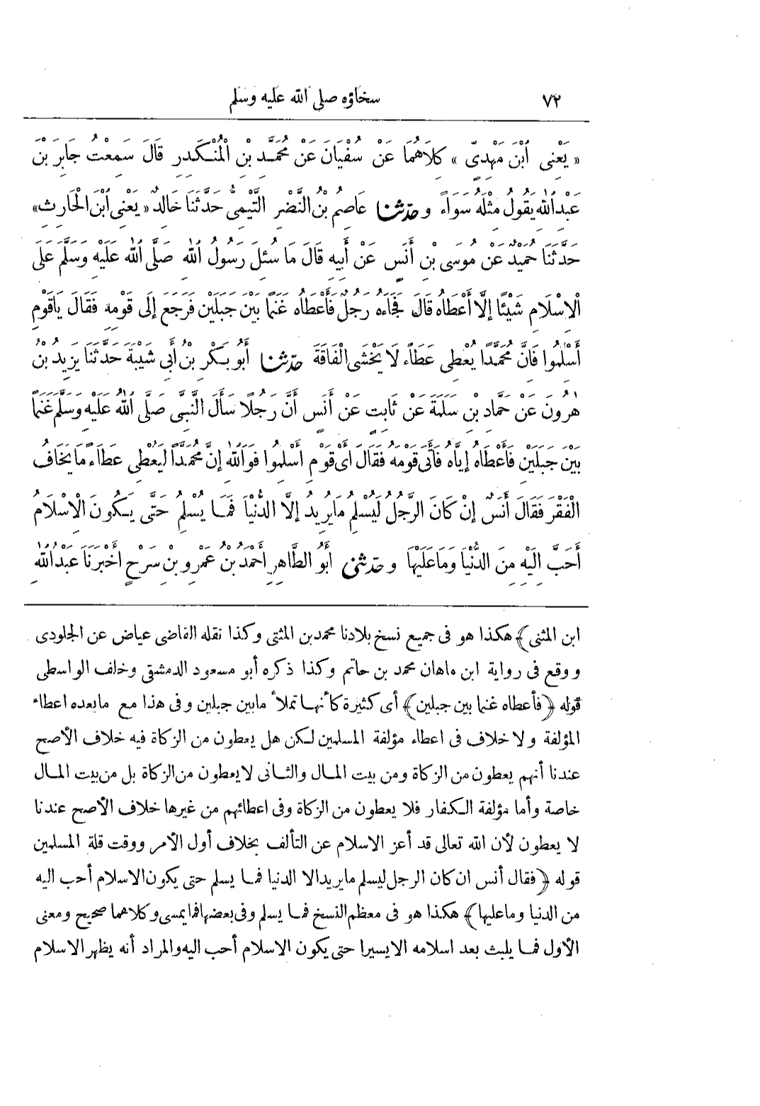 [2312] (فَأَعْطَاهُ غَنَمًا بَيْنَ جَبَلَيْنِ) أَيْ كَثِيرَةً كَأَنَّهَا تَمْلَأُ مَا بَيْنَ جَبَلَيْنِ وَفِي هَذَا مَعَ مَا بَعْدَهُ اعطاء المؤلفة ولاخلاف فِي إِعْطَاءِ مُؤَلَّفَةِ الْمُسْلِمِينَ لَكِنْ هَلْ يُعْطَوْنَ مِنَ الزَّكَاةِ فِيهِ خِلَافٌ الْأَصَحُّ عِنْدَنَا أَنَّهُمْ يُعْطَونَ مِنَ الزَّكَاةِ وَمَنْ بَيْتِ الْمَالِ وَالثَّانِي لَا يُعْطَوْنَ مِنَ الزَّكَاةِ بَلْ مِنْ بَيْتِ الْمَالِ خَاصَّةً وَأَمَّا مُؤَلَّفَةُ الْكُفَّارِ فَلَا يُعْطَوْنَ مِنَ الزَّكَاةِ وَفِي إِعْطَائِهِمْ مِنْ غَيْرِهَا خِلَافٌ الْأَصَحُّ عِنْدَنَا لَا يُعْطَوْنَ لِأَنَّ اللَّهَ تَعَالَى قَدْ أَعَزَّ الْإِسْلَامَ عَنِ التَّأَلُّفِ بِخِلَافِ أَوَّلِ الْأَمْرِ وَوَقْتِ قِلَّةِ الْمُسْلِمِينَ قَوْلُهُ (فَقَالَ أَنَسٌ إِنْ كَانَ الرَّجُلُ لَيُسْلِمُ مَا يُرِيدُ إِلَّا الدُّنْيَا فَمَا يُسْلِمُ حَتَّى يَكُونَ الْإِسْلَامُ أَحَبَّ إِلَيْهِ مِنَ الدُّنْيَا وَمَا عَلَيْهَا) هَكَذَا هُوَ فِي مُعْظَمِ النُّسَخِ فَمَا يُسْلِمُ وَفِي بَعْضِهَا فَمَا يُمْسِي وَكِلَاهُمَا صَحِيحٌ وَمَعْنَى الْأَوَّلِ فَمَا يَلْبَثُ بَعْدَ إِسْلَامِهِ إِلَّا يَسِيرًا حَتَّى يَكُونَ الْإِسْلَامُ أَحَبَّ إِلَيْهِ وَالْمُرَادُ أَنَّهُ يُظْهِرُ الْإِسْلَامَ