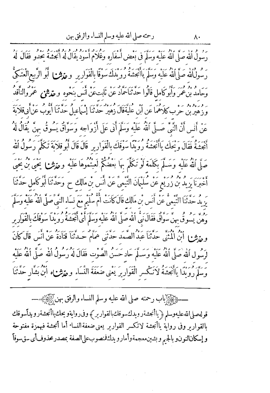 [2323] (يَا أنجشة رويدك سوقك بِالْقَوَارِيرِ وَفِي رِوَايَةٍ وَيْحَكَ يَا أَنْجَشَةُ رُوَيْدًا سَوْقَكُ بِالْقَوَارِيرِ وَفِي رِوَايَةٍ يَا أَنْجَشَةُ لَا تَكْسِرِ الْقَوَارِيرَ يَعْنِي ضَعَفَةَ النِّسَاءِ أَمَّا أَنْجَشَةُ فهمزة مَفْتُوحَةٍ وَإِسْكَانِ النُّونِ وَبِالْجِيمِ وَبِشِينٍ مُعْجَمَةٍ وَأَمَّا رُوَيْدَكَ فَمَنْصُوبٌ عَلَى الصِّفَةِ بِمَصْدَرٍ مَحْذُوفٍ أَيْ سق سوقا