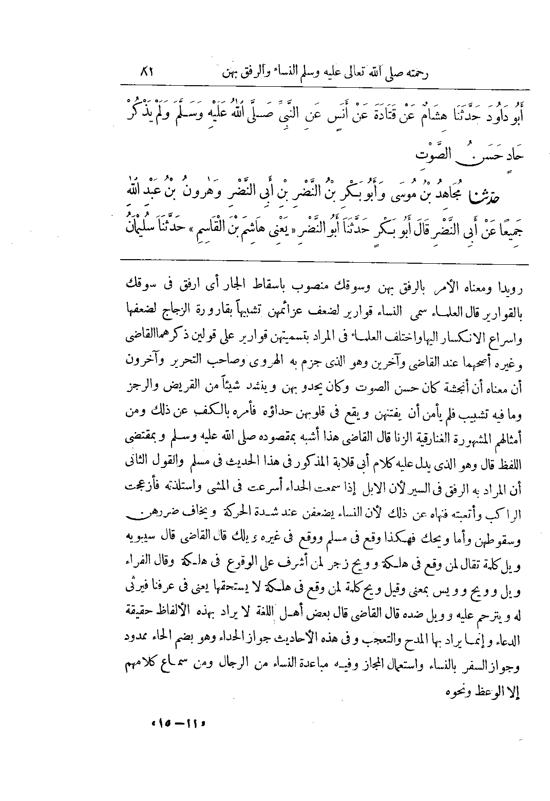رُوَيْدًا وَمَعْنَاهُ الْأَمْرُ بِالرِّفْقِ بِهِنَّ وَسَوْقُكُ مَنْصُوبٌ بِإِسْقَاطِ الْجَارِّ أَيِ ارْفُقْ فِي سَوْقِكَ بِالْقَوَارِيرِ قَالَ الْعُلَمَاءُ سُمِّيَ النِّسَاءُ قَوَارِيرَ لِضَعْفِ عَزَائِمِهِنَّ تَشْبِيهًا بِقَارُورَةِ الزُّجَاجِ لِضَعْفِهَا وَإِسْرَاعِ الِانْكِسَارِ إِلَيْهَا وَاخْتَلَفَ الْعُلَمَاءُ فِي الْمُرَادِ بِتَسْمِيَتِهِنَّ قَوَارِيرَ عَلَى قَوْلَيْنِ ذَكَرَهُمَا الْقَاضِي وَغَيْرُهُ أَصَحُّهُمَا عِنْدَ الْقَاضِي وَآخَرِينَ وَهُوَ الَّذِي جَزَمَ بِهِ الْهَرَوِيُّ وَصَاحِبُ التَّحْرِيرِ وَآخَرُونَ أَنَّ مَعْنَاهُ أَنَّ أَنْجَشَةُ كَانَ حَسَنَ الصَّوْتِ وَكَانَ يَحْدُو بِهِنَّ وَيُنْشِدُ شَيْئًا مِنَ الْقَرِيضِ وَالرَّجَزِ وَمَا فِيهِ تَشْبِيبٌ فَلَمْ يَأْمَنْ أَنْ يَفْتِنَهُنَّ وَيَقَعَ فِي قُلُوبِهِنَّ حِدَاؤُهُ فَأَمَرَهُ بِالْكَفِّ عَنْ ذَلِكَ وَمَنْ أَمْثَالِهِمُ الْمَشْهُورَةِ الغنارقية الزنى قَالَ الْقَاضِي هَذَا أَشْبَهُ بِمَقْصُودِهِ صَلَّى اللَّهُ عَلَيْهِ وَسَلَّمَ وَبِمُقْتَضَى اللَّفْظِ قَالَ وَهُوَ الَّذِي يَدُلُّ عَلَيْهِ كَلَامُ أَبِي قِلَابَةَ الْمَذْكُورُ فِي هَذَا الْحَدِيثِ فِي مُسْلِمٍ وَالْقَوْلُ الثَّانِي أَنَّ الْمُرَادَ بِهِ الرِّفْقُ فِي السَّيْرِ لِأَنَّ الْإِبِلَ إِذَا سَمِعَتِ الْحُدَاءَ أَسْرَعَتْ فِي الْمَشْيِ وَاسْتَلَذَّتْهُ فَأَزْعَجَتِ الرَّاكِبَ وَأَتْعَبَتْهُ فَنَهَاهُ عَنْ ذَلِكَ لِأَنَّ النِّسَاءَ يَضْعُفْنَ عِنْدَ شِدَّةِ الْحَرَكَةِ وَيُخَافُ ضَرَرُهُنَّ وسقوطهن وأما وَيْحَكَ فَهَكَذَا وَقَعَ فِي مُسْلِمٍ وَوَقَعَ فِي غَيْرِهِ وَيْلَكَ قَالَ الْقَاضِي قَالَ سِيبَوَيْهِ وَيْلٌ كلمة تقال لمن وقع في هلكة وويح زَجْرٌ لِمَنْ أَشْرَفَ عَلَى الْوُقُوعِ فِي هَلَكَةٍ وَقَالَ الْفَرَّاءُ وَيْلٌ وَوَيْحٌ وَوَيْسٌ بِمَعْنًى وَقِيلَ وَيْحٌ كَلِمَةٌ لِمَنْ وَقَعَ فِي هَلَكَةٍ لَا يَسْتَحِقُّهَا يَعْنِي فِي عُرْفِنَا فَيَرْثِي لَهُ وَيَتَرَحَّمُ عَلَيْهِ وَوَيْلٌ ضِدُّهُ قَالَ الْقَاضِي قَالَ بَعْضُ أَهْلِ اللُّغَةِ لَا يُرَادُ بِهَذِهِ الْأَلْفَاظِ حَقِيقَةُ الدُّعَاءِ وَإِنَّمَا يُرَادُ بِهَا الْمَدْحُ وَالتَّعَجُّبُ وَفِي هَذِهِ الْأَحَادِيثِ جَوَازُ الْحُدَاءِ وَهُوَ بِضَمِّ الْحَاءِ مَمْدُودٌ وَجَوَازُ السَّفَرِ بِالنِّسَاءِ وَاسْتِعْمَالِ الْمَجَازِ وَفِيهِ مُبَاعَدَةُ النِّسَاءِ مِنَ الرِّجَالِ وَمِنْ سَمَاعِ كَلَامِهِمْ إلا الوعظ ونحوه