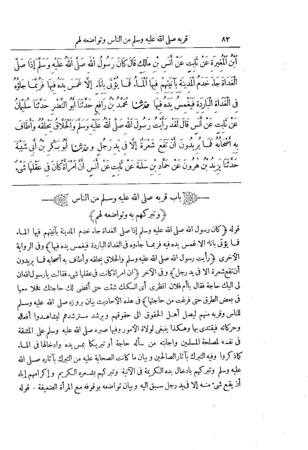 [2324] (كَانَ رَسُولُ اللَّهِ صَلَّى اللَّهُ عَلَيْهِ وَسَلَّمَ إِذَا صَلَّى الْغَدَاةَ جَاءَ خَدَمُ الْمَدِينَةِ بِآنِيَتِهِمْ فِيهَا الْمَاءُ فَمَا يُؤْتَى بِإِنَاءٍ إِلَّا غَمَسَ يَدَهُ فِيهَا فَرُبَّمَا جَاءُوهُ فِي الْغَدَاةِ الْبَارِدَةِ فَيَغْمِسُ يَدَهُ فِيهَا) وَفِي الرِّوَايَةِ الْأُخْرَى