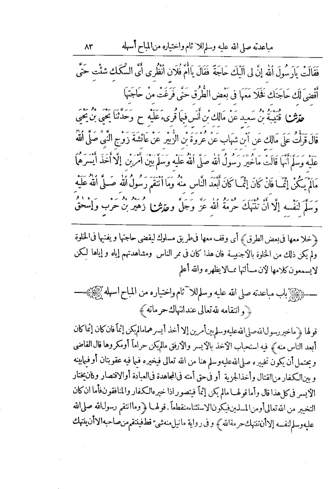 [2327] (ماخير رَسُولُ اللَّهِ صَلَّى اللَّهُ عَلَيْهِ وَسَلَّمَ بَيْنَ أَمْرَيْنِ إِلَّا أَخَذَ أَيْسَرَهُمَا مَا لَمْ يَكُنْ إِثْمًا فَإِنْ كَانَ إِثْمًا كَانَ أَبْعَدَ النَّاسِ منه) فيه استحباب الأخذبالأيسر وَالْأَرْفَقِ مَا لَمْ يَكُنْ حَرَامًا أَوْ مَكْرُوهًا قَالَ الْقَاضِي وَيَحْتَمِلُ أَنْ يَكُونَ تَخْيِيرُهُ صَلَّى اللَّهُ عَلَيْهِ وَسَلَّمَ هُنَا مِنَ اللَّهِ تَعَالَى فَيُخَيِّرُهُ فِيمَا فِيهِ عُقُوبَتَانِ أَوْ فِيمَا بَيْنَهُ وَبَيْنَ الْكُفَّارِ مِنَ الْقِتَالِ وَأَخْذِ الْجِزْيَةِ أَوْ فِي حَقِّ أُمَّتِهِ فِي الْمُجَاهَدَةِ فِي الْعِبَادَةِ أَوِ الِاقْتِصَارِ وَكَانَ يَخْتَارُ الْأَيْسَرَ فِي كُلِّ هَذَا قَالَ وَأَمَّا قَوْلُهَا مَا لَمْ يَكُنْ إثما فيتصوراذا خَيَّرَهُ الْكُفَّارُ وَالْمُنَافِقُونَ فَأَمَّا إِنْ كَانَ التَّخْيِيرُ مِنَ اللَّهِ تَعَالَى أَوْ مِنَ الْمُسْلِمِينَ فَيَكُونُ الِاسْتِثْنَاءُ مُنْقَطِعًا قَوْلُهَا (وَمَا انْتَقَمَ رَسُولُ اللَّهِ صَلَّى اللَّهُ عَلَيْهِ وَسَلَّمَ لِنَفْسِهِ إِلَّا أَنْ تُنْتَهَكَ حُرْمَةُ اللَّهِ) وَفِي رِوَايَةٍ