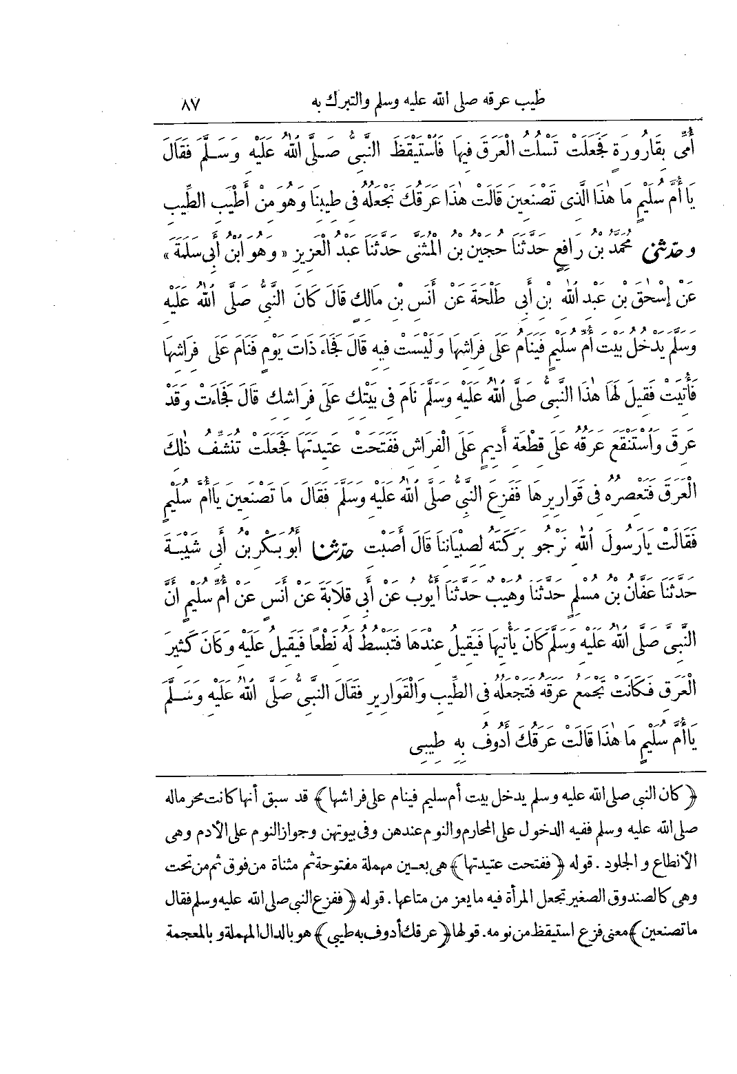 (كَانَ النَّبِيُّ صَلَّى اللَّهُ عَلَيْهِ وَسَلَّمَ يَدْخُلُ بَيْتَ أُمِّ سُلَيْمٍ فَيَنَامُ عَلَى فِرَاشِهَا) قَدْ سَبَقَ أَنَّهَا كَانَتْ مَحْرَمًا لَهُ صَلَّى اللَّهُ عَلَيْهِ وَسَلَّمَ فَفِيهِ الدُّخُولُ عَلَى الْمَحَارِمِ وَالنَّوْمُ عِنْدَهُنَّ وَفِي بُيُوتِهِنَّ وَجَوَازُ النَّوْمِ عَلَى الْأُدُمِ وَهِيَ الْأَنْطَاعِ وَالْجُلُودِ قَوْلُهُ (فَفَتَحَتْ عَتِيدَتَهَا) هِيَ بِعَيْنٍ مُهْمَلَةٍ مَفْتُوحَةٍ ثُمَّ مُثَنَّاةٍ مِنْ فَوْقُ ثُمَّ مِنْ تَحْتُ وَهِيَ كَالصُّنْدُوقِ الصَّغِيرِ تَجْعَلُ الْمَرْأَةُ فِيهِ مَا يَعِزُّ مِنْ مَتَاعِهَا قَوْلُهُ (فَفَزِعَ النَّبِيُّ صَلَّى اللَّهُ عَلَيْهِ وَسَلَّمَ فَقَالَ مَا تَصْنَعِينَ) مَعْنَى فَزِعَ اسْتَيْقَظَ مِنْ نَوْمِهِ قَوْلُهَا
