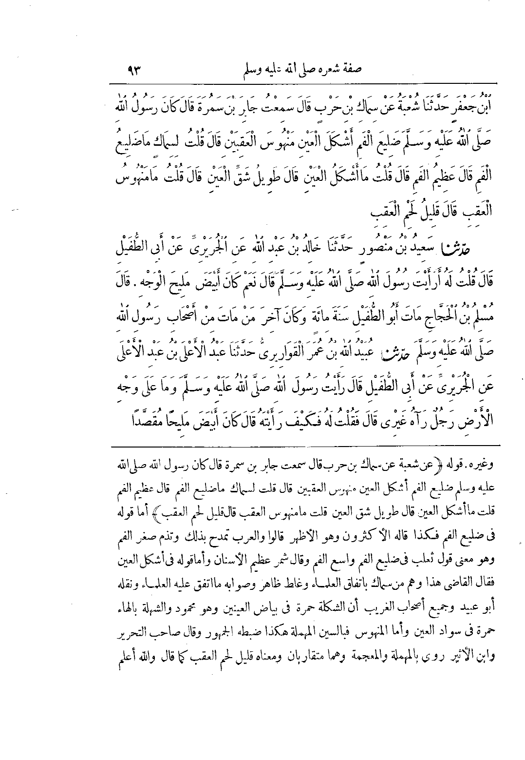 [2339] (عَنْ شُعْبَةَ عَنْ سِمَاكِ بْنِ حَرْبٍ قَالَ سَمِعْتُ جَابِرَ بْنَ سَمُرَةَ قَالَ كَانَ رَسُولُ اللَّهِ صَلَّى اللَّهُ عَلَيْهِ وَسَلَّمَ ضَلِيعَ الْفَمِ أَشْكَلَ الْعَيْنِ مَنْهُوسَ الْعَقِبَيْنِ قَالَ قُلْتُ لِسِمَاكٍ مَا ضَلِيعُ الْفَمِ قَالَ عَظِيمُ الْفَمِ قُلْتُ مَا أَشْكَلُ الْعَيْنِ قَالَ طَوِيلُ شَقِّ الْعَيْنِ قُلْتُ مَا مَنْهُوسُ الْعَقِبِ قَالَ قليل لحم العقب) أما قَوْلُهُ فِي ضَلِيعِ الْفَمِ فَكَذَا قَالَهُ الْأَكْثَرُونَ وَهُوَ الْأَظْهَرُ قَالُوا وَالْعَرَبُ تَمْدَحُ بِذَلِكَ وَتَذُمُّ صِغَرَ الْفَمِ وَهُوَ مَعْنَى قَوْلِ ثَعْلَبٍ فِي ضَلِيعِ الْفَمِ وَاسِعُ الْفَمِ وَقَالَ شِمْرٌ عَظِيمُ الْأَسْنَانِ وَأَمَّا قَوْلُهُ فِي أَشْكَلِ الْعَيْنِ فَقَالَ الْقَاضِي هَذَا وَهْمٌ مِنْ سِمَاكٍ بِاتِّفَاقِ الْعُلَمَاءِ وَغَلَطٌ ظَاهِرٌ وَصَوَابُهُ مَا اتَّفَقَ عَلَيْهِ الْعُلَمَاءُ وَنَقَلَهُ أَبُو عُبَيْدٍ وَجَمِيعُ أَصْحَابِ الْغَرِيبِ أَنَّ الشُّكْلَةَ حُمْرَةٌ فِي بَيَاضِ الْعَيْنَيْنِ وَهُوَ مَحْمُودٌ وَالشُّهْلَةُ بِالْهَاءِ حُمْرَةٌ فِي سَوَادِ الْعَيْنِ وَأَمَّا الْمَنْهُوسُ فَبِالسِّينِ الْمُهْمَلَةِ هَكَذَا ضَبَطَهُ الْجُمْهُورُ وَقَالَ صاحب التحرير وبن الْأَثِيرِ رُوِيَ بِالْمُهْمَلَةِ وَالْمُعْجَمَةِ وَهُمَا مُتَقَارِبَانِ وَمَعْنَاهُ قَلِيلُ لَحْمِ الْعَقِبِ كَمَا قَالَ وَاللَّهُ أَعْلَمُ