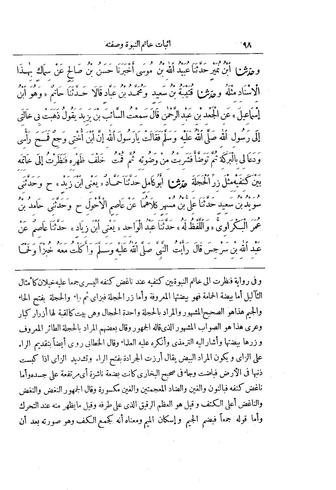 [2346] رِوَايَةٍ فَنَظَرْتُ إِلَى خَاتَمِ النُّبُوَّةِ بَيْنَ كَتِفَيْهِ عِنْدَ نَاغِضِ كَتِفِهِ الْيُسْرَى جُمْعًا عَلَيْهِ خِيلَانٌ كَأَمْثَالِ الثَّآلِيلِ أَمَّا بَيْضَةُ الْحَمَامَةِ فَهُوَ بيضتها المعروفة واما زر الحجلة فبزاي ثم ياء وَالْحَجَلَةُ بِفَتْحِ الْحَاءِ وَالْجِيمِ هَذَا هُوَ الصَّحِيحُ الْمَشْهُورُ الَّذِي قَالَهُ الْجُمْهُورُ وَقَالَ بَعْضُهُمْ الْمُرَادُ بِالْحَجْلَةِ وَاحِدَةُ الْحِجَالِ وَهِيَ بَيْتٌ كَالْقُبَّةِ لَهَا أزرار كباز وَعُرًى هَذَا هُوَ الصَّوَابُ الْمَشْهُورُ الَّذِي قَالَهُ الْجُمْهُورُ وَقَالَ بَعْضُهُمْ الْمُرَادُ بِالْحَجَلَةِ الطَّائِرُ الْمَعْرُوفُ وَزِرُّهَا بَيْضَتُهَا وَأَشَارَ إِلَيْهِ التِّرْمِذِيُّ وَأَنْكَرَهُ عَلَيْهِ الْعُلَمَاءُ وَقَالَ الْخَطَّابِيُّ رُوِيَ أَيْضًا بِتَقْدِيمِ الرَّاءِ عَلَى الزَّايِ وَيَكُونُ الْمُرَادُ الْبَيْضَ يُقَالُ أَرَزَّتِ الْجَرَادَةُ بِفَتْحِ الرَّاءِ وَتَشْدِيدِ الزَّايِ إِذَا كَبَسَتْ ذَنَبَهَا فِي الْأَرْضِ فَبَاضَتْ وَجَاءَ فِي صَحِيحِ الْبُخَارِيِّ كَانَتْ بِضْعَةً نَاشِزَةً أَيْ مُرْتَفِعَةً عَلَى جَسَدِهِ وَأَمَّا نَاغِضُ كَتِفِهِ فَبِالنُّونِ وَالْغَيْنِ وَالضَّادِ الْمُعْجَمَتَيْنِ وَالْغَيْنُ مَكْسُورَةٌ وَقَالَ الْجُمْهُورُ النُّغْضُ وَالنَّغْضُ وَالنَّاغِضُ أَعْلَى الْكَتِفِ وَقِيلَ هُوَ الْعَظْمُ الرَّقِيقُ الَّذِي عَلَى طَرَفِهِ وَقِيلَ مَا يَظْهَرُ مِنْهُ عِنْدَ التَّحَرُّكِ وَأَمَّا قَوْلُهُ جُمْعًا فَبِضَمِّ الْجِيمِ وَإِسْكَانِ الْمِيمِ وَمَعْنَاهُ أَنَّهُ كَجَمْعِ الْكَفِّ وَهُوَ صُورَتُهُ بَعْدَ أَنْ