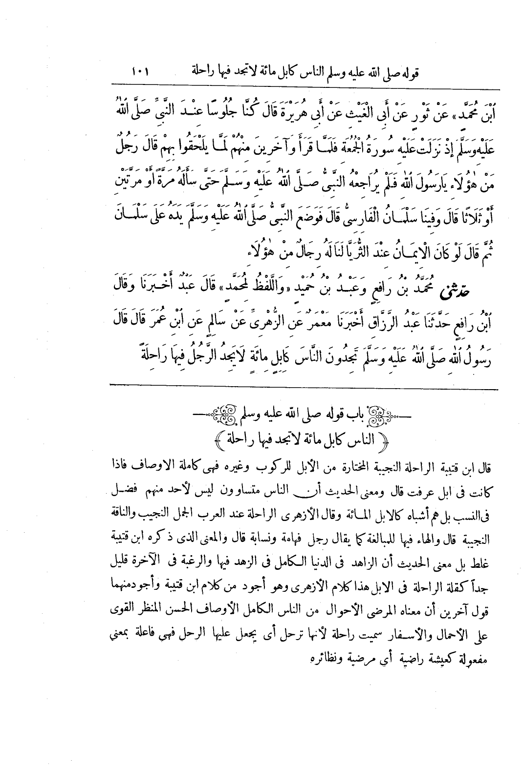 [2547] قال بن قُتَيْبَةَ الرَّاحِلَةُ النَّجِيبَةُ الْمُخْتَارَةُ مِنَ الْإِبِلِ لِلرُّكُوبِ وَغَيْرِهِ فَهِيَ كَامِلَةُ الْأَوْصَافِ فَإِذَا كَانَتْ فِي إِبِلٍ عُرِفَتْ قَالَ وَمَعْنَى الْحَدِيثِ أَنَّ النَّاسَ مُتَسَاوُونَ لَيْسَ لِأَحَدٍ مِنْهُمْ فَضْلٌ فِي النَّسَبِ بَلْ هُمْ أَشْبَاهٌ كَالْإِبِلِ الْمِائَةِ وَقَالَ الْأَزْهَرِيُّ الرَّاحِلَةُ عِنْدَ الْعَرَبِ الْجَمَلُ النَّجِيبُ وَالنَّاقَةُ النَّجِيبَةُ قَالَ وَالْهَاءُ فِيهَا لِلْمُبَالَغَةِ كَمَا يُقَالُ رَجُلٌ فهامة ونسابة قال والمعنى الذي ذكره بن قُتَيْبَةَ غَلَطٌ بَلْ مَعْنَى الْحَدِيثِ أَنَّ الزَّاهِدَ فِي الدُّنْيَا الْكَامِلَ فِي الزُّهْدِ فِيهَا وَالرَّغْبَةِ فِي الْآخِرَةِ قَلِيلٌ جِدًّا كَقِلَّةِ الرَّاحِلَةِ فِي الْإِبِلِ هَذَا كَلَامُ الْأَزْهَرِيِّ وَهُوَ أَجْوَدُ مِنْ كلام بن قُتَيْبَةَ وَأَجْوَدُ مِنْهُمَا قَوْلُ آخَرِينَ أَنَّ مَعْنَاهُ الْمَرْضِيُّ الْأَحْوَالُ مِنَ النَّاسِ الْكَامِلُ الْأَوْصَافُ الْحَسَنُ الْمَنْظَرُ الْقَوِيُّ عَلَى الْأَحْمَالِ وَالْأَسْفَارِ سُمِّيَتْ رَاحِلَةً لِأَنَّهَا تَرْحَلُ أَيْ يُجْعَلُ عَلَيْهَا الرَّحْلُ فَهِيَ فَاعِلَةٌ بِمَعْنَى مَفْعُولَةٌ كَعِيشَةٍ رَاضِيَةٍ أَيْ مَرْضِيَّةٍ ونظائره