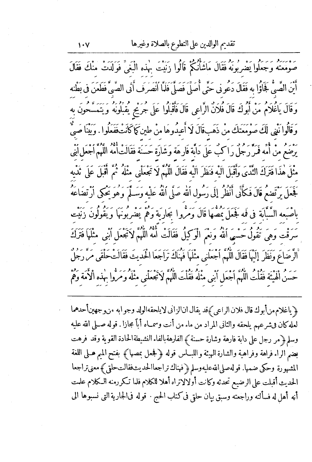 (يَا غُلَامُ مَنْ أَبُوكَ قَالَ فُلَانٌ الرَّاعِي) قَدْ يُقَالُ إِنَّ الزَّانِيَ لَا يَلْحَقَهُ الْوَلَدُ وَجَوَابُهُ مِنْ وَجْهَيْنِ أَحَدُهُمَا لَعَلَّهُ كَانَ فِي شَرْعِهِمْ يَلْحَقُهُ وَالثَّانِي الْمُرَادُ مِنْ مَاءِ مَنْ أَنْتَ وَسَمَّاهُ أَبًا مَجَازًا قَوْلُهُ صَلَّى اللَّهُ عَلَيْهِ وَسَلَّمَ (مَرَّ رَجُلٌ عَلَى دَابَّةٍ فَارِهَةٍ وَشَارَةٍ حَسَنَةٍ) الْفَارِهَةُ بِالْفَاءِ النَّشِيطَةُ الْحَادَّةُ الْقَوِيَّةُ وَقَدْ فَرُهْتُ بِضَمِّ الرَّاءِ فَرَاهَةً وَفَرَاهِيَةً وَالشَّارَةُ الْهَيْئَةُ وَاللِّبَاسُ قَوْلُهُ (فَجَعَلَ يَمَصُّهَا) بِفَتْحِ الْمِيمِ عَلَى اللُّغَةِ الْمَشْهُورَةِ وَحُكِيَ ضَمُّهَا قَوْلُهُ صَلَّى اللَّهُ عَلَيْهِ وَسَلَّمَ (فَهُنَاكَ تَرَاجَعَا الْحَدِيثَ فَقَالَتْ حَلْقَى) مَعْنَى تَرَاجَعَا الْحَدِيثَ أَقْبَلَتْ عَلَى الرَّضِيعِ تُحَدِّثُهُ وَكَانَتْ أَوَّلًا لَا تَرَاهُ أَهْلًا لِلْكَلَامِ فَلَمَّا تَكَرَّرَ مِنْهُ الْكَلَامَ عَلِمَتْ أَنَّهُ أَهْلٌ لَهُ فَسَأَلَتْهُ وَرَاجَعَتْهُ وَسَبَقَ بَيَانُ حَلْقَى فِي كِتَابِ الْحَجِّ قَوْلُهُ فِي الْجَارِيَةِ الَّتِي نَسَبُوهَا إلى