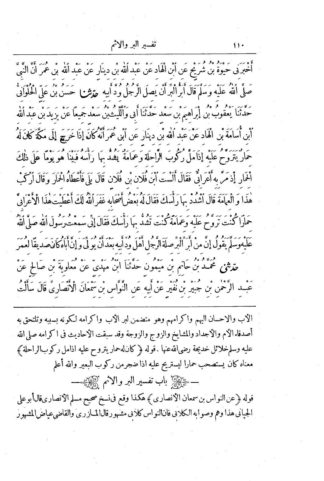 الْأَبِ وَالْإِحْسَانِ إِلَيْهِمْ وَإِكْرَامِهِمْ وَهُوَ مُتَضَمِّنٌ لِبِرِّ الْأَبِ وَإِكْرَامِهِ لِكَوْنِهِ بِسَبَبِهِ وَتَلْتَحِقُ بِهِ أَصْدِقَاءُ الْأُمِّ وَالْأَجْدَادِ وَالْمَشَايِخِ وَالزَّوْجِ وَالزَّوْجَةِ وَقَدْ سَبَقَتِ الْأَحَادِيثُ فِي إِكْرَامِهِ صَلَّى اللَّهُ عَلَيْهِ وَسَلَّمَ خَلَائِلَ خَدِيجَةَ رَضِيَ اللَّهُ عَنْهَا قَوْلُهُ (كَانَ لَهُ حِمَارٌ يَتَرَوَّحُ عَلَيْهِ إِذَا مَلَّ رُكُوبَ الرَّاحِلَةِ) مَعْنَاهُ كَانَ يَسْتَصْحِبُ حِمَارًا لِيَسْتَرِيحَ عَلَيْهِ إِذَا ضَجِرَ مِنْ رُكُوبِ الْبَعِيرِ وَاَللَّهُ أَعْلَمُ