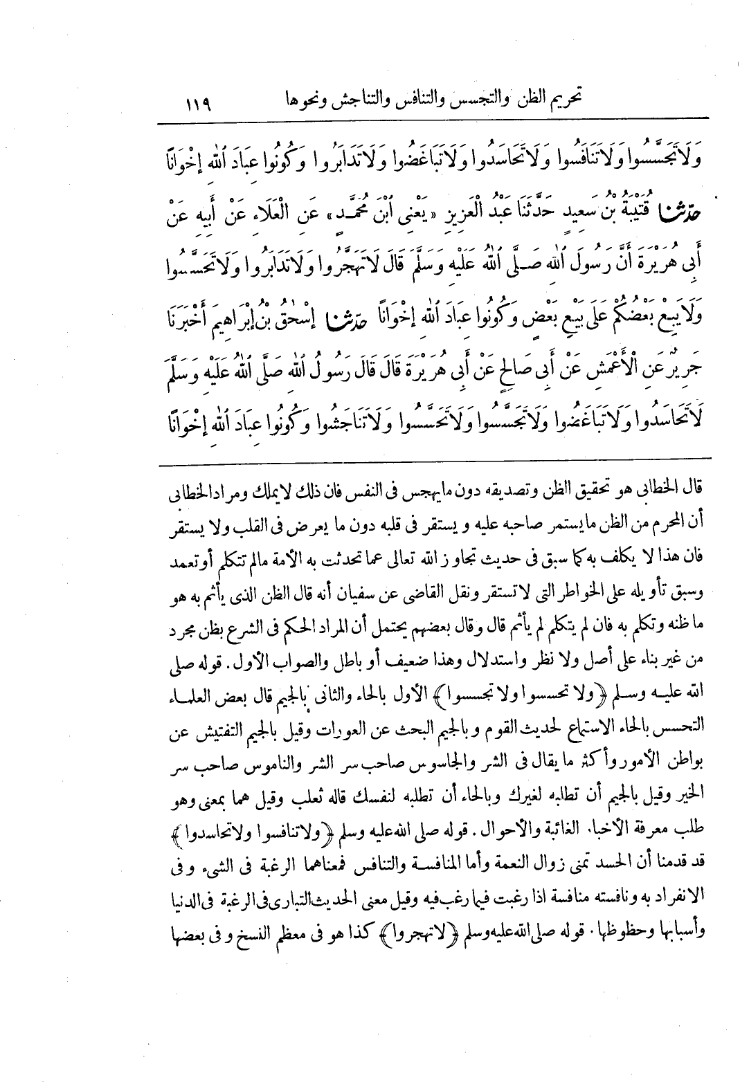 قَالَ الْخَطَّابِيُّ هُوَ تَحْقِيقُ الظَّنِّ وَتَصْدِيقُهُ دُونَ مَا يَهْجِسُ فِي النَّفْسِ فَإِنَّ ذَلِكَ لَا يُمْلَكُ وَمُرَادُ الْخَطَّابِيِّ أَنَّ الْمُحَرَّمَ مِنَ الظَّنِّ مَا يَسْتَمِرُّ صَاحِبُهُ عَلَيْهِ وَيَسْتَقِرُّ فِي قَلْبِهِ دُونَ مَا يَعْرِضُ فِي الْقَلْبِ وَلَا يَسْتَقِرُّ فَإِنَّ هَذَا لَا يُكَلَّفُ بِهِ كَمَا سَبَقَ فِي حَدِيثِ تَجَاوَزَ اللَّهُ تَعَالَى عَمَّا تَحَدَّثَتْ به الأمة مالم تَتَكَلَّمْ أَوْ تَعْمِدْ وَسَبَقَ تَأْوِيلُهُ عَلَى الْخَوَاطِرِ الَّتِي لَا تَسْتَقِرُّ وَنَقَلَ الْقَاضِي عَنْ سُفْيَانَ أَنَّهُ قَالَ الظَّنُّ الَّذِي يَأْثَمُ بِهِ هُوَ مَا ظَنَّهُ وَتَكَلَّمَ بِهِ فَإِنْ لَمْ يَتَكَلَّمْ لَمْ يَأْثَمْ قَالَ وَقَالَ بَعْضُهُمْ يُحْتَمَلُ أَنَّ الْمُرَادَ الْحُكْمُ فِي الشَّرْعِ بِظَنٍّ مُجَرَّدٍ مِنْ غَيْرِ بِنَاءٍ عَلَى أَصْلٍ وَلَا نَظَرٍ وَاسْتِدْلَالٍ وَهَذَا ضَعِيفٌ أَوْ بَاطِلٌ وَالصَّوَابُ الْأَوَّلُ قَوْلُهُ صَلَّى اللَّهُ عَلَيْهِ وَسَلَّمَ (وَلَا تَحَسَّسُوا وَلَا تَجَسَّسُوا) الْأَوَّلُ بِالْحَاءِ وَالثَّانِي بِالْجِيمِ قَالَ بَعْضُ الْعُلَمَاءِ التَّحَسُّسُ بِالْحَاءِ الِاسْتِمَاعُ لِحَدِيثِ الْقَوْمِ وَبِالْجِيمِ الْبَحْثُ عَنِ الْعَوْرَاتِ وَقِيلَ بِالْجِيمِ التَّفْتِيشُ عَنْ بَوَاطِنِ الْأُمُورِ وَأَكْثَرُ مَا يُقَالُ فِي الشَّرِّ وَالْجَاسُوسُ صَاحِبُ سِرِّ الشَّرِّ وَالنَّامُوسُ صَاحِبُ سِرِّ الْخَيْرِ وَقِيلَ بِالْجِيمِ أَنْ تَطْلُبُهُ لِغَيْرِكَ وَبِالْحَاءِ أَنْ تَطْلُبَهُ لِنَفْسِكَ قَالَهُ ثَعْلَبٌ وَقِيلَ هُمَا بِمَعْنًى وَهُوَ طَلَبُ مَعْرِفَةِ الْأَخْبَارِ الْغَائِبَةِ وَالْأَحْوَالِ قَوْلُهُ صَلَّى اللَّهُ عَلَيْهِ وَسَلَّمَ (وَلَا تَنَافَسُوا وَلَا تَحَاسَدُوا) قَدْ قَدَّمْنَا أَنَّ الْحَسَدَ تَمَنِّي زَوَالِ النِّعْمَةِ وَأَمَّا الْمُنَافَسَةُ وَالتَّنَافُسُ فَمَعْنَاهُمَا الرَّغْبَةُ في الشئ وَفِي الِانْفِرَادِ بِهِ وَنَافَسْتُهُ مُنَافَسَةً إِذَا رَغِبْتُ فيما رغب فيه قيل مَعْنَى الْحَدِيثِ التَّبَارِي فِي الرَّغْبَةِ فِي الدُّنْيَا وَأَسْبَابِهَا وَحُظُوظِهَا قَوْلُهُ صَلَّى اللَّهُ عَلَيْهِ وَسَلَّمَ (لَا تَهْجُرُوا) كَذَا هُوَ فِي مُعْظَمِ النُّسَخِ وَفِي بَعْضِهَا