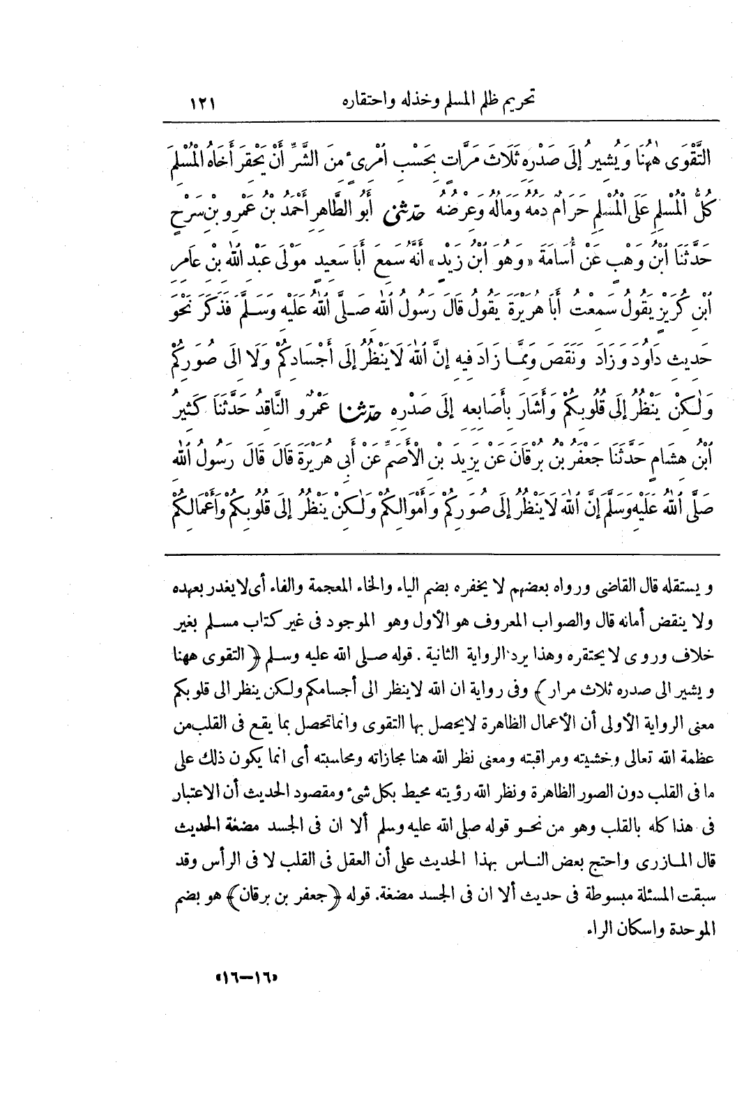 وَيَسْتَقِلُّهُ قَالَ الْقَاضِي وَرَوَاهُ بَعْضُهُمْ لَا يَخْفِرُهُ بِضَمِّ الْيَاءِ وَالْخَاءِ الْمُعْجَمَةِ وَالْفَاءِ أَيْ لَا يَغْدِرُ بِعَهْدِهِ وَلَا يَنْقُضُ أَمَانَهُ قَالَ وَالصَّوَابُ الْمَعْرُوفُ هُوَ الْأَوَّلُ وَهُوَ الْمَوْجُودُ فِي غَيْرِ كِتَابِ مُسْلِمٍ بِغَيْرِ خِلَافٍ وَرُوِيَ لَا يَحْتَقِرُهُ وَهَذَا يَرُدُّ الرِّوَايَةَ الثَّانِيَةَ قَوْلُهُ صَلَّى اللَّهُ عليه وسلم (التقوى ها هنا وَيُشِيرُ إِلَى صَدْرِهِ ثَلَاثَ مِرَارٍ) وَفِي رِوَايَةٍ إِنَّ اللَّهَ لَا يَنْظُرُ إِلَى أَجْسَامِكُمْ وَلَكِنْ يَنْظُرُ إِلَى قُلُوبِكُمْ مَعْنَى الرِّوَايَةِ الْأُولَى أَنَّ الْأَعْمَالَ الظَّاهِرَةَ لَا يَحْصُلُ بِهَا التَّقْوَى وَإِنَّمَا تَحْصُلُ بِمَا يَقَعُ فِي الْقَلْبِ مِنْ عَظَمَةِ الله تعالى وخشيته ومراقبته ومعنى نظرالله هُنَا مُجَازَاتُهُ وَمُحَاسَبَتُهُ أَيْ إِنَّمَا يَكُونُ ذَلِكَ على مافي الْقَلْبِ دُونَ الصُّوَرِ الظَّاهِرَةِ وَنَظَرُ اللَّهِ رُؤْيَتُهُ محيط بكل شئ وَمَقْصُودُ الْحَدِيثِ أَنَّ الِاعْتِبَارَ فِي هَذَا كُلِّهِ بِالْقَلْبِ وَهُوَ مِنْ نَحْوِ قَوْلُهُ صَلَّى اللَّهُ عَلَيْهِ وَسَلَّمَ إِلَّا أَنْ فِي الْجَسَدِ مُضْغَةٌ الْحَدِيثَ قَالَ الْمَازِرِيُّ وَاحْتَجَّ بَعْضُ النَّاسِ بِهَذَا الْحَدِيثِ عَلَى أَنَّ الْعَقْلَ فِي الْقَلْبِ لَا فِي الرَّأْسِ وَقَدْ سَبَقَتِ الْمَسْأَلَةُ مَبْسُوطَةٌ فِي حَدِيثِ أَلَا إِنَّ فِي الْجَسَدِ مُضْغَةٌ قَوْلُهُ (جعفر بن برقان) هوبضم الْمُوَحَّدَةِ وَإِسْكَانِ الرَّاءِ