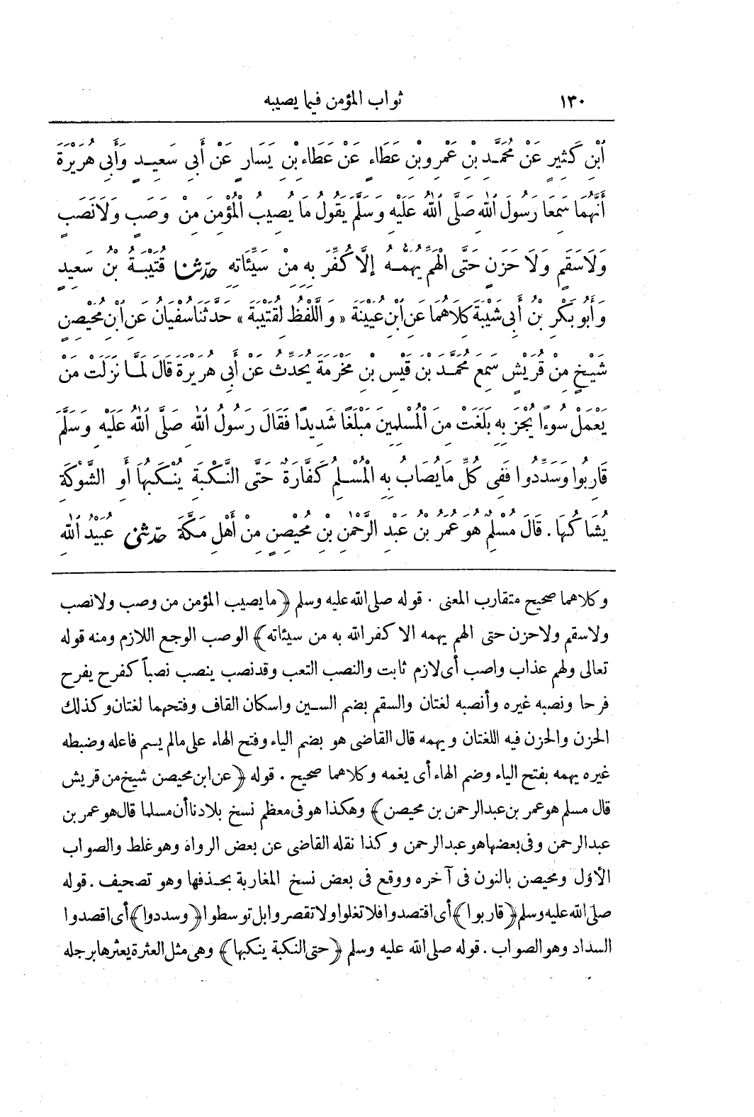 [2574] (عن بن مُحَيْصِنٍ شَيْخٍ مِنْ قُرَيْشٍ قَالَ مُسْلِمٌ هُوَ عُمَرُ بْنُ عَبْدِ الرَّحْمَنِ بْنِ مُحَيْصِنٍ) وَهَكَذَا هُوَ فِي مُعْظَمِ نُسَخِ بِلَادِنَا أَنَّ مُسْلِمًا قَالَ هُوَ عُمَرُ بْنُ عَبْدِ الرَّحْمَنَ وَفِي بَعْضِهَا هُوَ عَبْدُ الرَّحْمَنِ وَكَذَا نَقَلَهُ الْقَاضِي عَنْ بَعْضِ الرُّوَاةِ وَهُوَ غَلَطٌ وَالصَّوَابُ الْأَوَّلُ وَمُحَيْصِنُ بِالنُّونِ فِي آخِرِهِ وَوَقَعَ فِي بَعْضِ نُسَخِ الْمَغَارِبَةِ بِحَذْفِهَا وَهُوَ تَصْحِيفٌ قَوْلُهُ صَلَّى اللَّهُ عَلَيْهِ وَسَلَّمَ (قَارِبُوا) أَيْ اقْتَصِدُوا فَلَا تَغْلُوا وَلَا تُقَصِّرُوا بَلْ تَوَسَّطُوا (وَسَدِّدُوا) أَيْ اقْصِدُوا السَّدَادَ وَهُوَ الصَّوَابُ قَوْلُهُ صَلَّى اللَّهُ عَلَيْهِ وَسَلَّمَ (حَتَّى النُّكْبَةَ يَنْكُبُهَا) وَهِيَ مِثْلُ الْعَثْرَةِ يَعْثُرُهَا بِرِجْلِهِ