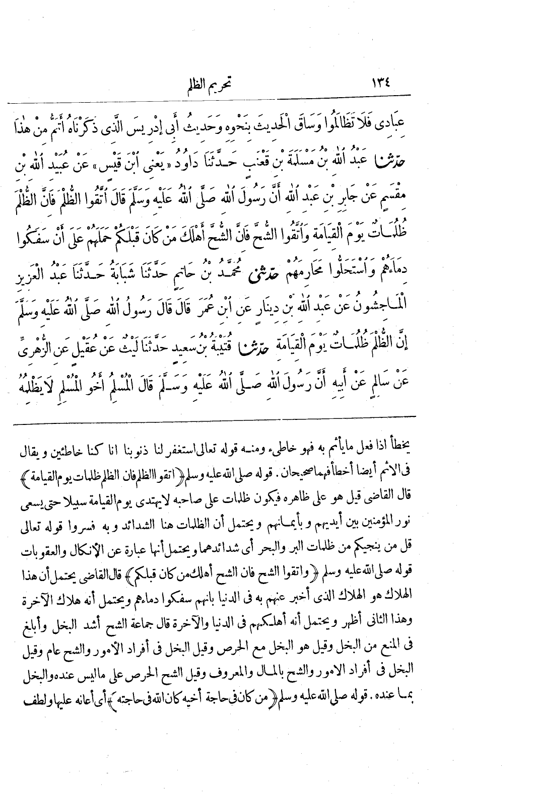 [2579] (اتَّقُوا الظُّلْمَ فَإِنَّ الظُّلْمَ ظُلُمَاتٌ يَوْمَ الْقِيَامَةِ) قَالَ الْقَاضِي قِيلَ هُوَ عَلَى ظَاهِرِهِ فَيَكُونُ ظُلُمَاتٍ عَلَى صَاحِبِهِ لَا يَهْتَدِي يَوْمَ الْقِيَامَةِ سَبِيلًا حَتَّى يَسْعَى نُورُ الْمُؤْمِنِينَ بَيْنَ أَيْدِيِهِمْ وَبِأَيْمَانِهِمْ وَيُحْتَمَلُ أَنَّ الظُّلُمَاتِ هُنَا الشَّدَائِدُ وَبِهِ فَسَّرُوا قَوْلَهُ تَعَالَى قُلْ مَنْ يُنْجِيكُمْ مِنْ ظُلُمَاتِ الْبَرِّ والبحر أَيْ شَدَائِدِهِمَا وَيُحْتَمَلُ أَنَّهَا عِبَارَةٌ عَنِ الْأَنْكَالِ وَالْعُقُوبَاتِ قَوْلُهُ صَلَّى اللَّهُ عَلَيْهِ وَسَلَّمَ (وَاتَّقُوا الشُّحَّ فَإِنَّ الشُّحَّ أَهْلَكَ مَنْ كَانَ قَبْلَكُمْ) قَالَ الْقَاضِي يُحْتَمَلُ أَنَّ هَذَا الْهَلَاكَ هُوَ الهلاك الذي أخبر عنهم بِهِ فِي الدُّنْيَا بِأَنَّهُمْ سَفَكُوا دِمَاءَهُمْ وَيُحْتَمَلُ أَنَّهُ هَلَاكُ الْآخِرَةِ وَهَذَا الثَّانِي أَظْهَرُ وَيُحْتَمَلُ أَنَّهُ أَهْلَكَهُمْ فِي الدُّنْيَا وَالْآخِرَةِ قَالَ جَمَاعَةُ الشُّحُّ أَشَدُّ الْبُخْلِ وَأَبْلَغُ فِي الْمَنْعِ مِنَ الْبُخْلِ وَقِيلَ هُوَ الْبُخْلُ مَعَ الْحِرْصِ وَقِيلَ الْبُخْلُ فِي أَفْرَادِ الْأُمُورِ وَالشُّحُّ عَامٌّ وَقِيلَ الْبُخْلُ فِي أَفْرَادِ الْأُمُورِ وَالشُّحُّ بِالْمَالِ وَالْمَعْرُوفِ وقيل الشح الحرص على ماليس عِنْدَهُ وَالْبُخْلُ بِمَا عِنْدَهُ قَوْلُهُ صَلَّى اللَّهُ عَلَيْهِ وَسَلَّمَ