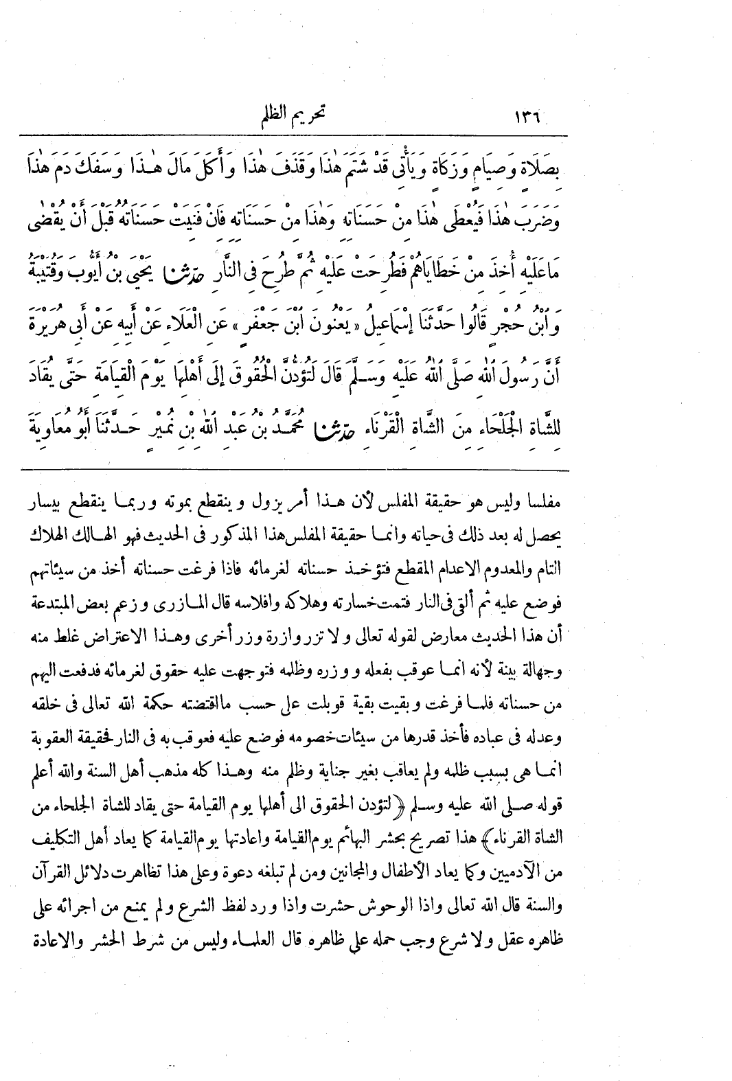 [2582] 0لَتُؤَدُّنَّ الْحُقُوقَ إِلَى أَهْلِهَا يَوْمَ الْقِيَامَةِ حَتَّى يُقَادَ لِلشَّاةِ الْجَلْحَاءِ مِنَ الشَّاةِ الْقَرْنَاءِ) هَذَا تَصْرِيحٌ بِحَشْرِ الْبَهَائِمِ يَوْمَ الْقِيَامَةِ وَإِعَادَتِهَا يَوْمَ الْقِيَامَةِ كَمَا يُعَادُ أَهْلُ التَّكْلِيفِ مِنَ الْآدَمِيِّينَ وَكَمَا يُعَادُ الْأَطْفَالُ وَالْمَجَانِينُ وَمَنْ لَمْ تَبْلُغْهُ دَعْوَةٌ وَعَلَى هَذَا تَظَاهَرَتْ دَلَائِلُ الْقُرْآنِ وَالسُّنَّةِ قَالَ اللَّهُ تَعَالَى وَإِذَا الْوُحُوشُ حشرت وَإِذَا وَرَدَ لَفْظُ الشَّرْعِ وَلَمْ يَمْنَعْ مِنْ إِجْرَائِهِ عَلَى ظَاهِرِهِ عَقْلٌ وَلَا شَرْعٌ وَجَبَ حَمْلُهُ عَلَى ظَاهِرِهِ قَالَ الْعُلَمَاءُ وَلَيْسَ مِنْ شَرْطِ الْحَشْرِ وَالْإِعَادَةِ