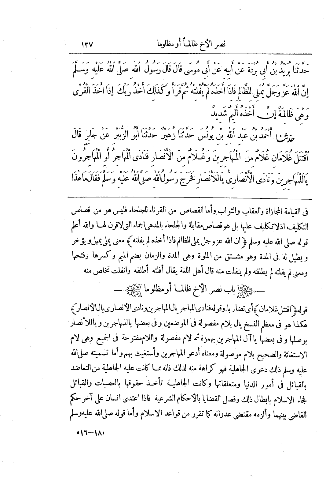 [2584] (اقْتَتَلَ غُلَامَانِ) أَيْ تَضَارَبَا وَقَوْلُهُ فَنَادَى المهاجر يال المهاجرين ونادى الانصاري يال الانصار) هَكَذَا هُوَ فِي مُعْظَمِ النُّسَخِ يَالَ بِلَامٍ مَفْصُولَةٍ فِي الْمَوْضِعَيْنِ وَفِي بَعْضِهَا يَا لَلْمُهَاجِرِينَ وَيَا لَلْأَنْصَارِ بِوَصْلِهَا وَفِي بَعْضِهَا يَا آلَ الْمُهَاجِرِينَ بِهَمْزَةٍ ثُمَّ لَامٍ مَفْصُولَةٍ وَاللَّامُ مَفْتُوحَةٌ فِي الْجَمِيعِ وَهِيَ لَامُ الِاسْتِغَاثَةِ وَالصَّحِيحُ بِلَامٍ مَوْصُولَةٍ وَمَعْنَاهُ أَدْعُو الْمُهَاجِرِينَ وَأَسْتَغِيثُ بِهِمْ وَأَمَّا تَسْمِيَتُهُ صَلَّى اللَّهُ عَلَيْهِ وَسَلَّمَ ذَلِكَ دَعْوَى الْجَاهِلِيَّةِ فَهُوَ كَرَاهَةٌ مِنْهُ لِذَلِكَ فَإِنَّهُ مِمَّا كَانَتْ عَلَيْهِ الْجَاهِلِيَّةُ مِنَ التَّعَاضُدِ بِالْقَبَائِلِ فِي أُمُورِ الدُّنْيَا وَمُتَعَلِّقَاتِهَا وَكَانَتِ الْجَاهِلِيَّةُ تَأْخُذُ حُقُوقَهَا بِالْعَصَبَاتِ وَالْقَبَائِلِ فَجَاءَ الْإِسْلَامُ بِإِبْطَالِ ذَلِكَ وَفَصَلِ الْقَضَايَا بِالْأَحْكَامِ الشَّرْعِيَّةِ فَإِذَا اعْتَدَى إِنْسَانٌ عَلَى آخَرَ حَكَمَ الْقَاضِي بَيْنَهُمَا وَأَلْزَمَهُ مُقْتَضَى عِدْوَانِهِ كَمَا تَقَرَّرَ مِنْ قَوَاعِدِ الْإِسْلَامِ وَأَمَّا قَوْلُهُ صَلَّى اللَّهُ عَلَيْهِ وَسَلَّمَ