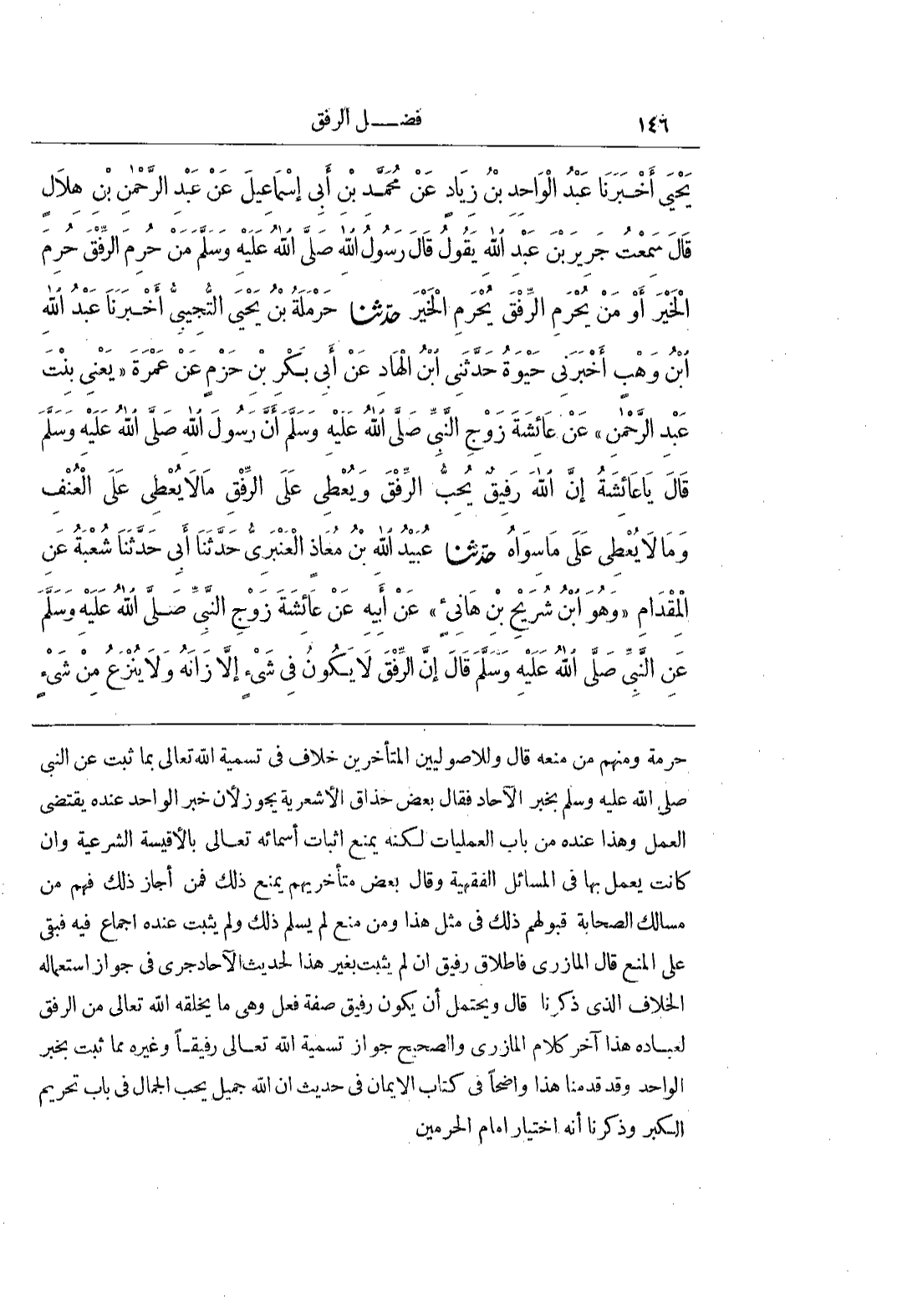 حُرْمَةٍ وَمِنْهُمْ مَنْ مَنَعَهُ قَالَ وَلِلْأُصُولِيِّينَ الْمُتَأَخِّرِينَ خِلَافٌ فِي تَسْمِيَةِ اللَّهِ تَعَالَى بِمَا ثَبَتَ عَنِ النَّبِيِّ صَلَّى اللَّهُ عَلَيْهِ وَسَلَّمَ بِخَبَرِ الْآحَادِ فَقَالَ بَعْضُ حُذَّاقِ الْأَشْعَرِيَّةِ يَجُوزُ لِأَنَّ خَبَرَ الْوَاحِدِ عِنْدَهُ يَقْتَضِي الْعَمَلَ وَهَذَا عِنْدَهُ مِنْ بَابِ الْعَمَلِيَّاتِ لَكِنَّهُ يَمْنَعُ إِثْبَاتَ أَسْمَائِهِ تَعَالَى بِالْأَقْيِسَةِ الشَّرْعِيَّةِ وَإِنْ كَانَتْ يُعْمَلُ بِهَا فِي الْمَسَائِلِ الْفِقْهِيَّةِ وَقَالَ بَعْضُ مُتَأَخِّرِيهِمْ يَمْنَعُ ذَلِكَ فَمَنْ أَجَازَ ذَلِكَ فَهِمَ مِنْ مَسَالِكِ الصَّحَابَةِ قَبُولَهُمْ ذَلِكَ فِي مِثْلِ هَذَا وَمَنْ مَنَعَ لَمْ يُسَلِّمْ ذَلِكَ وَلَمْ يَثْبُتْ عِنْدَهُ إِجْمَاعٌ فِيهِ فَبَقِيَ عَلَى الْمَنْعِ قَالَ الْمَازِرِيُّ فَإِطْلَاقُ رَفِيقٍ إِنْ لَمْ يَثْبُتْ بِغَيْرِ هَذَا الْحَدِيثِ الْآحَادِ جَرَى فِي جَوَازِ اسْتِعْمَالِهِ الْخِلَافُ الَّذِي ذَكَرْنَا قَالَ وَيُحْتَمَلُ أَنْ يَكُونَ رَفِيقٌ صِفَةُ فِعْلٍ وَهِيَ مَا يَخْلُقُهُ اللَّهُ تَعَالَى مِنَ الرِّفْقِ لِعِبَادِهِ هَذَا آخِرُ كَلَامِ الْمَازِرِيِّ وَالصَّحِيحُ جَوَازُ تَسْمِيَةِ اللَّهِ تَعَالَى رَفِيقًا وَغَيْرَهُ مِمَّا ثَبَتَ بِخَبَرِ الْوَاحِدِ وَقَدْ قَدَّمْنَا هَذَا وَاضِحًا فِي كِتَابِ الْإِيمَانِ فِي حَدِيثِ إِنَّ اللَّهَ جَمِيلٌ يُحِبُّ الْجَمَالَ فِي بَابِ تَحْرِيمِ الكبر وذكرنا أنه اختيار امام الحرمين