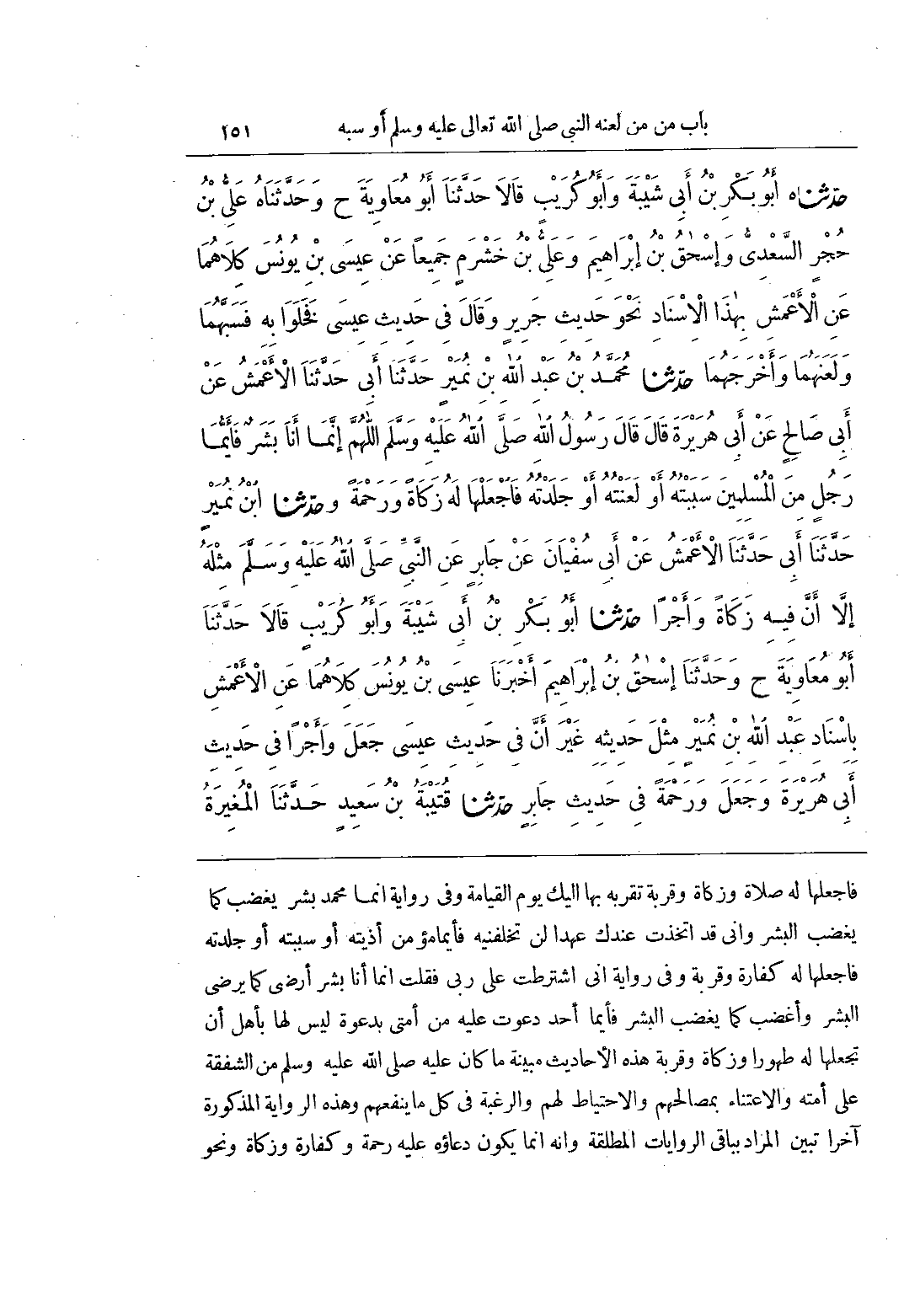 [2603] إِنِّي اشْتَرَطْتُ عَلَى رَبِّي فَقُلْتُ إِنَّمَا أَنَا بَشَرٌ أَرْضَى كَمَا يَرْضَى الْبَشَرُ وَأَغْضَبُ كَمَا يَغْضَبُ الْبَشَرُ فَأَيُّمَا أَحَدٍ دَعَوْتُ عَلَيْهِ مِنْ أُمَّتِي بِدَعْوَةٍ لَيْسَ لَهَا بِأَهْلٍ أَنْ تَجْعَلَهَا لَهُ طَهُورًا وَزَكَاةً وَقُرْبَةً هَذِهِ الْأَحَادِيثُ مُبَيِّنَةٌ مَا كَانَ عَلَيْهِ صَلَّى اللَّهُ عَلَيْهِ وَسَلَّمَ مِنَ الشَّفَقَةِ عَلَى أُمَّتِهِ وَالِاعْتِنَاءِ بِمَصَالِحِهِمْ وَالِاحْتِيَاطِ لَهُمْ وَالرَّغْبَةِ فِي كُلِّ مَا يَنْفَعُهُمْ وَهَذِهِ الرِّوَايَةُ الْمَذْكُورَةُ آخِرًا تُبَيِّنُ المراد بباقي الروايات الطلقة وَأَنَّهُ إِنَّمَا يَكُونُ دُعَاؤُهُ عَلَيْهِ رَحْمَةً وَكَفَّارَةً وزكاة ونحو