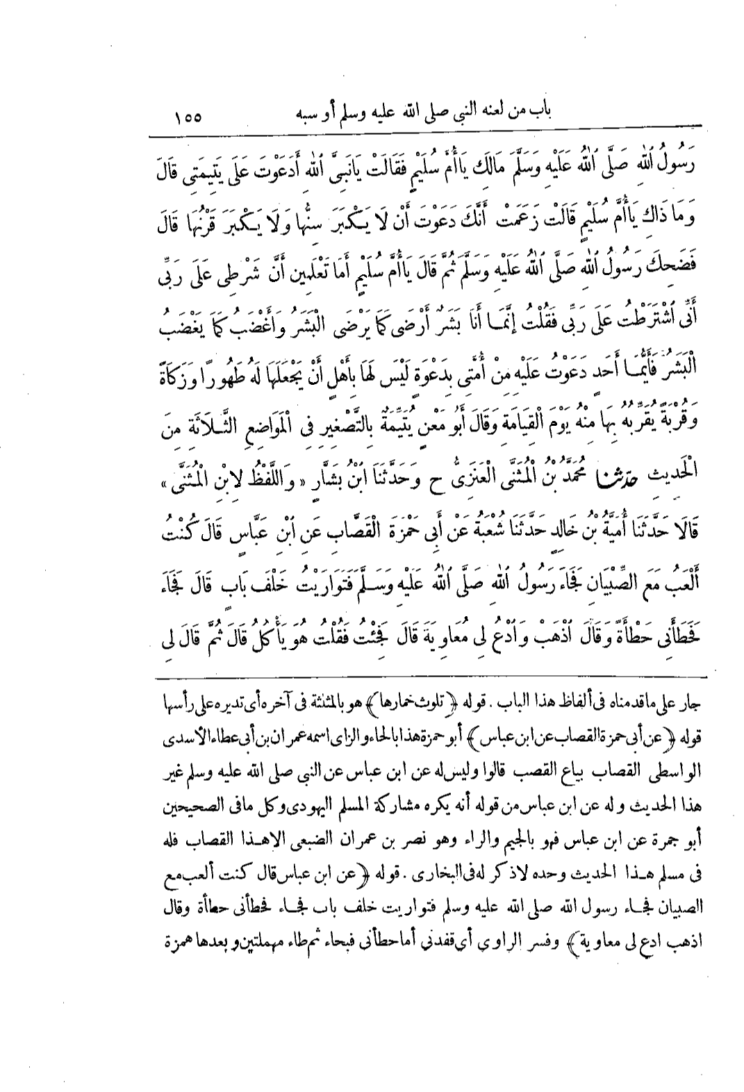 [2604] (عن بن عَبَّاسٍ قَالَ كُنْتُ أَلْعَبُ مَعَ الصِّبْيَانِ فَجَاءَ رَسُولُ اللَّهِ صَلَّى اللَّهُ عَلَيْهِ وَسَلَّمَ فَتَوَارَيْتُ خَلْفَ بَابٍ فَجَاءَ فَحَطَأَنِي حَطْأَةً وَقَالَ اذْهَبِ ادْعُ لِي مُعَاوِيَةَ) وَفَسَّرَ الرَّاوِي أَيْ قَفَدَنِي أَمَّا حَطَأَنِي فَبِحَاءٍ ثُمَّ طَاءٍ مُهْمَلَتَيْنِ وَبَعْدَهَا همزة