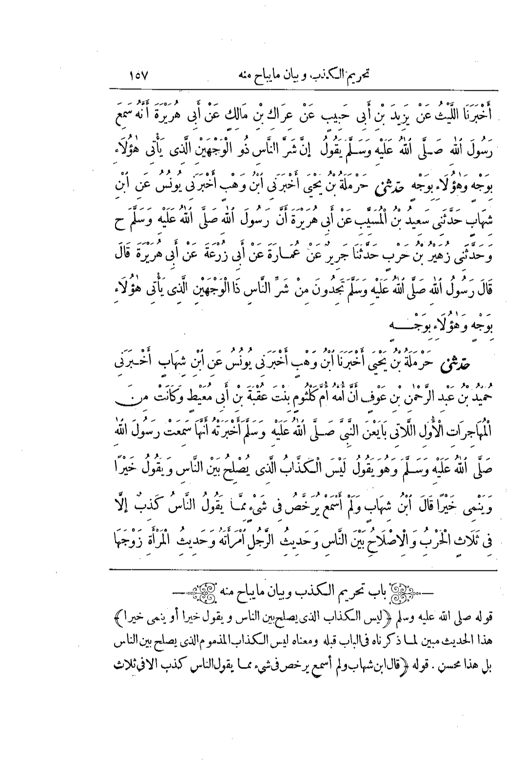 [2605] (لَيْسَ الْكَذَّابُ الَّذِي يُصْلِحُ بَيْنَ النَّاسِ وَيَقُولُ خَيْرًا أَوْ يُنْمِي خَيْرًا) هَذَا الْحَدِيثُ مُبَيِّنٌ لِمَا ذَكَرْنَاهُ فِي الْبَابِ قَبْلَهُ وَمَعْنَاهُ لَيْسَ الْكَذَّابُ الْمَذْمُومُ الَّذِي يُصْلِحُ بَيْنَ النَّاسِ بَلْ هَذَا مُحْسِنٌ قوله (قال بن شهاب ولم أسمع يرخص في شئ مِمَّا يَقُولُ النَّاسُ كَذِبٌ إِلَّا فِي ثَلَاثٍ)