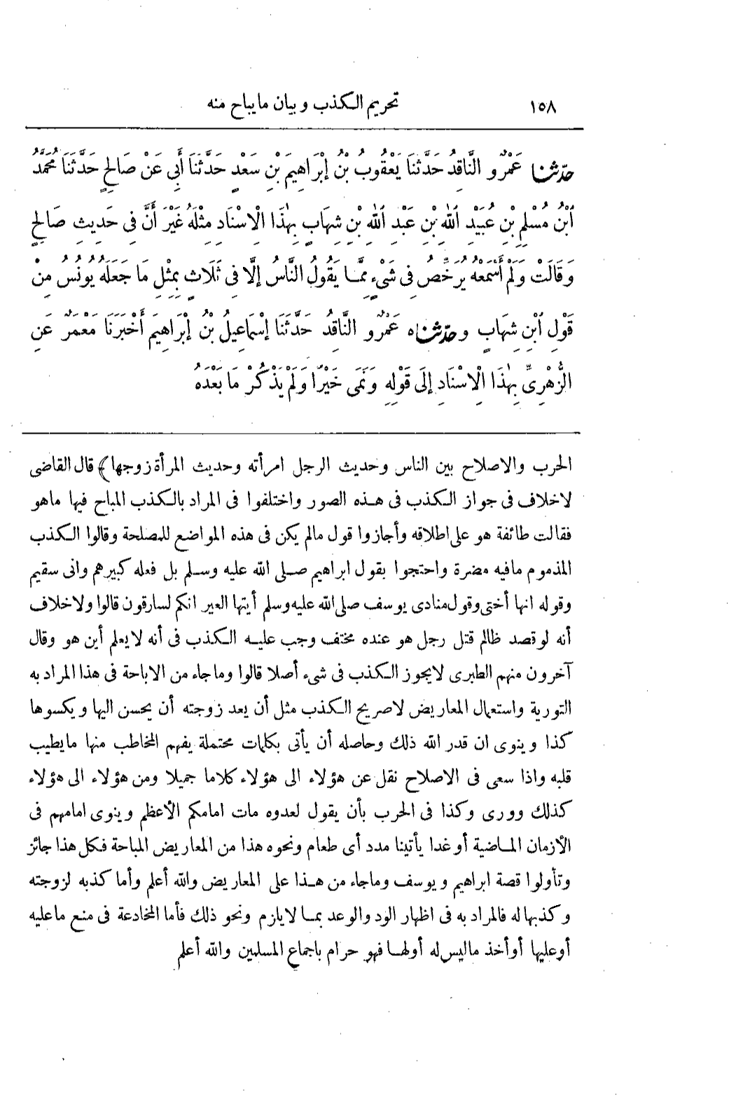 الْحَرْبُ وَالْإِصْلَاحُ بَيْنَ النَّاسِ وَحَدِيثُ الرَّجُلِ امْرَأَتَهُ وَحَدِيثُ الْمَرْأَةِ زَوْجَهَا) قَالَ الْقَاضِي لَا خِلَافَ فِي جَوَازِ الْكَذِبِ فِي هَذِهِ الصُّوَرِ وَاخْتَلَفُوا في المراد بالكذب المباح فيها ماهو فَقَالَتْ طَائِفَةٌ هُوَ عَلَى إِطْلَاقِهِ وَأَجَازُوا قَوْلَ مَا لَمْ يَكُنْ فِي هَذِهِ الْمَوَاضِعِ لِلْمَصْلَحَةِ وَقَالُوا الْكَذِبُ الْمَذْمُومُ مَا فِيهِ مَضَرَّةٌ وَاحْتَجُّوا بِقَوْلِ إِبْرَاهِيمَ صَلَّى اللَّهُ عَلَيْهِ وَسَلَّمَ بَلْ فعله كبيرهم وإني سقيم وَقَوْلُهُ إِنَّهَا أُخْتِي وَقَوْلُ مُنَادِي يُوسُفَ صَلَّى اللَّهُ عَلَيْهِ وَسَلَّمَ أَيَّتُهَا الْعِيرُ إِنَّكُمْ لَسَارِقُونَ قَالُوا وَلَا خِلَافَ أَنَّهُ لَوْ قَصَدَ ظَالِمٌ قَتْلَ رَجُلٍ هُوَ عِنْدَهُ مُخْتَفٍ وَجَبَ عَلَيْهِ الْكَذِبُ فِي أَنَّهُ لَا يَعْلَمُ أَيْنَ هُوَ وَقَالَ آخَرُونَ مِنْهُمُ الطَّبَرِيُّ لَا يَجُوزُ الْكَذِبُ في شئ أَصْلًا قَالُوا وَمَا جَاءَ مِنَ الْإِبَاحَةِ فِي هَذَا الْمُرَادُ بِهِ التَّوْرِيَةُ وَاسْتِعْمَالُ الْمَعَارِيضِ لَا صَرِيحُ الْكَذِبِ مِثْلَ أَنْ يَعِدَ زَوْجَتَهُ أَنْ يُحْسِنَ إِلَيْهَا وَيَكْسُوَهَا كَذَا وَيَنْوِي إِنْ قَدَّرَ اللَّهُ ذَلِكَ وَحَاصِلُهُ أَنْ يَأْتِي بِكَلِمَاتٍ مُحْتَمَلَةٍ يَفْهَمُ الْمُخَاطَبُ مِنْهَا مَا يُطَيِّبُ قَلْبَهُ وَإِذَا سَعَى فِي الْإِصْلَاحِ نَقَلَ عَنْ هَؤُلَاءِ إِلَى هَؤُلَاءِ كَلَامًا جَمِيلًا وَمِنْ هَؤُلَاءِ إِلَى هَؤُلَاءِ كَذَلِكَ وَوَرَّى وَكَذَا فِي الْحَرْبِ بِأَنْ يَقُولَ لِعَدُوِّهِ مَاتَ إِمَامُكُمُ الْأَعْظَمُ وَيَنْوِي إِمَامَهُمْ فِي الْأَزْمَانِ الْمَاضِيَةِ أَوْ غَدًا يَأْتِينَا مَدَدٌ أَيْ طَعَامٌ وَنَحْوُهُ هَذَا مِنَ الْمَعَارِيضِ الْمُبَاحَةِ فَكُلُّ هذا جائز وتأولوا قصة ابراهيم ويوسف وماجاء مِنْ هَذَا عَلَى الْمَعَارِيضِ وَاَللَّهُ أَعْلَمُ وَأَمَّا كَذِبُهُ لِزَوْجَتِهِ وَكَذِبُهَا لَهُ فَالْمُرَادُ بِهِ فِي إِظْهَارِ الْوُدِّ وَالْوَعْدِ بِمَا لَا يَلْزَمُ وَنَحْوُ ذَلِكَ فَأَمَّا الْمُخَادَعَةُ فِي مَنْعِ مَا عَلَيْهِ أو عليها أو أخذ ماليس لَهُ أَوْ لَهَا فَهُوَ حَرَامٌ بِإِجْمَاعِ الْمُسْلِمِينَ والله اعلم