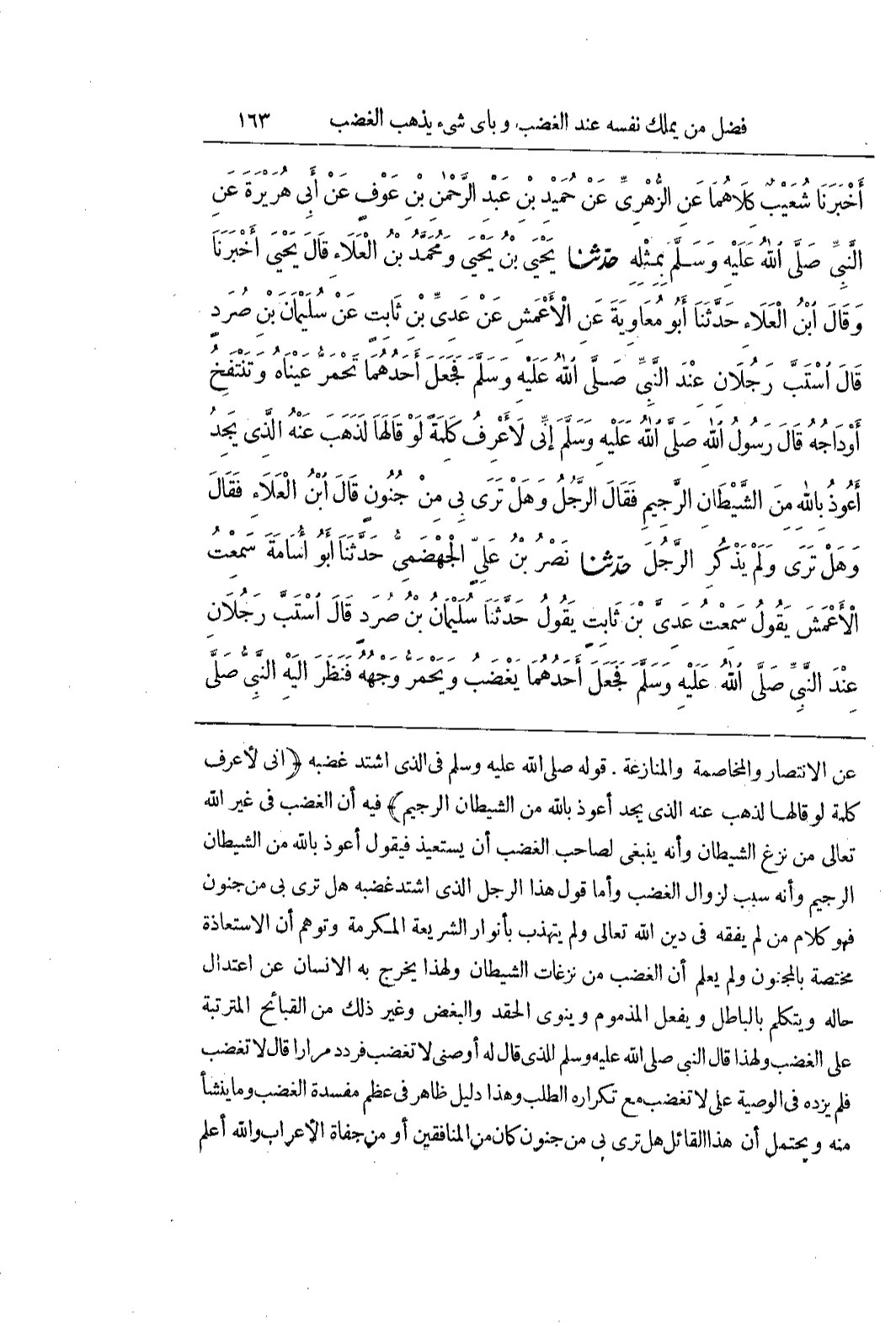 [2610] (إِنِّي لَأَعْرِفُ كَلِمَةً لَوْ قَالَهَا لَذَهَبَ عَنْهُ الَّذِي يَجِدُ أَعُوذُ بِاَللَّهِ مِنَ الشَّيْطَانِ الرَّجِيمِ) فِيهِ أَنَّ الْغَضَبَ فِي غَيْرِ اللَّهِ تَعَالَى مِنْ نَزْغِ الشَّيْطَانِ وَأَنَّهُ يَنْبَغِي لِصَاحِبِ الْغَضَبِ أَنْ يَسْتَعِيذَ فَيَقُولَ أَعُوذُ بِاَللَّهِ مِنَ الشَّيْطَانِ الرَّجِيمِ وَأَنَّهُ سَبَبٌ لِزَوَالِ الْغَضَبِ وَأَمَّا قَوْلُ هَذَا الرَّجُلِ الَّذِي اشْتَدَّ غَضَبُهُ هَلْ تَرَى بِي مِنْ جُنُونٍ فَهُوَ كَلَامُ مَنْ لَمْ يُفَقَّهْ فِي دِينِ اللَّهِ تَعَالَى وَلَمْ يَتَهَذَّبْ بِأَنْوَارِ الشَّرِيعَةِ الْمُكَرَّمَةِ وَتَوَهَّمَ أَنَّ الِاسْتِعَاذَةَ مُخْتَصَّةٌ بِالْمَجْنُونِ وَلَمْ يَعْلَمْ أَنَّ الْغَضَبَ مِنْ نَزَغَاتِ الشَّيْطَانِ وَلِهَذَا يَخْرُجُ بِهِ الْإِنْسَانُ عَنِ اعْتِدَالِ حَالِهِ وَيَتَكَلَّمُ بِالْبَاطِلِ وَيَفْعَلُ الْمَذْمُومَ وَيَنْوِي الْحِقْدَ وَالْبُغْضَ وَغَيْرَ ذَلِكَ مِنَ الْقَبَائِحِ الْمُتَرَتِّبَةِ عَلَى الْغَضَبِ وَلِهَذَا قَالَ النَّبِيُّ صَلَّى اللَّهُ عَلَيْهِ وَسَلَّمَ الَّذِي قال له أوصني لَا تَغْضَبْ فَرَدَّدَ مِرَارًا قَالَ لَا تَغْضَبْ فَلَمْ يَزِدْهُ فِي الْوَصِيَّةِ عَلَى لَا تَغْضَبْ مَعَ تَكْرَارِهِ الطَّلَبَ وَهَذَا دَلِيلٌ ظَاهِرٌ فِي عِظَمِ مَفْسَدَةِ الْغَضَبِ وَمَا يَنْشَأُ مِنْهُ وَيُحْتَمَلُ أَنَّ هَذَا الْقَائِلَ هَلْ تَرَى بِي مِنْ جُنُونٍ كَانَ مِنَ الْمُنَافِقِينَ أَوْ مِنْ جُفَاةِ الاعراب والله اعلم