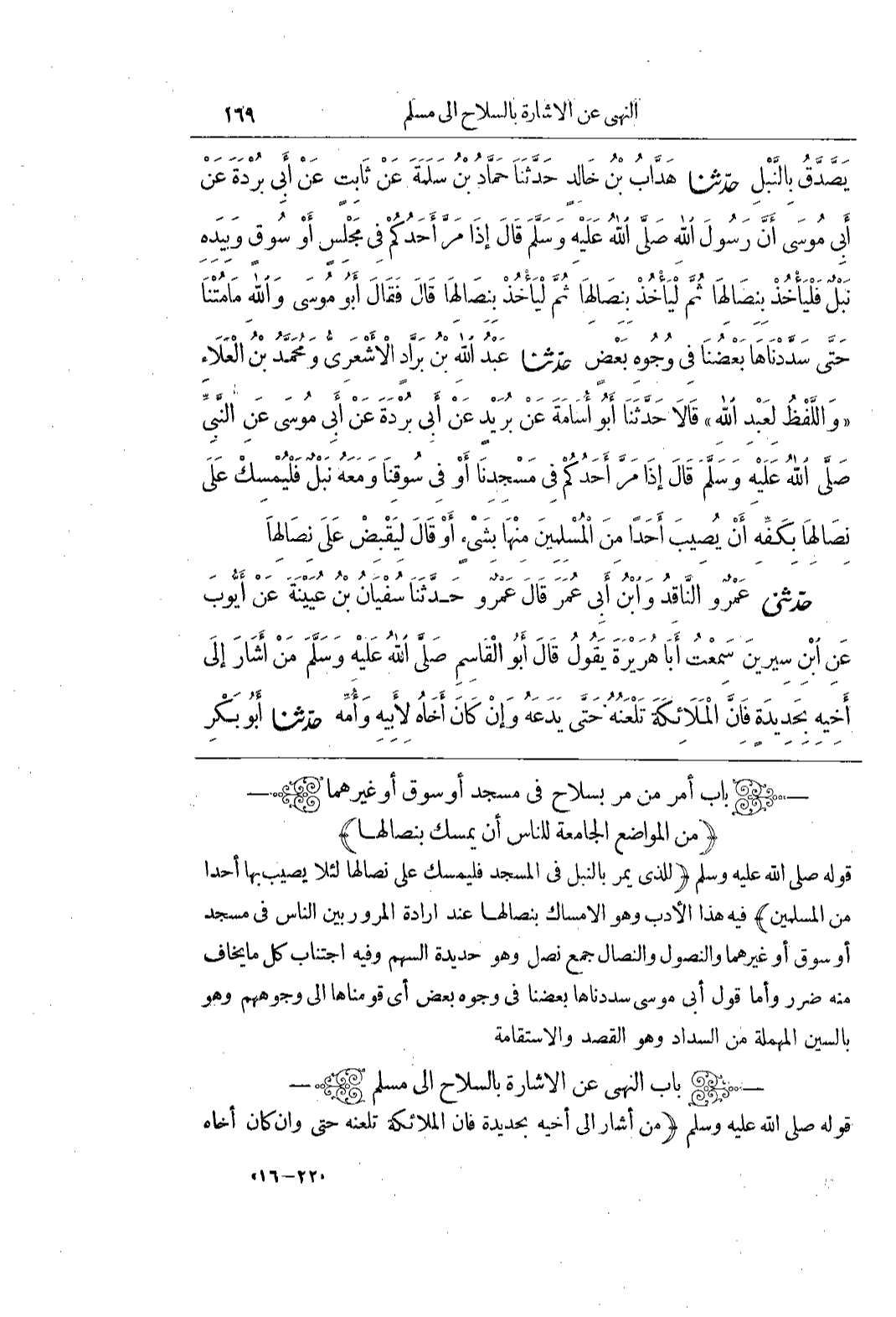 [2615] (لِلَّذِي يَمُرُّ بِالنَّبْلِ فِي الْمَسْجِدِ فَلْيُمْسِكْ عَلَى نِصَالِهَا لِئَلَّا يُصِيبَ بِهَا أَحَدًا مِنَ الْمُسْلِمِينَ) فِيهِ هَذَا الْأَدَبُ وَهُوَ الْإِمْسَاكُ بِنِصَالِهَا عِنْدَ إِرَادَةِ الْمُرُورِ بَيْنَ النَّاسِ فِي مَسْجِدٍ أَوْ سُوقٍ أَوْ غَيْرِهِمَا وَالنُّصُولُ وَالنِّصَالُ جَمْعُ نَصْلٍ وَهُوَ حَدِيدَةُ السَّهْمِ وَفِيهِ اجْتِنَابُ كُلِّ مَا يُخَافُ مِنْهُ ضَرَرٌ وَأَمَّا قَوْلُ أَبِي مُوسَى سَدَّدْنَاهَا بَعْضُنَا فِي وُجُوهِ بَعْضٍ أَيْ قَوَّمْنَاهَا إِلَى وُجُوهِهِمْ وَهُوَ بِالسِّينِ الْمُهْمَلَةِ مِنَ السَّدَادِ وَهُوَ الْقَصْدُ والاستقامة