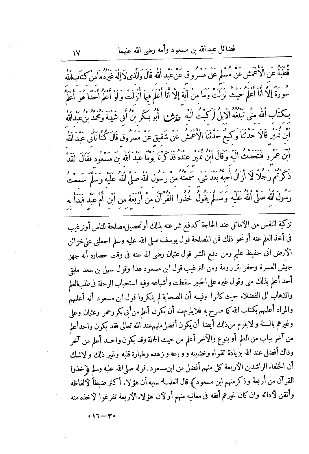 [2464] (خُذُوا القرآن من أربعة وذكر منهم بن مَسْعُودٍ) قَالَ الْعُلَمَاءُ سَبَبُهُ أَنَّ هَؤُلَاءِ أَكْثَرُ ضَبْطًا لِأَلْفَاظِهِ وَأَتْقَنُ لِأَدَائِهِ وَإِنْ كَانَ غَيْرُهُمْ أَفْقَهَ فِي مَعَانِيهِ مِنْهُمْ أَوْ لِأَنَّ هَؤُلَاءِ الْأَرْبَعَةُ تَفَرَّغُوا لِأَخْذِهِ مِنْهُ
