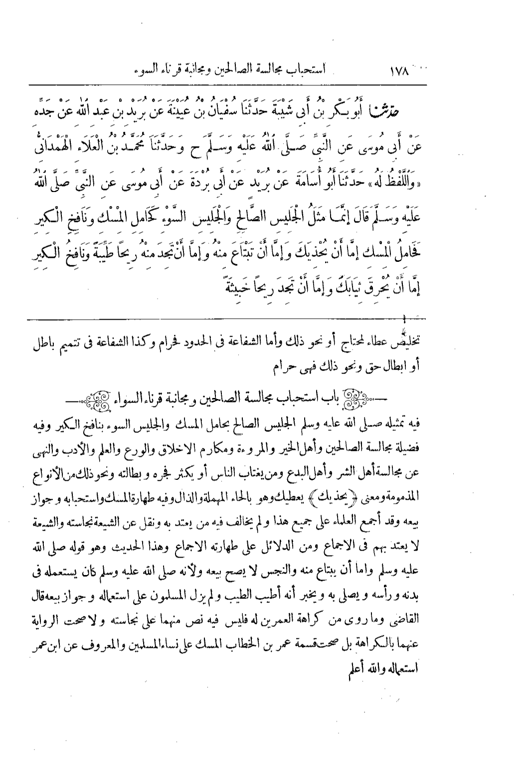 [2628] صَلَّى اللَّهُ عَلَيْهِ وَسَلَّمَ الْجَلِيسَ الصَّالِحَ بِحَامِلِ الْمِسْكِ وَالْجَلِيسَ السُّوءِ بِنَافِخِ الْكِيرِ وَفِيهِ فَضِيلَةُ مُجَالَسَةِ الصَّالِحِينَ وَأَهْلِ الْخَيْرِ وَالْمُرُوءَةِ وَمَكَارِمِ الْأَخْلَاقِ وَالْوَرَعِ وَالْعِلْمِ وَالْأَدَبِ وَالنَّهْيُ عَنْ مُجَالَسَةِ أَهْلِ الشَّرِّ وَأَهْلِ الْبِدَعِ وَمَنْ يَغْتَابُ النَّاسَ أَوْ يَكْثُرُ فُجْرُهُ وَبَطَالَتُهُ وَنَحْوُ ذَلِكَ مِنَ الْأَنْوَاعِ الْمَذْمُومَةِ وَمَعْنَى (يُحْذِيَكَ) يُعْطِيكَ وَهُوَ بِالْحَاءِ الْمُهْمَلَةِ وَالذَّالِ وَفِيهِ طَهَارَةُ الْمِسْكِ وَاسْتِحْبَابِهِ وَجَوَازُ بَيْعِهِ وَقَدْ أَجْمَعَ الْعُلَمَاءُ عَلَى جَمِيعِ هَذَا وَلَمْ يُخَالِفْ فِيهِ مَنْ يُعْتَدُّ بِهِ وَنُقِلَ عَنِ الشِّيعَةِ نَجَاسَتُهُ وَالشِّيعَةُ لَا يُعْتَدُّ بِهِمْ فِي الْإِجْمَاعِ وَمِنَ الدَّلَائِلِ عَلَى طَهَارَتِهِ الْإِجْمَاعُ وَهَذَا الْحَدِيثُ وَهُوَ قَوْلُهُ صَلَّى اللَّهُ عليه وسلم واما أن يبتاع مِنْهُ وَالنَّجَسُ لَا يَصِحُّ بَيْعُهُ وَلِأَنَّهُ صَلَّى اللَّهُ عَلَيْهِ وَسَلَّمَ كَانَ يَسْتَعْمِلُهُ فِي بَدَنِهِ وَرَأْسِهِ وَيُصَلِّي بِهِ وَيُخْبِرُ أَنَّهُ أَطْيَبُ الطِّيبِ ولم يَزَلِ الْمُسْلِمُونَ عَلَى اسْتِعْمَالِهِ وَجَوَازِ بَيْعِهِ قَالَ الْقَاضِي وَمَا رُوِيَ مِنْ كَرَاهَةِ الْعُمَرَيْنِ لَهُ فَلَيْسَ فِيهِ نَصٌّ مِنْهُمَا عَلَى نَجَاسَتِهِ وَلَا صَحَّتِ الرِّوَايَةُ عَنْهُمَا بِالْكَرَاهَةِ بَلْ صَحَّتْ قِسْمَةُ عُمَرَ بْنِ الْخَطَّابِ الْمِسْكَ عَلَى نِسَاءِ الْمُسْلِمِينَ والمعروف عن بن عُمَرَ اسْتِعْمَالُهُ وَاَللَّهُ أَعْلَمُ
