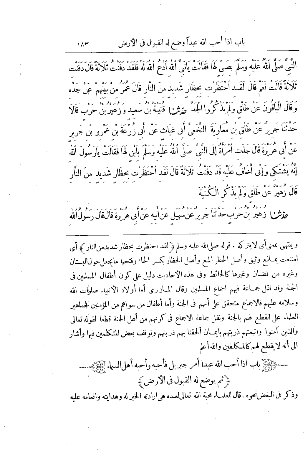 [2636] (لَقَدْ احْتَظَرْتِ بِحِظَارٍ شَدِيدٍ مِنَ النَّارِ) أَيْ امْتَنَعْتِ بِمَانِعٍ وَثِيقٍ وَأَصْلُ الْحَظْرِ الْمَنْعُ وَأَصْلُ الْحِظَارِ بِكَسْرِ الْحَاءِ وَفَتْحِهَا مَا يُجْعَلُ حَوْلَ الْبُسْتَانِ وَغَيْرِهِ مِنْ قُضْبَانٍ وغيرها كالحائط وفي هَذِهِ الْأَحَادِيثِ دَلِيلٌ عَلَى كَوْنِ أَطْفَالِ الْمُسْلِمِينَ فِي الْجَنَّةِ وَقَدْ نَقَلَ جَمَاعَةٌ فِيهِمْ إِجْمَاعَ الْمُسْلِمِينَ وَقَالَ الْمَازِرِيُّ أَمَّا أَوْلَادُ الْأَنْبِيَاءِ صَلَوَاتُ اللَّهِ وَسَلَامُهُ عَلَيْهِمْ فَالْإِجْمَاعُ مُتَحَقِّقٌ عَلَى أَنَّهُمْ في الجنة واما أَطْفَالُ مَنْ سِوَاهُمْ مِنْ الْمُؤْمِنِينَ فَجَمَاهِيرُ الْعُلَمَاءِ عَلَى الْقَطْعِ لَهُمْ بِالْجَنَّةِ وَنَقَلَ جَمَاعَةٌ الْإِجْمَاعَ فِي كَوْنِهِمْ مِنْ أَهْلِ الْجَنَّةِ قَطْعًا لِقَوْلِهِ تَعَالَى وَاَلَّذِينَ آمَنُوا وَاتَّبَعَتْهُمْ ذُرِّيَّتُهُمْ بِإِيمَانٍ أَلْحَقْنَا بهم ذريتهم وَتَوَقَّفَ بَعْضُ الْمُتَكَلِّمِينِ فِيهَا وَأَشَارَ إِلَى أَنَّهُ لَا يُقْطَعُ لَهُمْ كَالْمُكَلَّفِينَ وَاَللَّهُ أَعْلَمُ