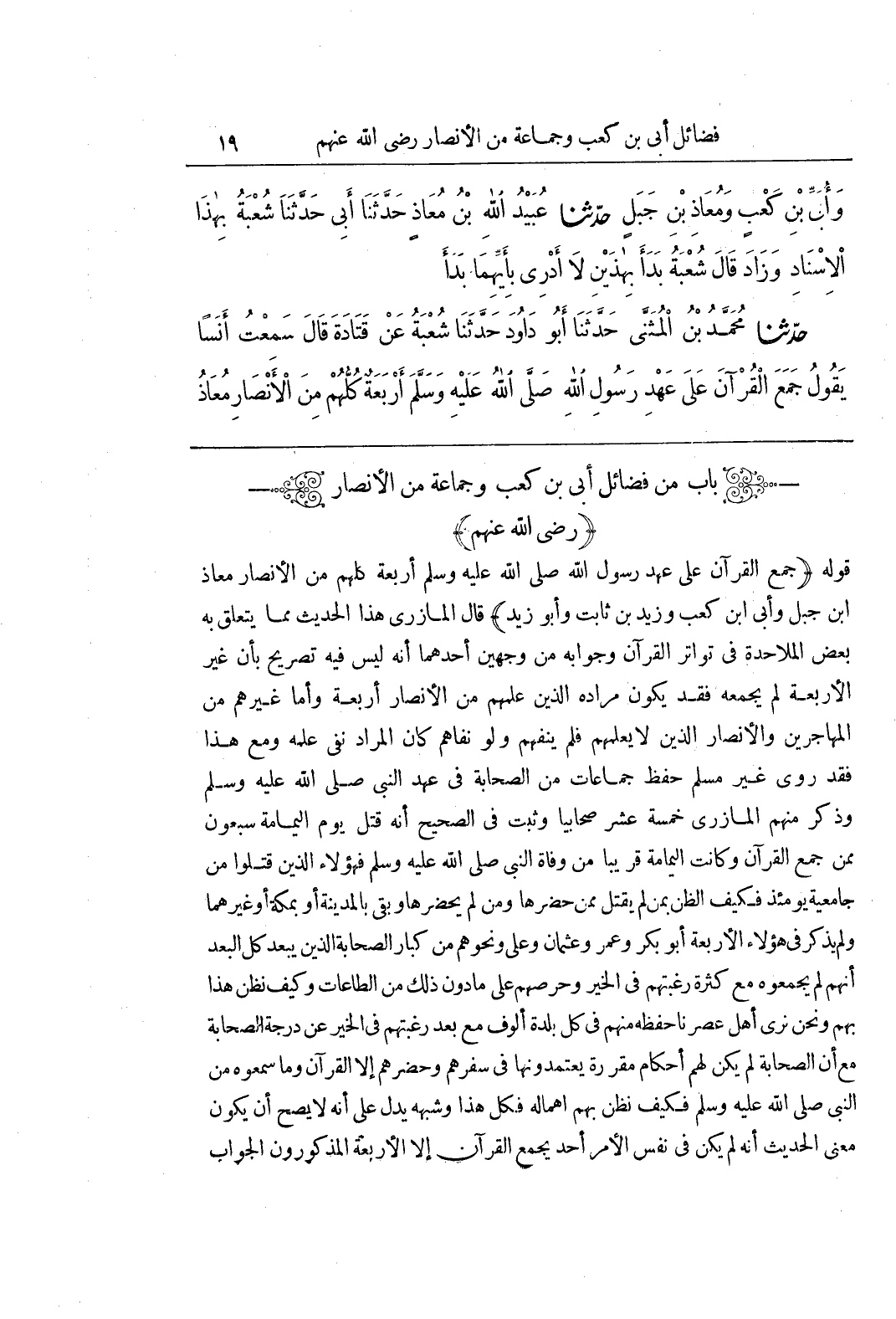 [2465] (جَمَعَ الْقُرْآنَ عَلَى عَهْدِ رَسُولِ اللَّهِ صَلَّى اللَّهُ عَلَيْهِ وَسَلَّمَ أَرْبَعَةٌ كُلُّهُمْ مِنَ الْأَنْصَارِ مُعَاذُ بْنُ جَبَلٍ وَأُبِيُّ بْنُ كَعْبٍ وَزَيْدُ بْنُ ثَابِتٍ وَأَبُو زَيْدٍ) قَالَ الْمَازِرِيُّ هَذَا الْحَدِيثُ مِمَّا يَتَعَلَّقُ بِهِ بَعْضُ الْمَلَاحِدَةِ فِي تَوَاتُرِ الْقُرْآنِ وَجَوَابُهُ مِنْ وَجْهَيْنِ أَحَدُهُمَا أَنَّهُ لَيْسَ فِيهِ تَصْرِيحٌ بِأَنَّ غَيْرَ الْأَرْبَعَةِ لَمْ يَجْمَعْهُ فَقَدْ يَكُونُ مُرَادُهُ الَّذِينَ عَلِمَهُمْ مِنَ الْأَنْصَارِ أَرْبَعَةٌ وَأَمَّا غَيْرُهُمْ مِنَ الْمُهَاجِرِينَ وَالْأَنْصَارِ الَّذِينَ لَا يَعْلَمُهُمْ فَلَمْ يَنْفِهِمْ وَلَوْ نَفَاهُمْ كَانَ الْمُرَادُ نَفْيَ عِلْمِهِ وَمَعَ هَذَا فَقَدْ رَوَى غَيْرُ مُسْلِمٍ حِفْظَ جَمَاعَاتٍ مِنَ الصَّحَابَةِ فِي عَهْدِ النَّبِيِّ صَلَّى اللَّهُ عَلَيْهِ وَسَلَّمَ وَذَكَرَ مِنْهُمُ الْمَازِرِيُّ خَمْسَةَ عَشَرَ صَحَابِيًّا وَثَبَتَ فِي الصَّحِيحِ أَنَّهُ قُتِلَ يَوْمَ الْيَمَامَةِ سَبْعُونَ مِمَّنْ جَمَعَ الْقُرْآنَ وَكَانَتِ الْيَمَامَةُ قَرِيبًا مِنْ وَفَاةِ النَّبِيِّ صَلَّى اللَّهُ عَلَيْهِ وَسَلَّمَ فَهَؤُلَاءِ الَّذِينَ قُتِلُوا مِنْ جَامِعِيهِ يَوْمئِذٍ فَكَيْفَ الظَّنُّ بِمَنْ لَمْ يُقْتَلْ مِمَّنْ حَضَرَهَا وَمَنْ لَمْ يَحْضُرْهَا وَبَقِيَ بِالْمَدِينَةِ أَوْ بِمَكَّةَ أَوْ غَيْرِهِمَا وَلَمْ يُذْكَرْ فِي هَؤُلَاءِ الْأَرْبَعَةِ أَبُو بَكْرٍ وَعُمَرُ وَعُثْمَانُ وَعَلِيٌّ وَنَحْوُهُمْ مِنْ كِبَارِ الصَّحَابَةِ الَّذِينَ يَبْعُدُ كُلُّ الْبُعْدِ أَنَّهُمْ لَمْ يَجْمَعُوهُ مَعَ كَثْرَةِ رَغْبَتِهِمْ فِي الْخَيْرِ وَحِرْصِهِمْ عَلَى مَا دُونَ ذَلِكَ مِنَ الطَّاعَاتِ وَكَيْفَ نَظُنُّ هَذَا بِهِمْ وَنَحْنُ نَرَى أَهْلَ عَصْرِنَا حَفِظَهُ مِنْهُمْ فِي كُلِّ بَلْدَةٍ أُلُوفٌ مَعَ بُعْدِ رَغْبَتِهِمْ فِي الْخَيْرِ عَنْ دَرَجَةِ الصَّحَابَةِ مَعَ أَنَّ الصَّحَابَةَ لَمْ يَكُنْ لَهُمْ أَحْكَامٌ مُقَرَّرَةٌ يَعْتَمِدُونَهَا فِي سَفَرِهِمْ وَحَضَرِهِمْ إِلَّا الْقُرْآنَ وَمَا سَمِعُوهُ مِنَ النَّبِيِّ صَلَّى اللَّهُ عَلَيْهِ وَسَلَّمَ فَكَيْفَ نَظُنُّ بِهِمْ إِهْمَالِهِ فَكُلُّ هَذَا وَشِبْهُهُ يَدُلُّ عَلَى أَنَّهُ لَا يَصِحُّ أَنْ يَكُونَ مَعْنَى الْحَدِيثِ أَنَّهُ لَمْ يَكُنْ فِي نَفْسِ الْأَمْرِ أَحَدٌ يَجْمَعُ الْقُرْآنَ إِلَّا الْأَرْبَعَةُ الْمَذْكُورُونَ الْجَوَابُ