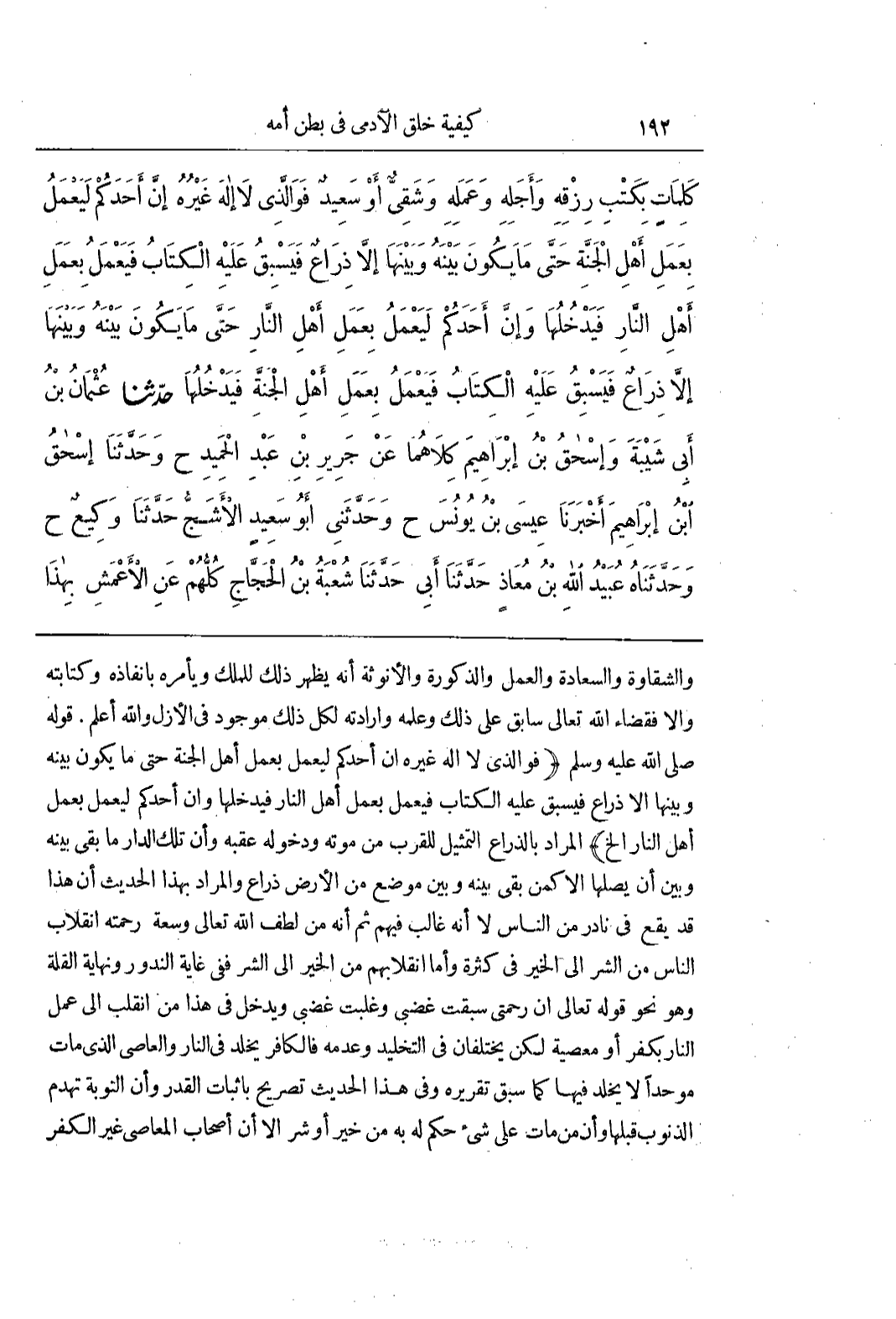 وَالشَّقَاوَةِ وَالسَّعَادَةِ وَالْعَمَلِ وَالذُّكُورَةِ وَالْأُنُوثَةِ أَنَّهُ يُظْهِرُ ذَلِكَ لِلْمَلَكِ وَيَأْمُرُهُ بِإِنْفَاذِهِ وَكِتَابَتِهِ وَإِلَّا فَقَضَاءُ اللَّهِ تَعَالَى سَابِقٌ عَلَى ذَلِكَ وَعِلْمُهُ وَإِرَادَتُهُ لِكُلِّ ذَلِكَ مَوْجُودٌ فِي الْأَزَلِ وَاللَّهُ أَعْلَمُ قَوْلُهُ صَلَّى اللَّهُ عَلَيْهِ وَسَلَّمَ (فَوَاَلَّذِي لَا إِلَهَ غَيْرُهُ إِنَّ أَحَدَكُمْ لَيَعْمَلُ بِعَمَلِ أَهْلِ الْجَنَّةِ حَتَّى مَا يَكُونُ بَيْنَهُ وَبَيْنَهَا إِلَّا ذِرَاعٌ فَيَسْبِقُ عَلَيْهِ الْكِتَابُ فَيَعْمَلُ بِعَمَلِ أَهْلِ النَّارِ فَيَدْخُلُهَا وَإِنَّ أَحَدَكُمْ لَيَعْمَلُ بِعَمَلِ أَهْلِ النَّارِ إِلَخْ) الْمُرَادُ بِالذِّرَاعِ التَّمْثِيلُ لِلْقُرْبِ مِنْ مَوْتِهِ وَدُخُولِهِ عَقِبَهُ وَأَنَّ تِلْكَ الدَّارُ مَا بَقِيَ بَيْنَهُ وَبَيْنَ أَنْ يَصِلَهَا إِلَّا كَمَنْ بَقِيَ بَيْنَهُ وَبَيْنَ مَوْضِعٍ مِنَ الْأَرْضِ ذِرَاعٌ وَالْمُرَادُ بِهَذَا الْحَدِيثِ أَنَّ هَذَا قَدْ يَقَعُ فِي نَادِرٍ مِنَ النَّاسِ لَا أَنَّهُ غَالِبٌ فِيهِمْ ثُمَّ أَنَّهُ مِنْ لُطْفِ اللَّهِ تَعَالَى وَسَعَةِ رَحْمَتِهِ انْقِلَابُ النَّاسِ مِنَ الشَّرِّ إِلَى الْخَيْرِ فِي كَثْرَةٍ وَأَمَّا انْقِلَابُهُمْ مِنَ الْخَيْرِ إِلَى الشَّرِّ فَفِي غَايَةِ النُّدُورِ وَنِهَايَةِ الْقِلَّةِ وَهُوَ نَحْوَ قَوْلِهِ تَعَالَى إِنَّ رَحْمَتِي سَبَقَتْ غَضَبِي وَغَلَبَتْ غَضَبِي وَيَدْخُلُ فِي هَذَا مَنِ انْقَلَبَ إِلَى عَمَلِ النَّارِ بِكُفْرٍ أَوْ مَعْصِيَةٍ لَكِنْ يَخْتَلِفَانِ فِي التَّخْلِيدِ وَعَدَمِهِ فَالْكَافِرُ يُخَلَّدُ فِي النَّارِ وَالْعَاصِي الَّذِي مَاتَ مُوَحِّدًا لَا يُخَلَّدُ فِيهَا كَمَا سَبَقَ تَقْرِيرُهُ وَفِي هَذَا الْحَدِيثِ تَصْرِيحٌ بِإِثْبَاتِ الْقَدَرِ وَأَنَّ التَّوْبَةَ تَهْدِمُ الذنوب قبلها وأن من مات على شئ حُكِمَ لَهُ بِهِ مِنْ خَيْرٍ أَوْ شَرٍّ إِلَّا أَنَّ أَصْحَابَ الْمَعَاصِي غَيْرَ الْكُفْرِ