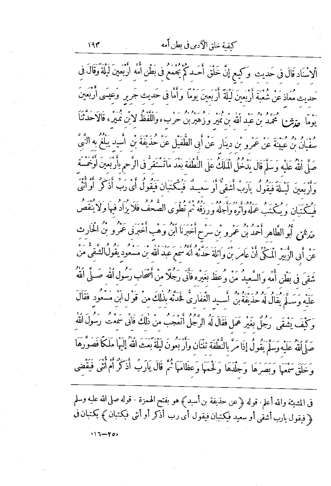 [2644] (عَنْ حُذَيْفَةَ بْنِ أَسِيدٍ) هُوَ بِفَتْحِ الْهَمْزَةِ قَوْلُهُ صَلَّى الله عليه وسلم (فيقول يارب أَشَقِيٌّ أَوْ سَعِيدٌ فَيُكْتَبَانِ فَيَقُولُ أَيْ رَبِّ أَذَكَرٌ أَوْ أُنْثَى فَيُكْتَبَانِ) يُكْتَبَانِ فِي