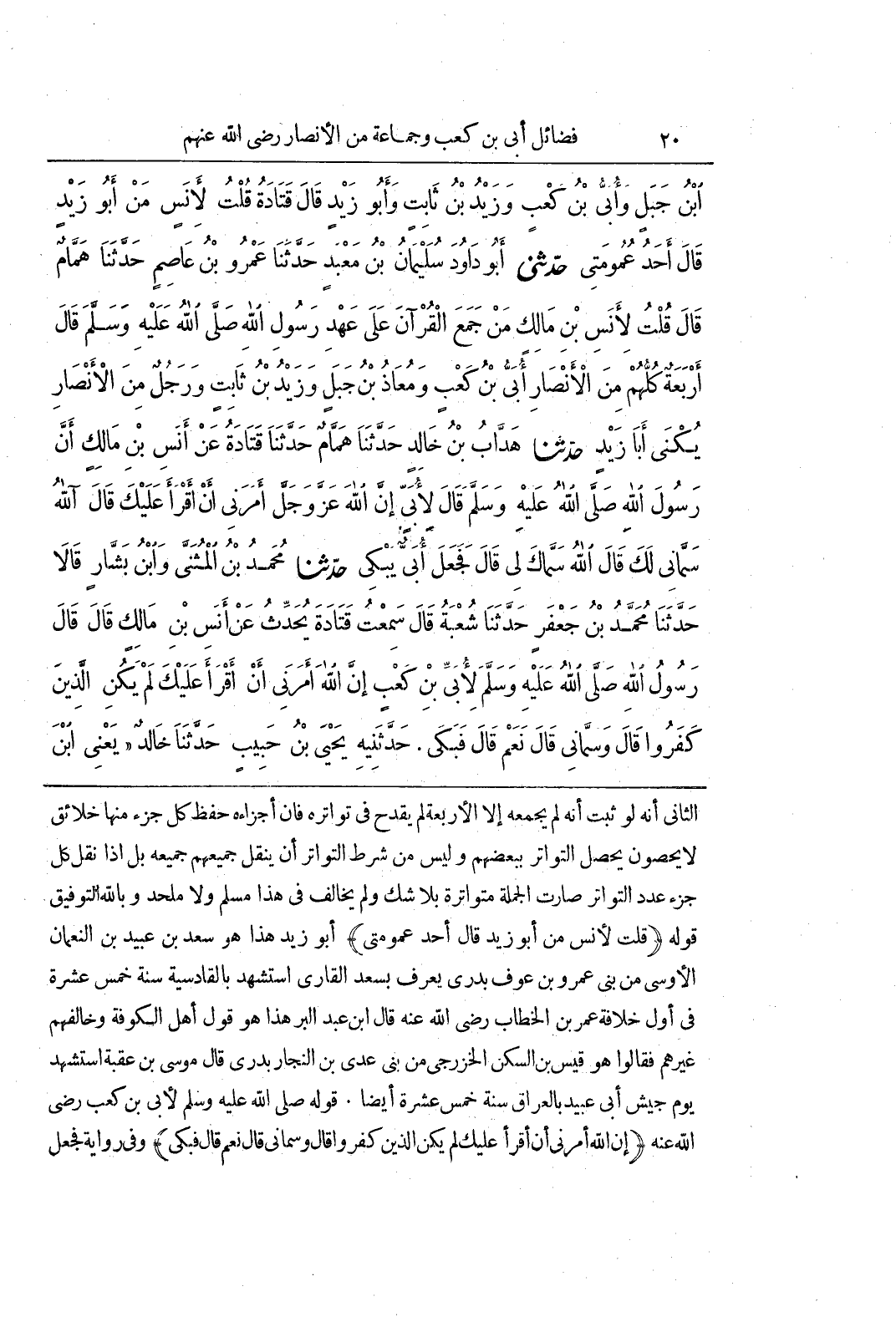 الثَّانِي أَنَّهُ لَوْ ثَبَتَ أَنَّهُ لَمْ يَجْمَعْهُ إِلَّا الْأَرْبَعَةُ لَمْ يَقْدَحْ فِي تَوَاتُرِهِ فَإِنَّ أَجْزَاءَهُ حَفِظَ كُلَّ جُزْءٍ مِنْهَا خَلَائِقُ لَا يُحْصَوْنَ يَحْصُلُ التَّوَاتُرُ بِبَعْضِهِمْ وَلَيْسَ مِنْ شَرْطِ التَّوَاتُرِ أَنْ يَنْقُلَ جَمِيعُهُمْ جَمِيعَهُ بَلْ إِذَا نَقَلَ كُلَّ جُزْءٍ عَدَدُ التَّوَاتُرِ صَارَتِ الْجُمْلَةُ مُتَوَاتِرَةً بِلَا شَكٍّ وَلَمْ يُخَالِفْ فِي هَذَا مُسْلِمٌ وَلَا مُلْحِدٌ وَبِاَللَّهِ التَّوْفِيقُ قَوْلُهُ (قُلْتُ لِأَنَسٍ مَنْ أَبُو زَيْدٍ قَالَ أَحَدُ عُمُومَتِي) أبوزيد هَذَا هُوَ سَعْدُ بْنُ عُبَيْدِ بْنِ النُّعْمَانَ الْأَوْسِيُّ مِنْ بَنِي عَمْرِو بْنِ عَوْفٍ بَدْرِيٌّ يعرف بسعد القارىء اسْتُشْهِدَ بِالْقَادِسِيَّةِ سَنَةَ خَمْسَ عَشْرَةَ فِي أَوَّلِ خِلَافَةِ عُمَرَ بْنِ الْخَطَّابِ رَضِيَ اللَّهُ عَنْهُ قال بن عَبْدِ الْبَرِّ هَذَا هُوَ قَوْلُ أَهْلِ الْكُوفَةِ وَخَالَفَهُمْ غَيْرُهُمْ فَقَالُوا هُوَ قَيْسُ بْنُ السَّكَنِ الْخَزْرَجِيُّ مِنْ بَنِي عَدِيِّ بْنِ النَّجَّارِ بَدْرِيٌّ قَالَ مُوسَى بْنُ عُقْبَةَ اسْتُشْهِدَ يَوْمَ جَيْشِ أَبِي عُبَيْدٍ بِالْعِرَاقِ سَنَةَ خَمْسَ عَشْرَةَ أَيْضًا قَوْلُهُ صَلَّى اللَّهُ عَلَيْهِ وَسَلَّمَ لِأُبَيِّ بْنِ كَعْبٍ رَضِيَ اللَّهُ عَنْهُ